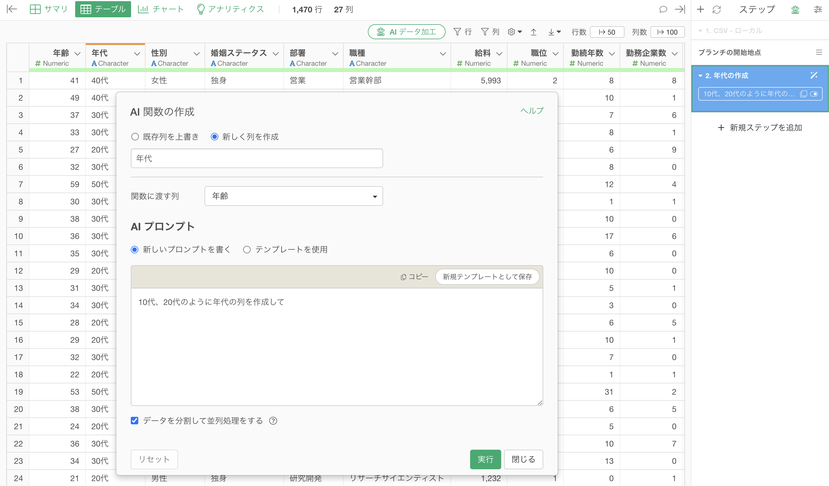 このようなケースでも、AI 関数でも年代の列を作成することは可能です。