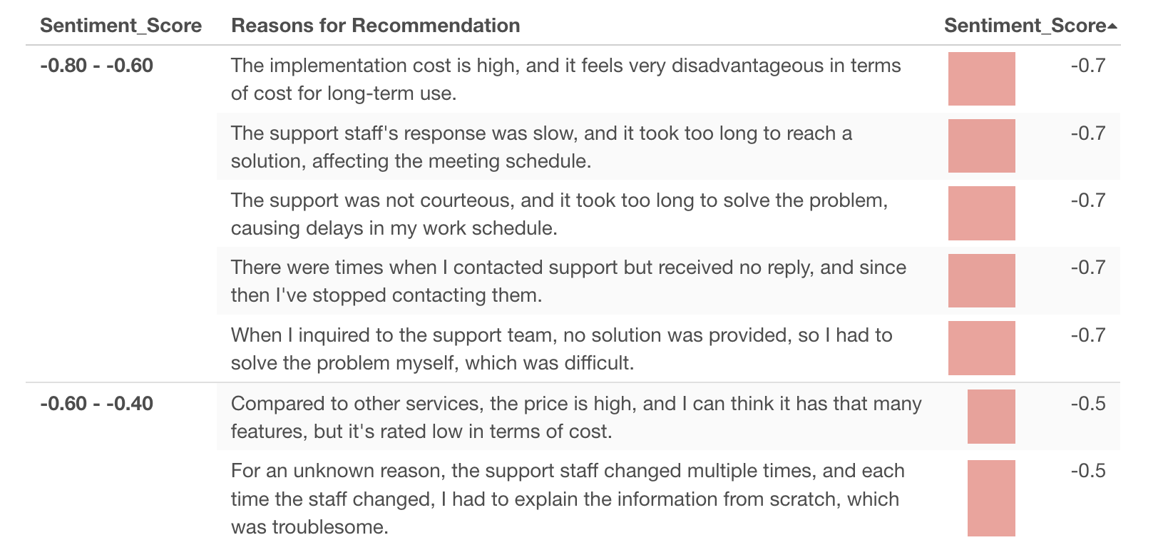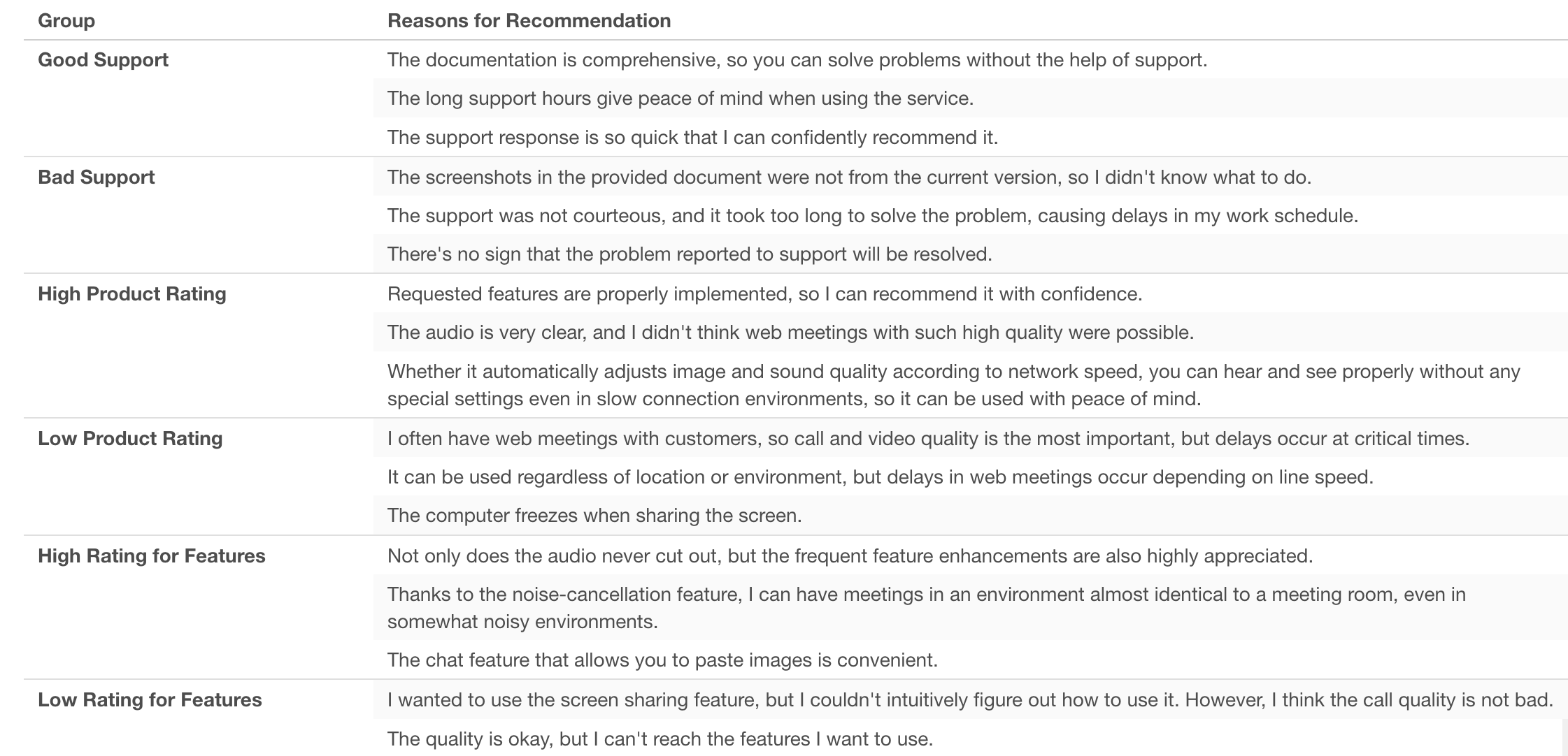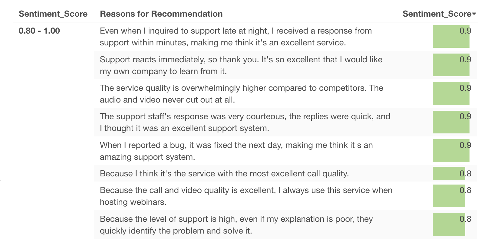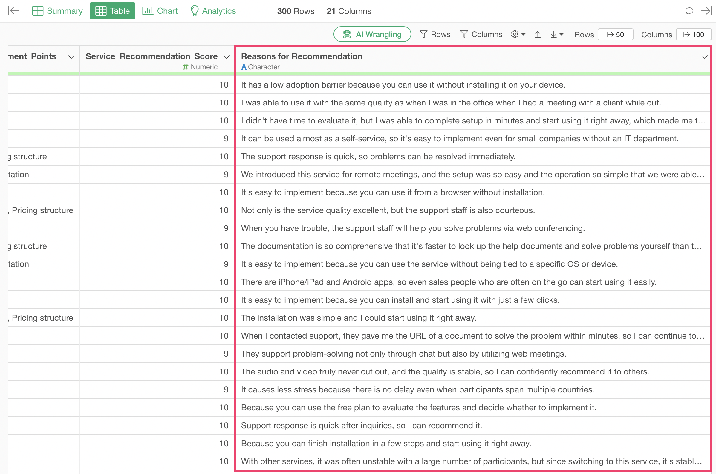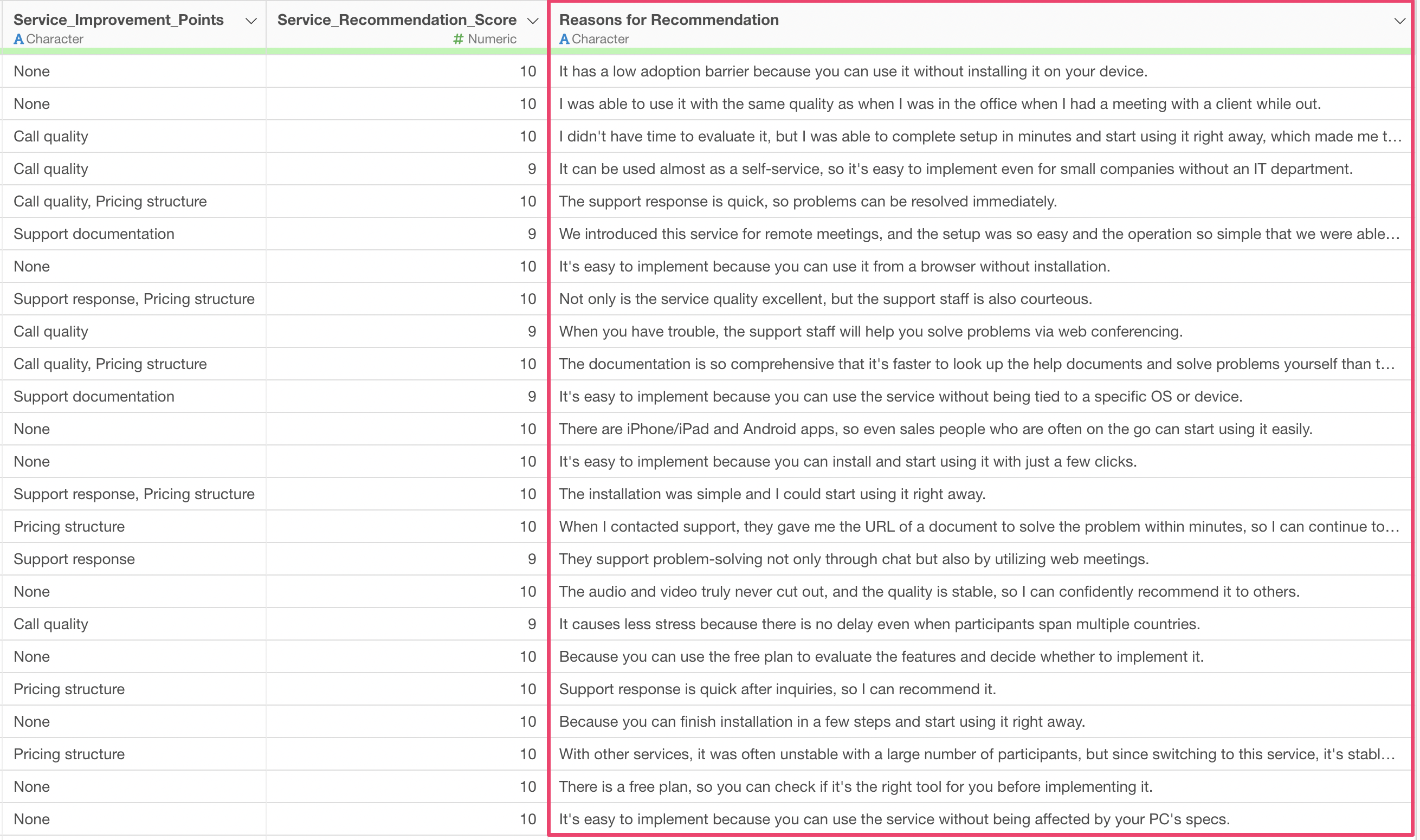 For example, in the survey data below, there’s a column for free-text responses such as “Reasons for recommendation.”