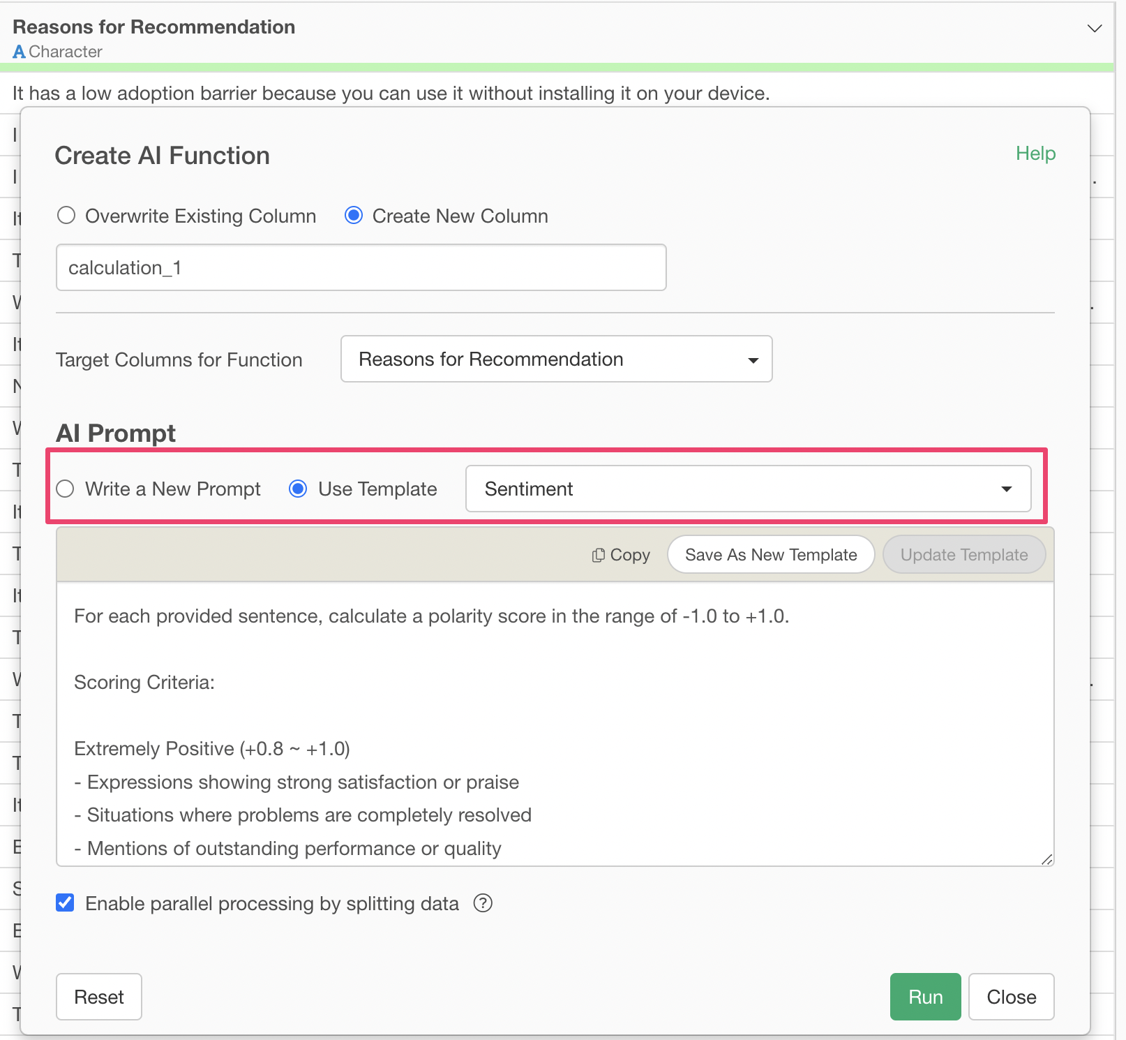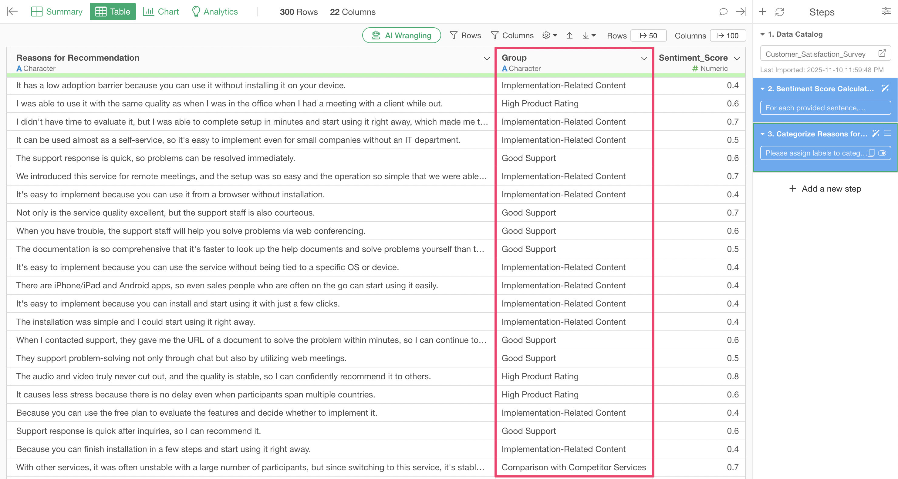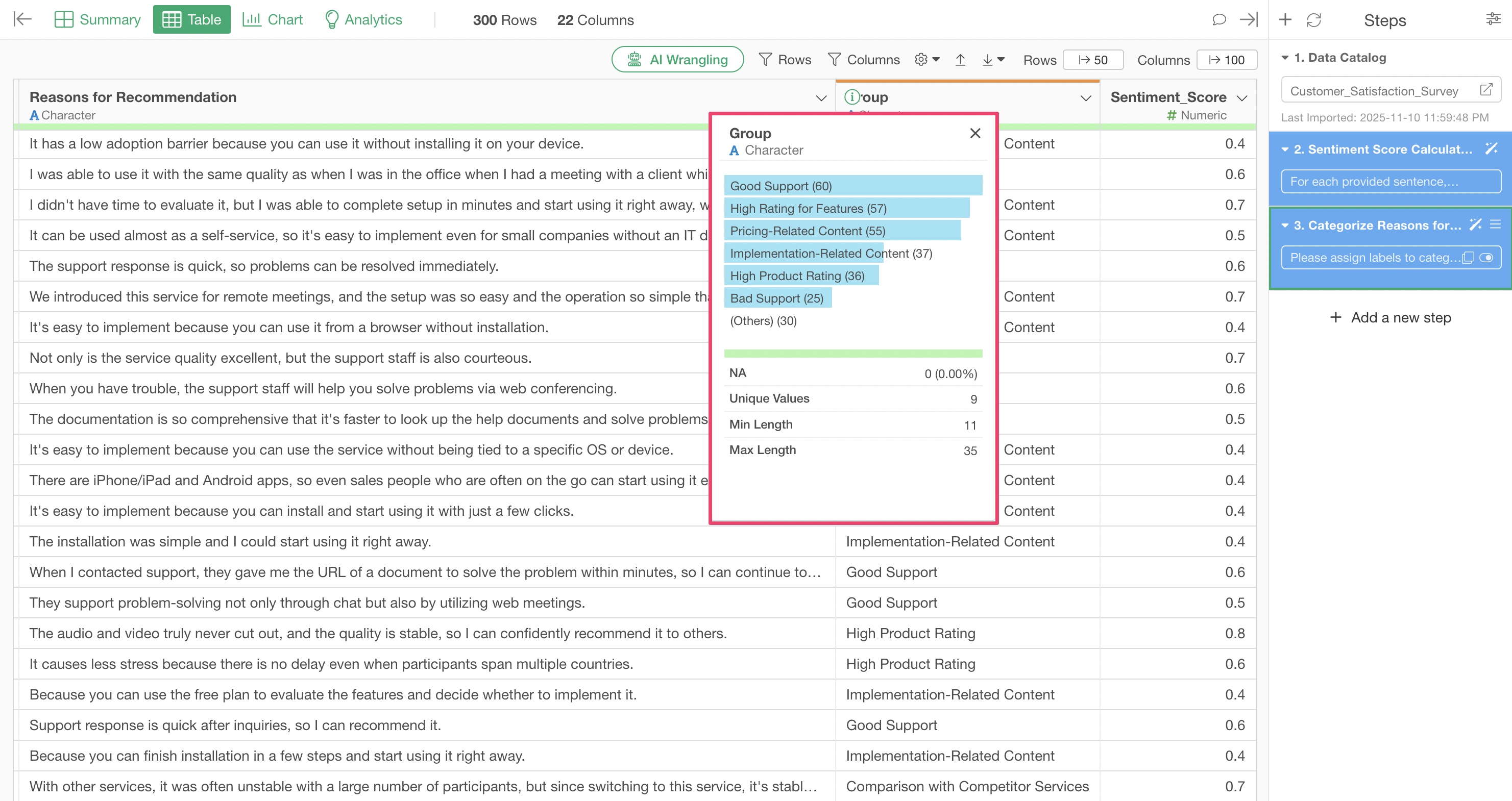 The “AI Functions” added in Exploratory v14 enable users without programming skills to perform complex calculations and data analysis using AI. This feature facilitates information generation from customer data, automatic creation of campaign emails based on purchase history, categorization of survey free responses, sentiment analysis, and labeling.
