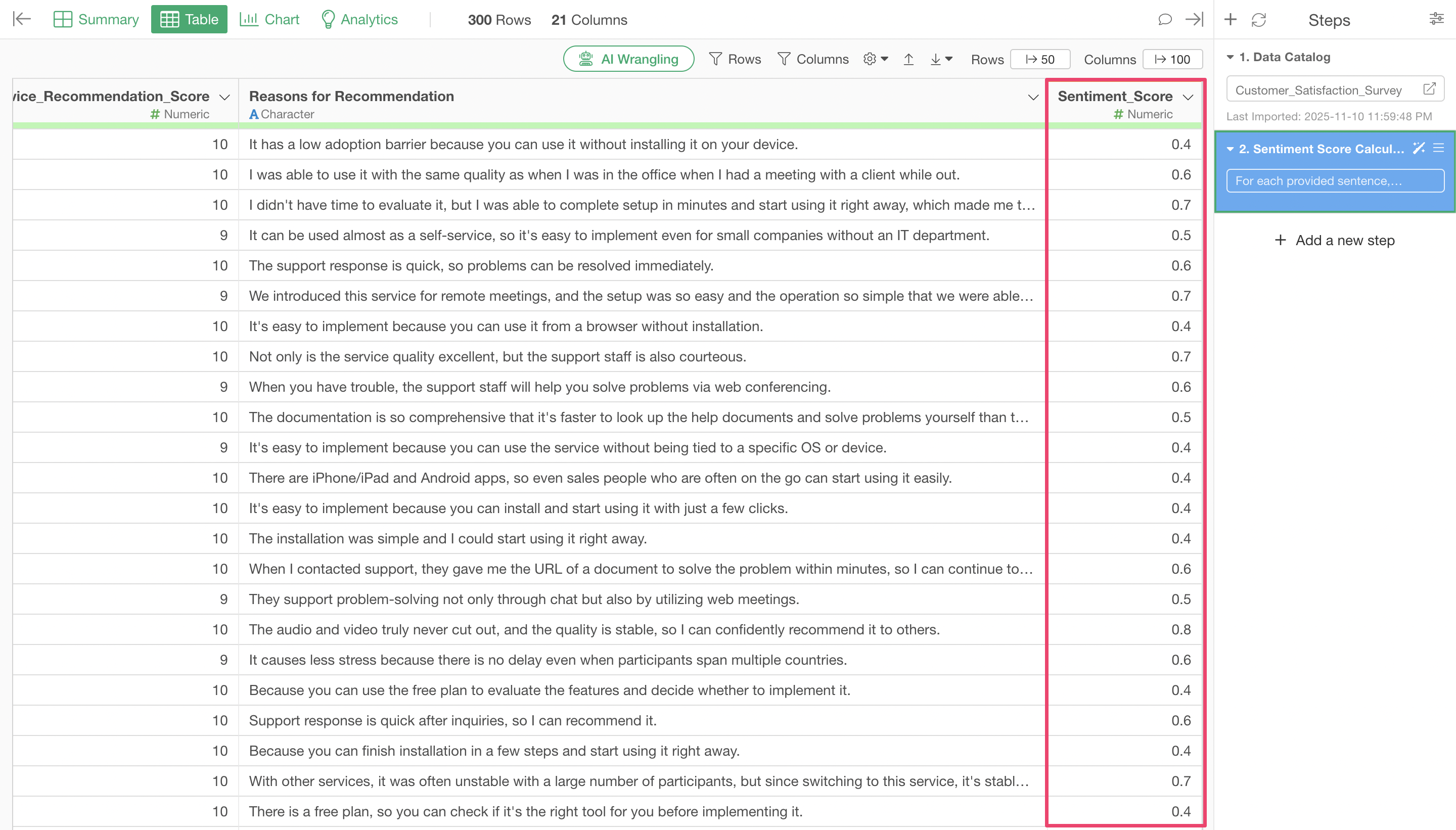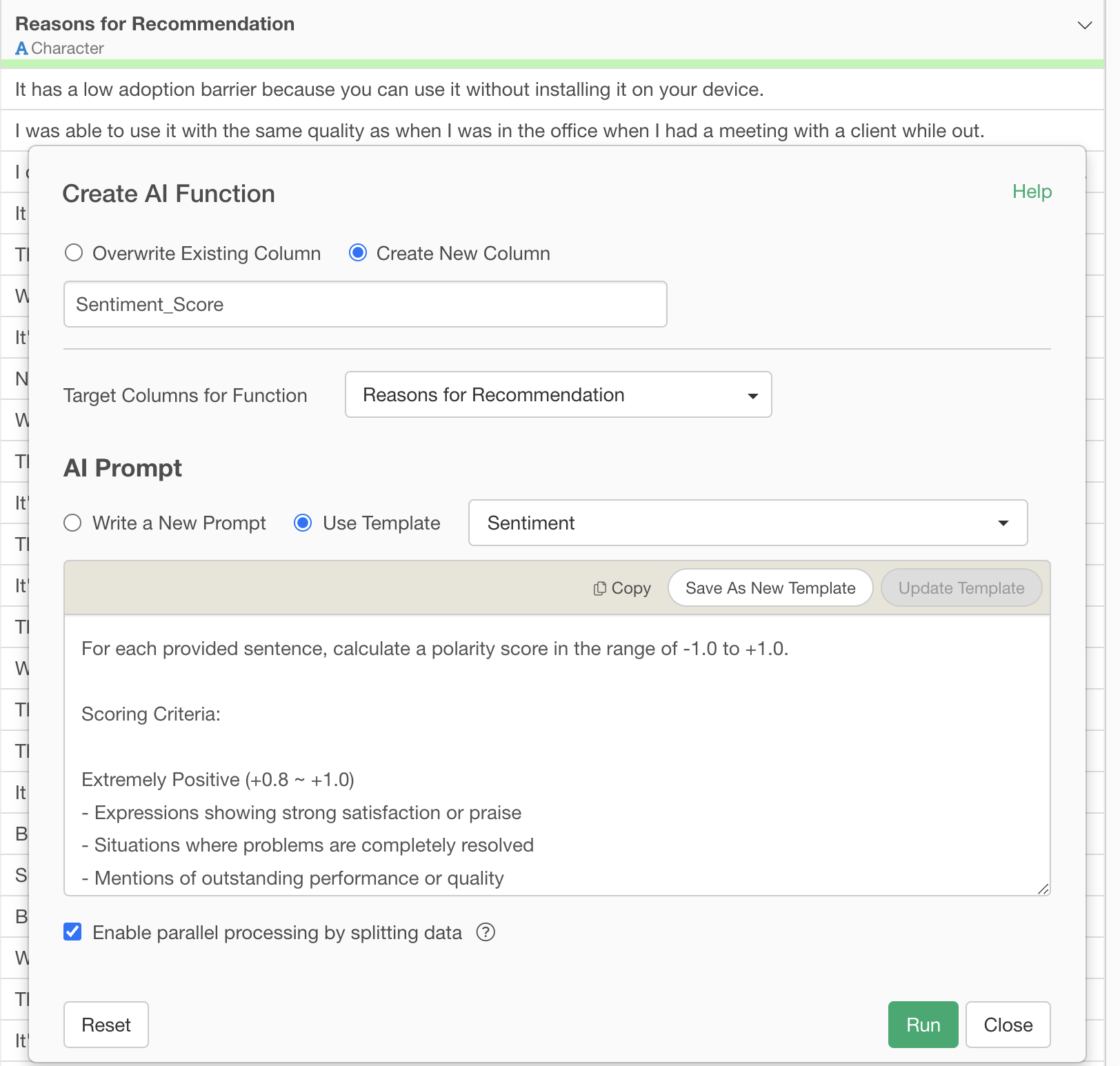 Using AI Functions, we can easily generate sentiment scores for free-text responses and confirm that appropriate scores are assigned based on context.