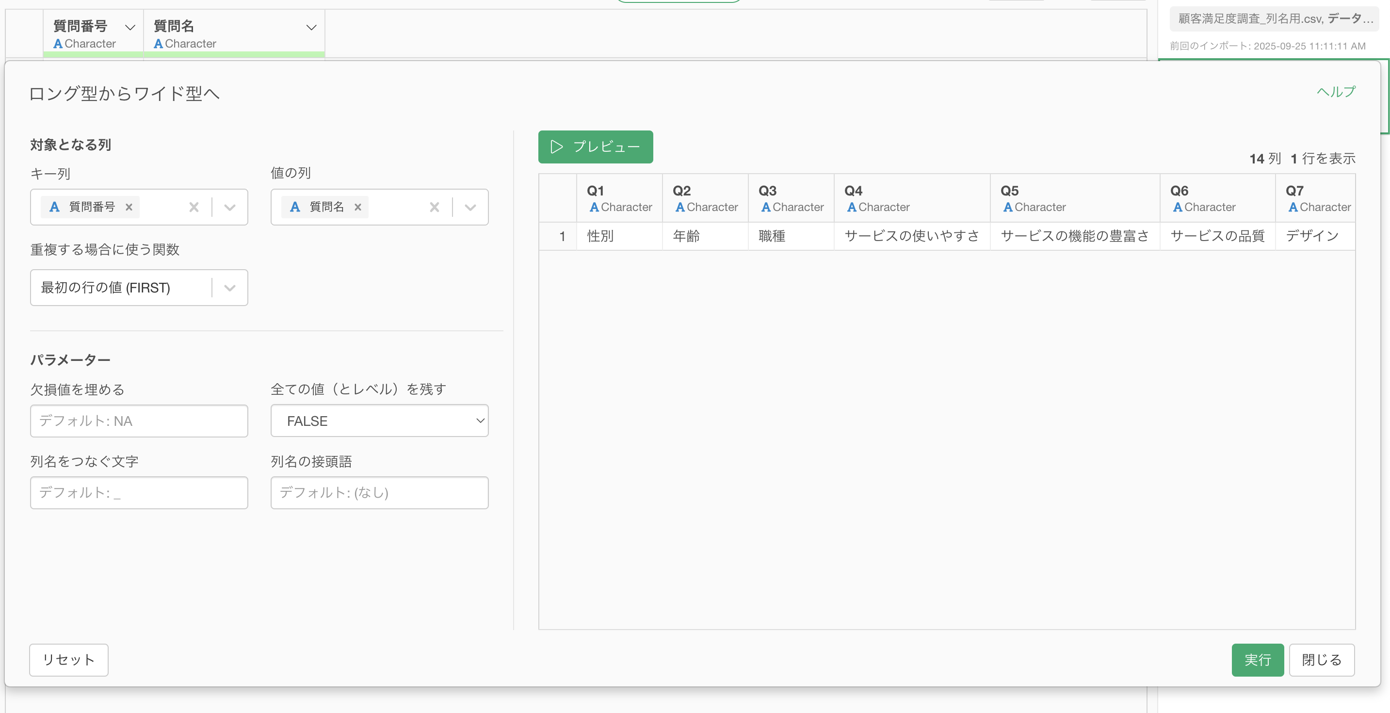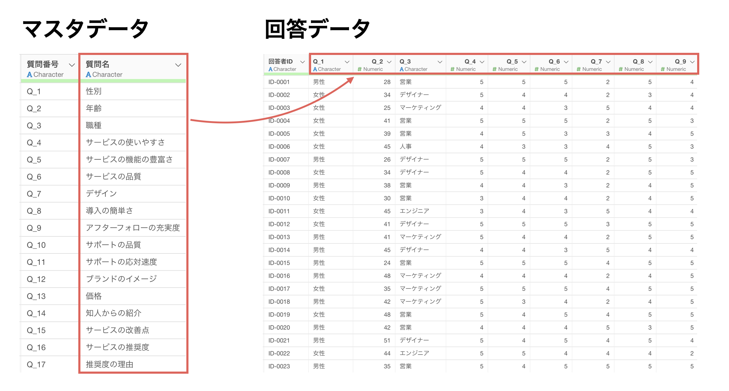 その上で、回答データにマージすることで、質問名の情報を回答データに取り込むことができます。