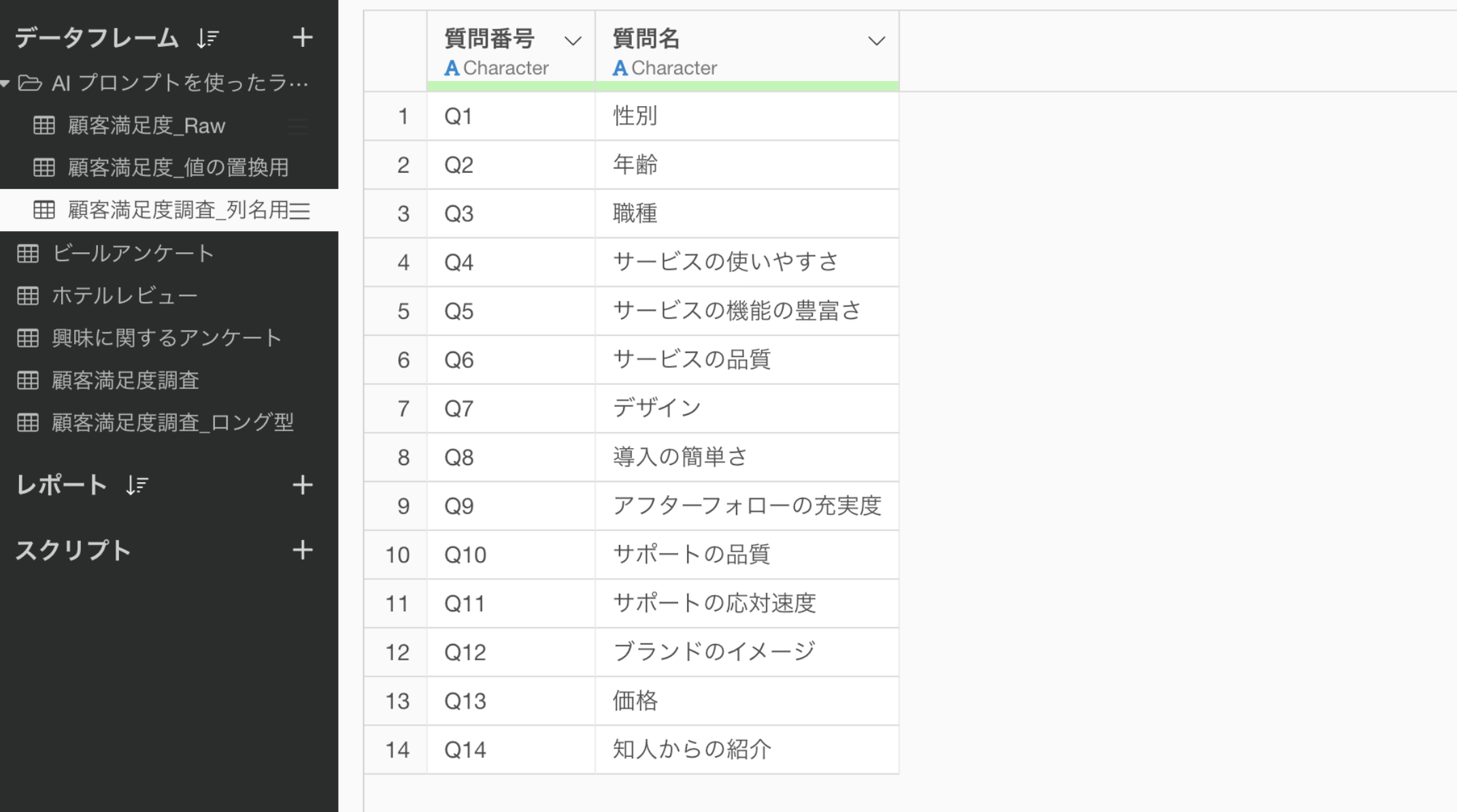 アンケートデータなどでは、列名が「Q1」「Q2」「Q3」のような質問番号で構成されていることがあります。