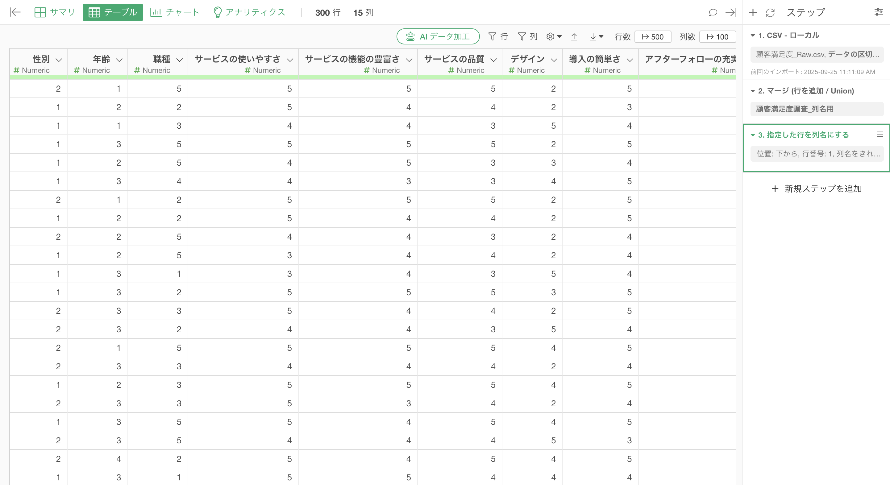 このままでは各列がどのような質問内容に対応しているのかがわからず、データ分析の際に不便です。特に質問数が多い場合、誤った解釈にもつながりかねません。