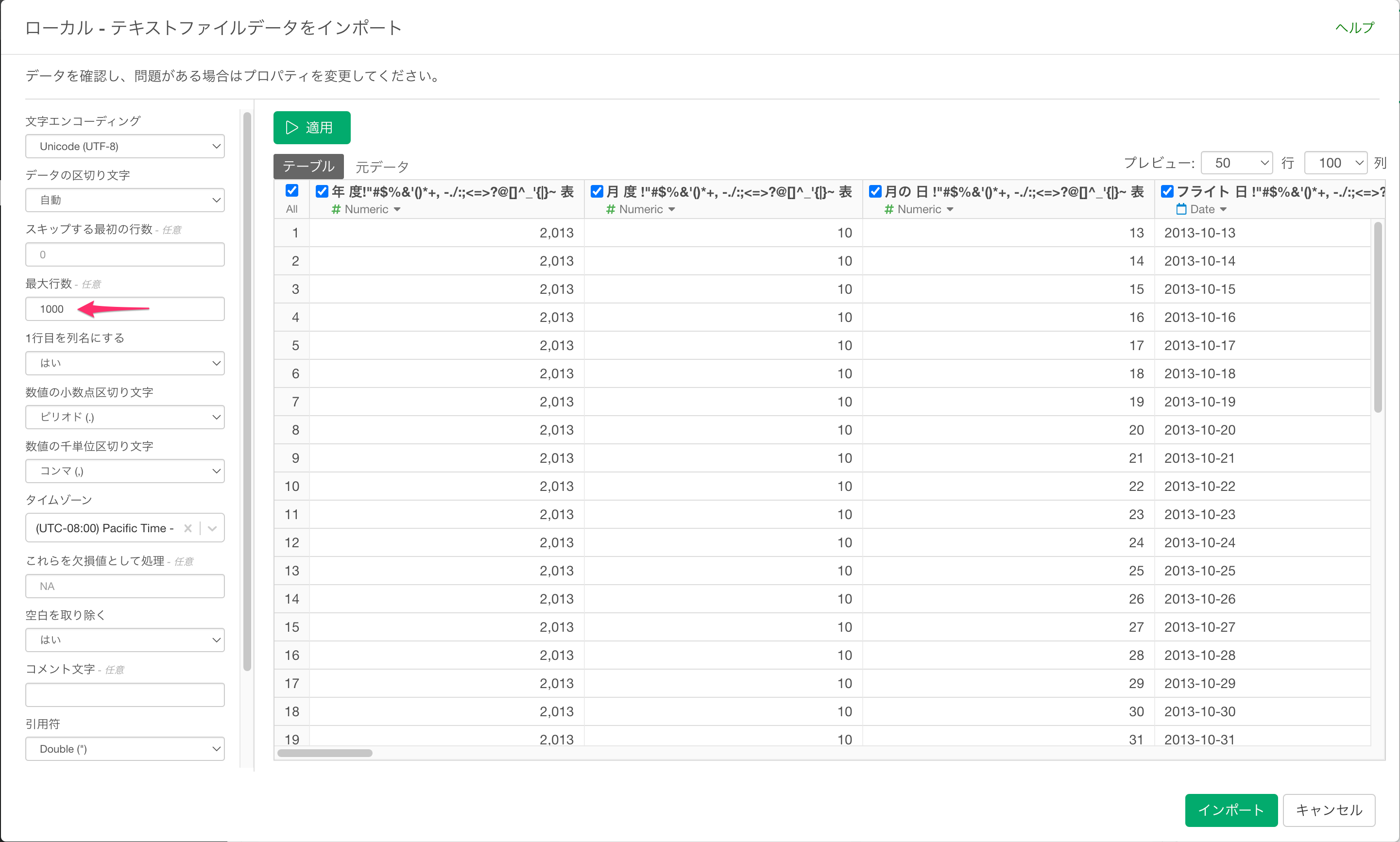 このフィールドはオプションです。空のまま保存するとこれまでと同様に全行がインポートされます。行数を制限する場合は、1000