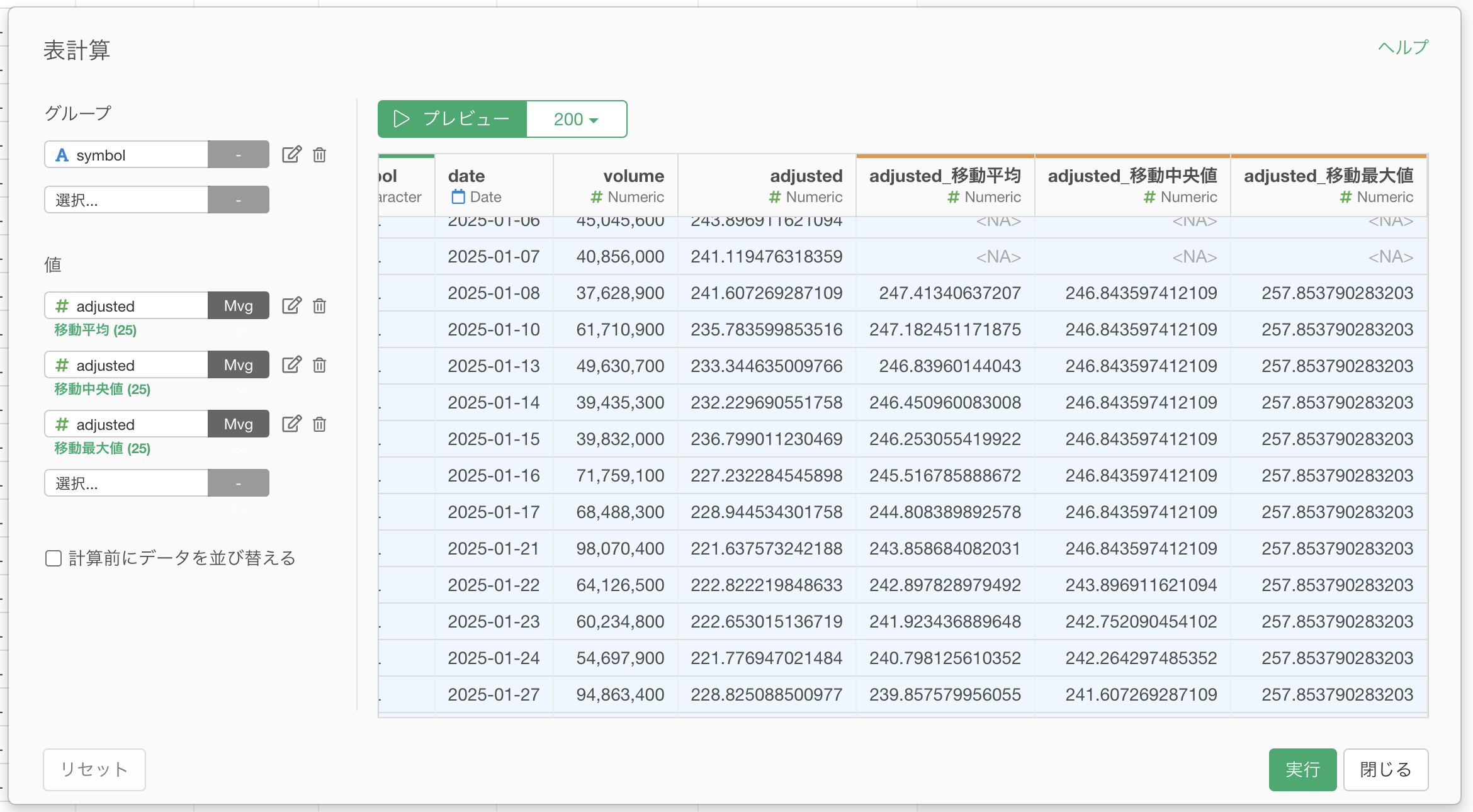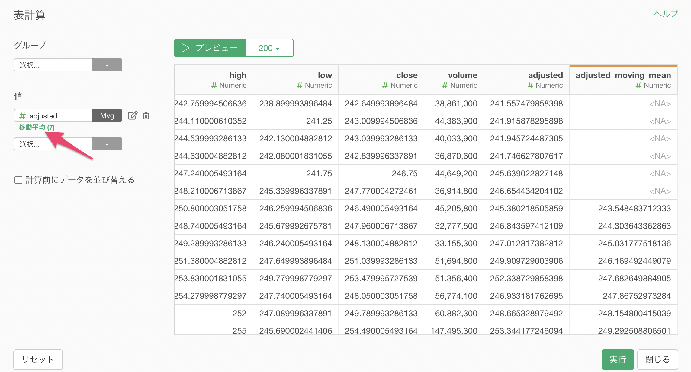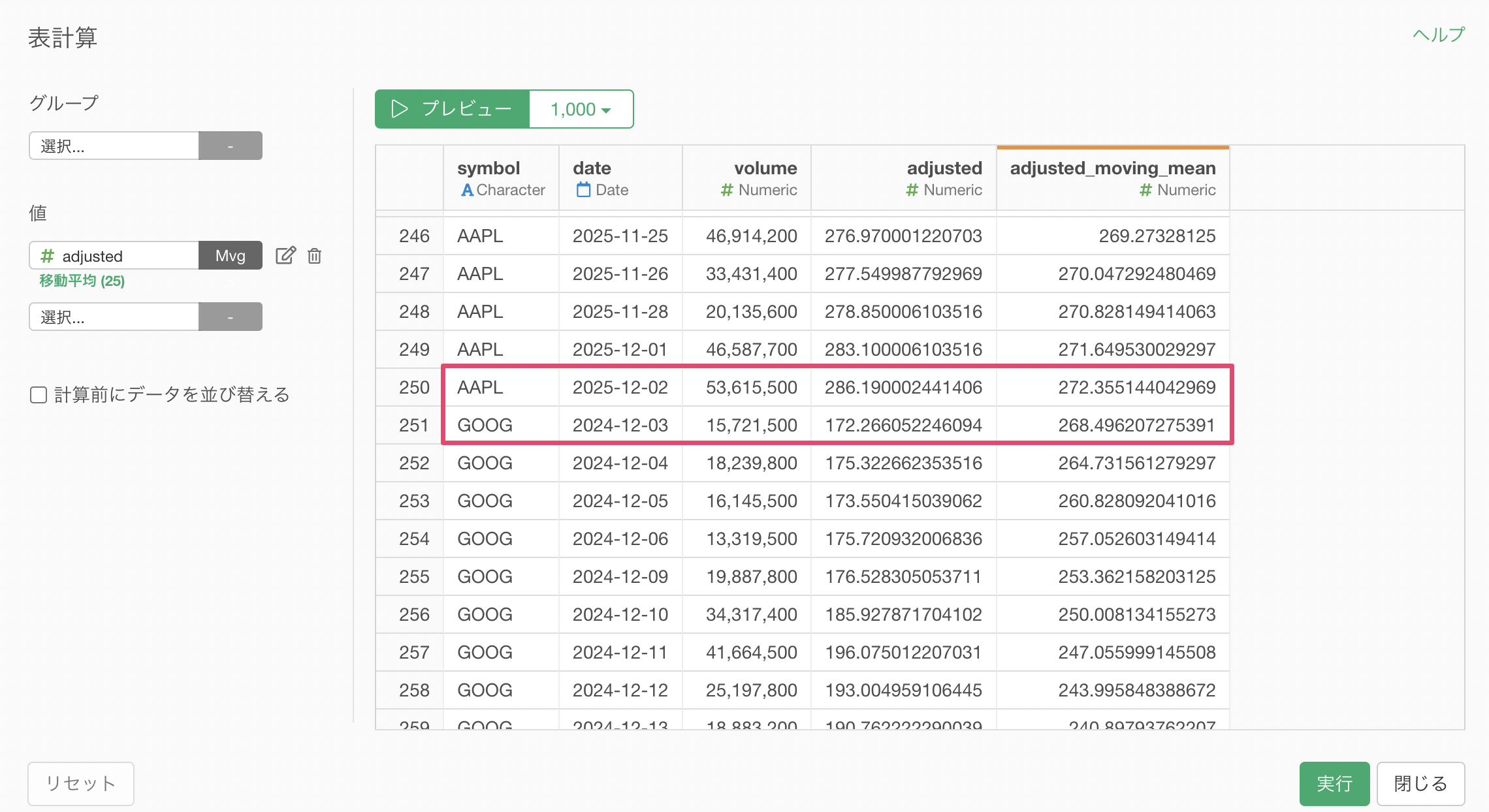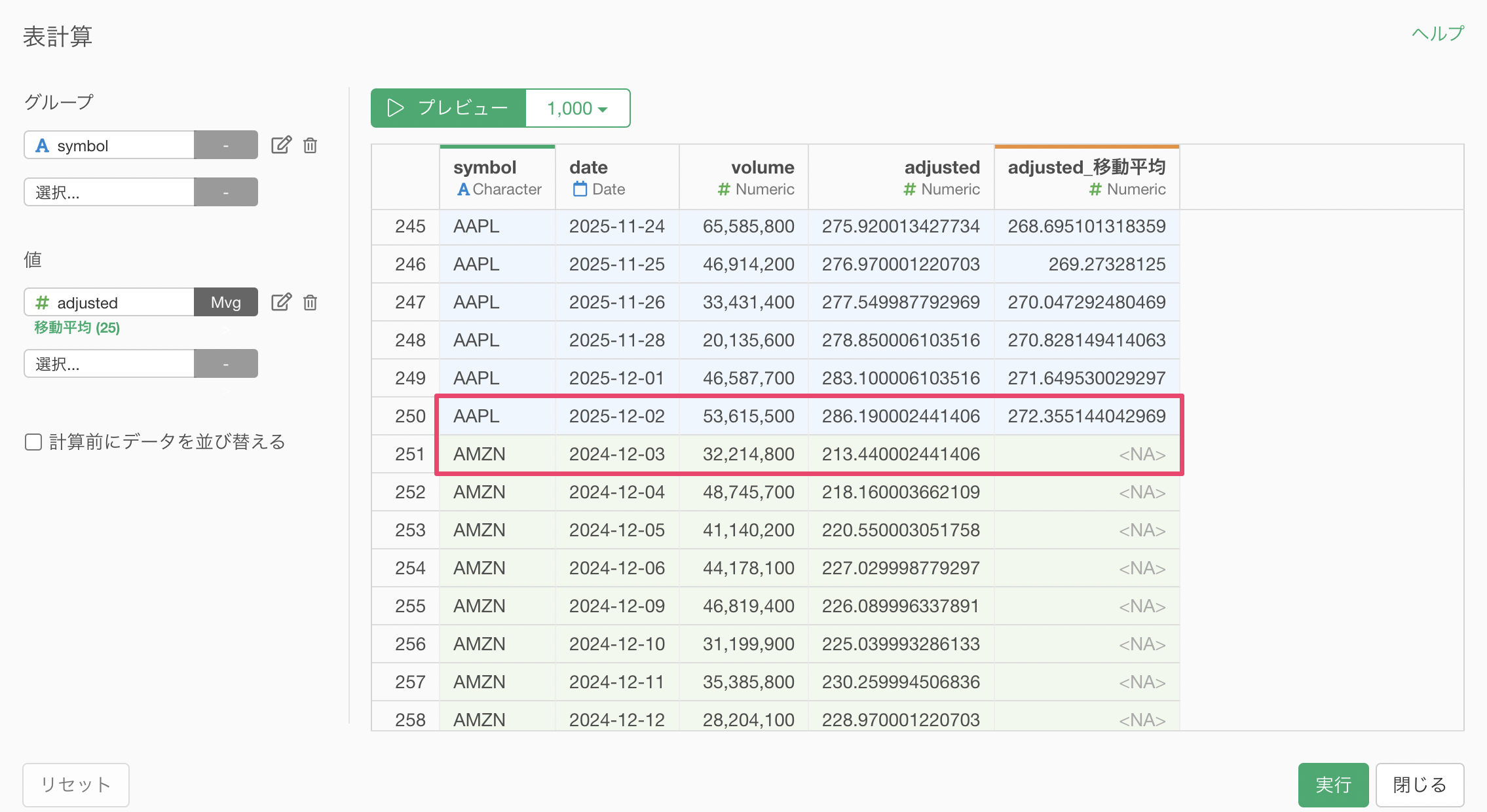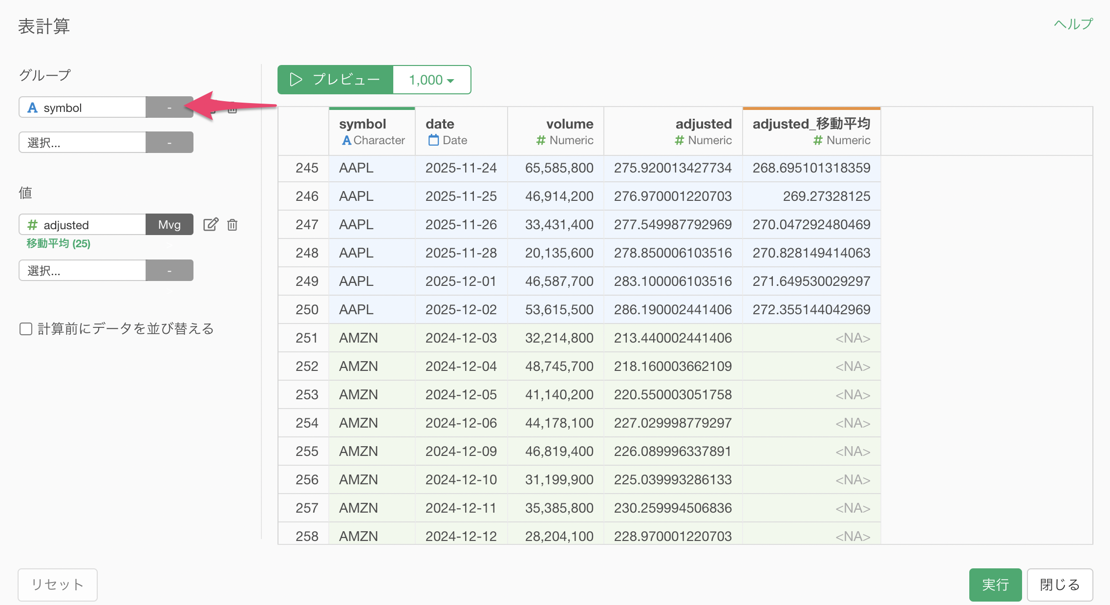 今回は銘柄ごとに移動平均を計算したいため、グループに「symbol」を選択しています。