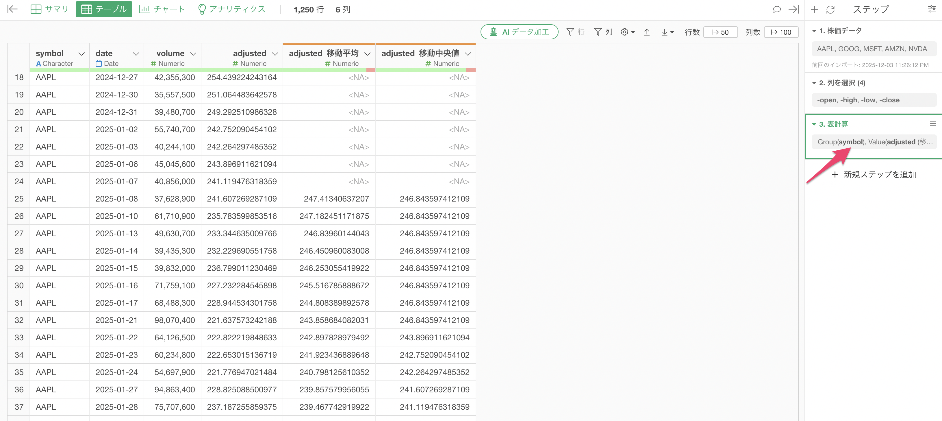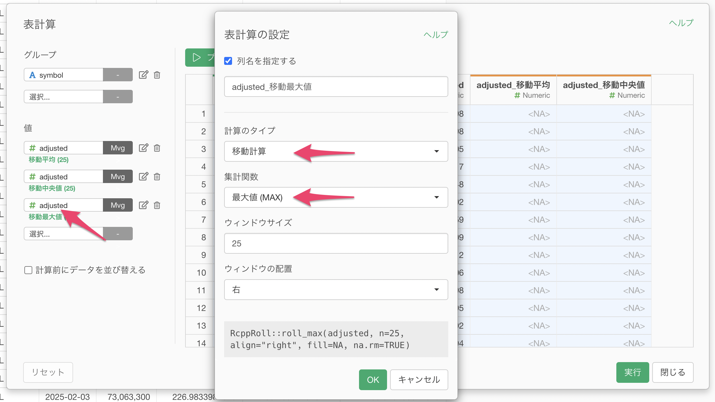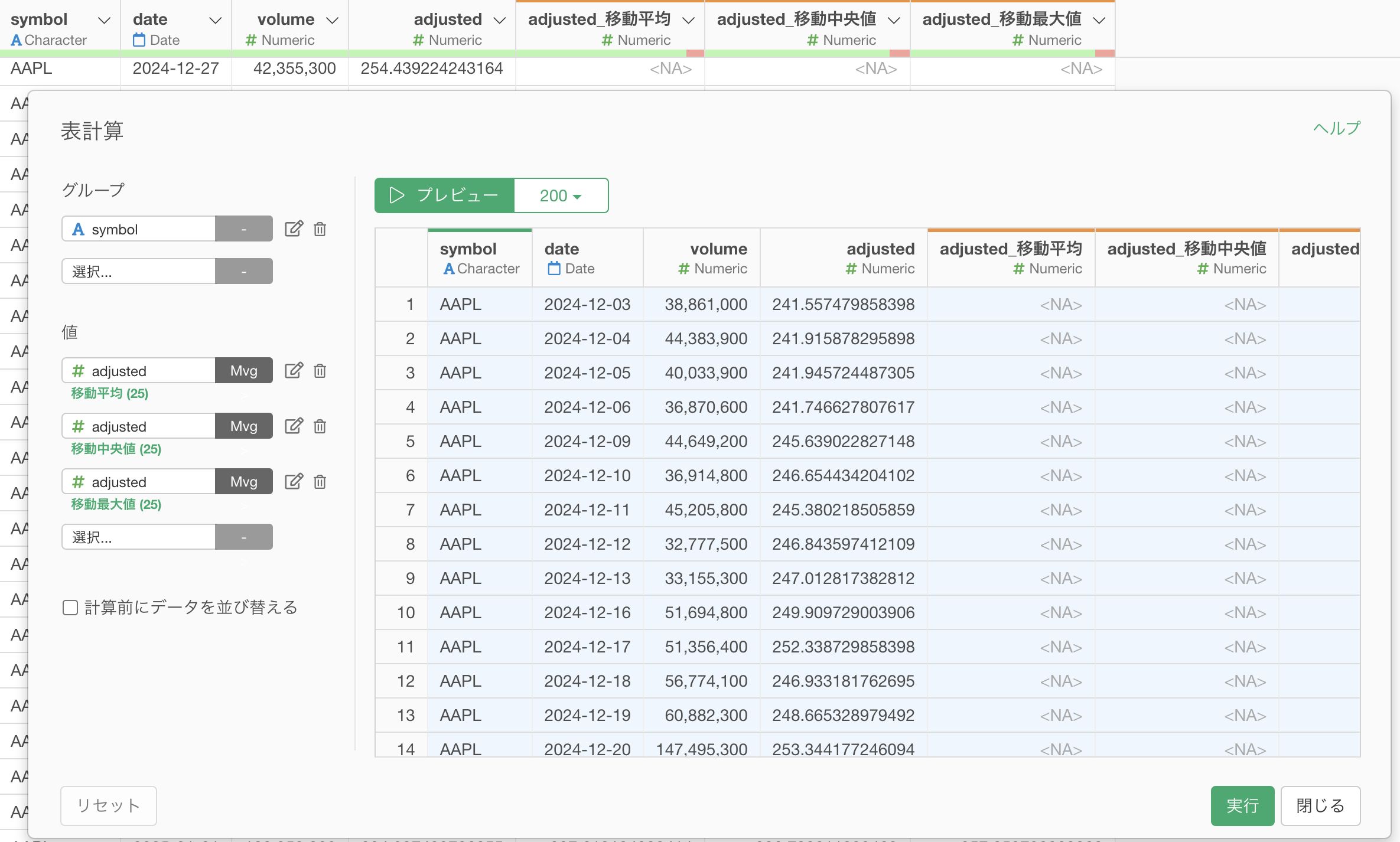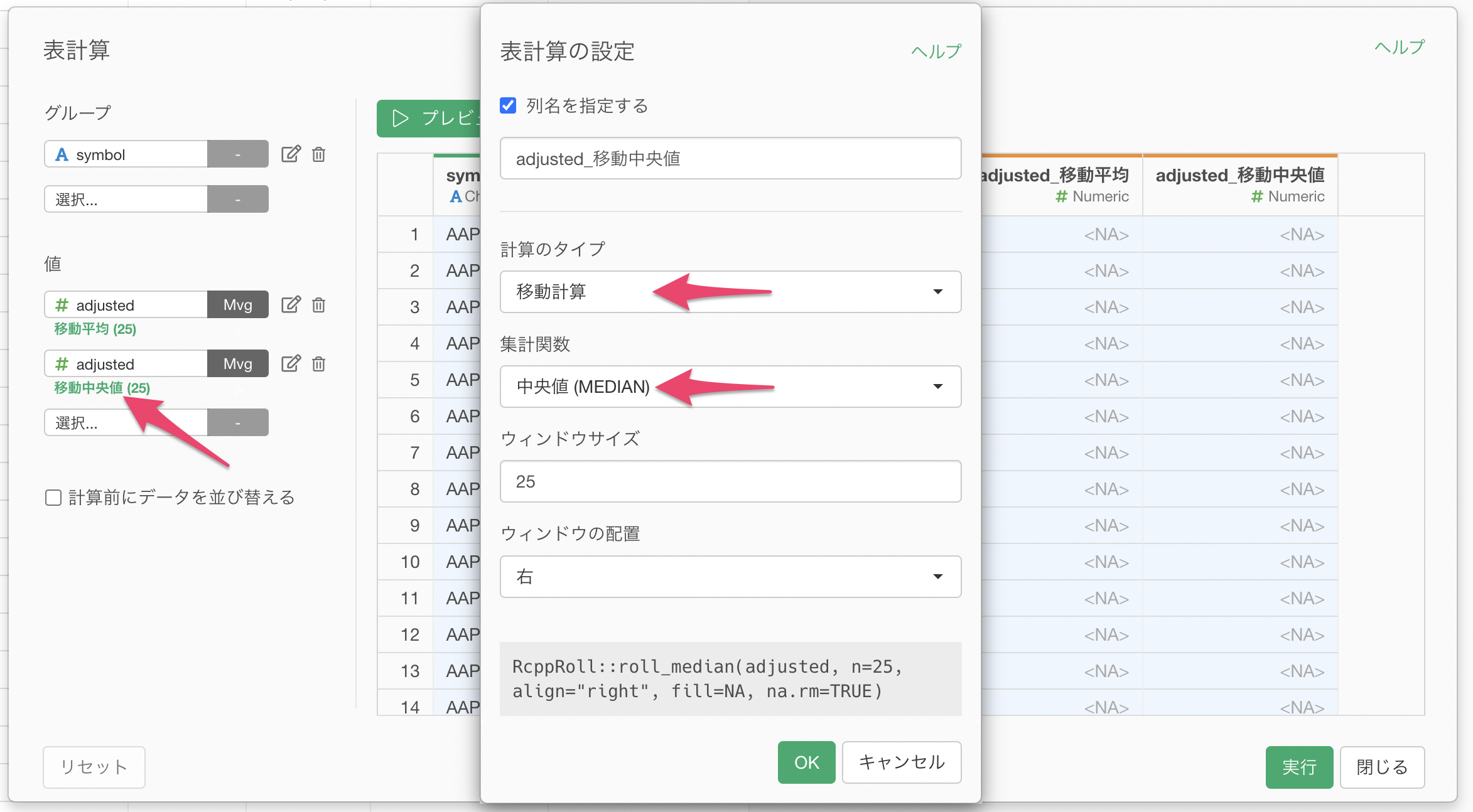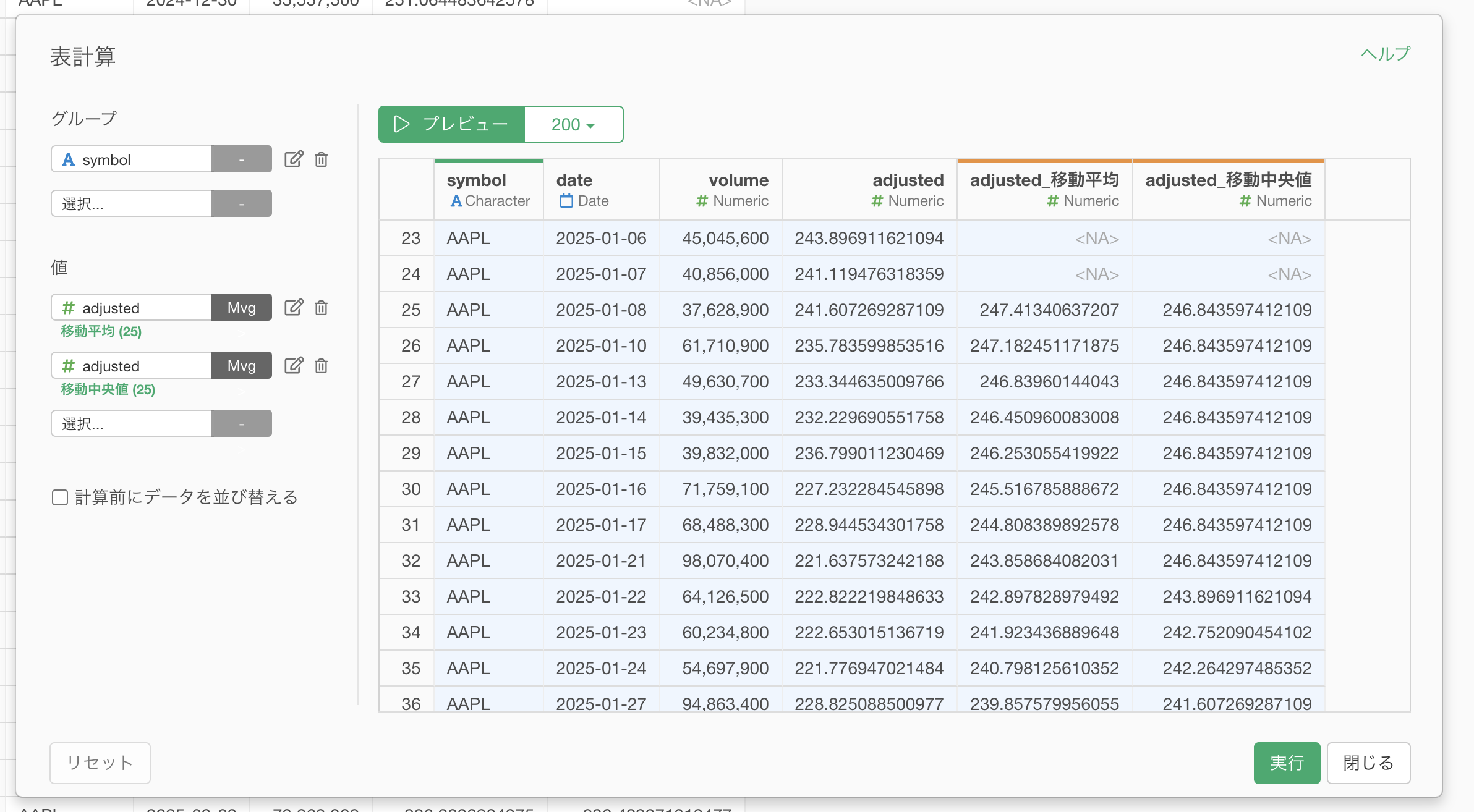 今回は銘柄ごとに移動平均を計算したいため、グループに「symbol」を選択しています。