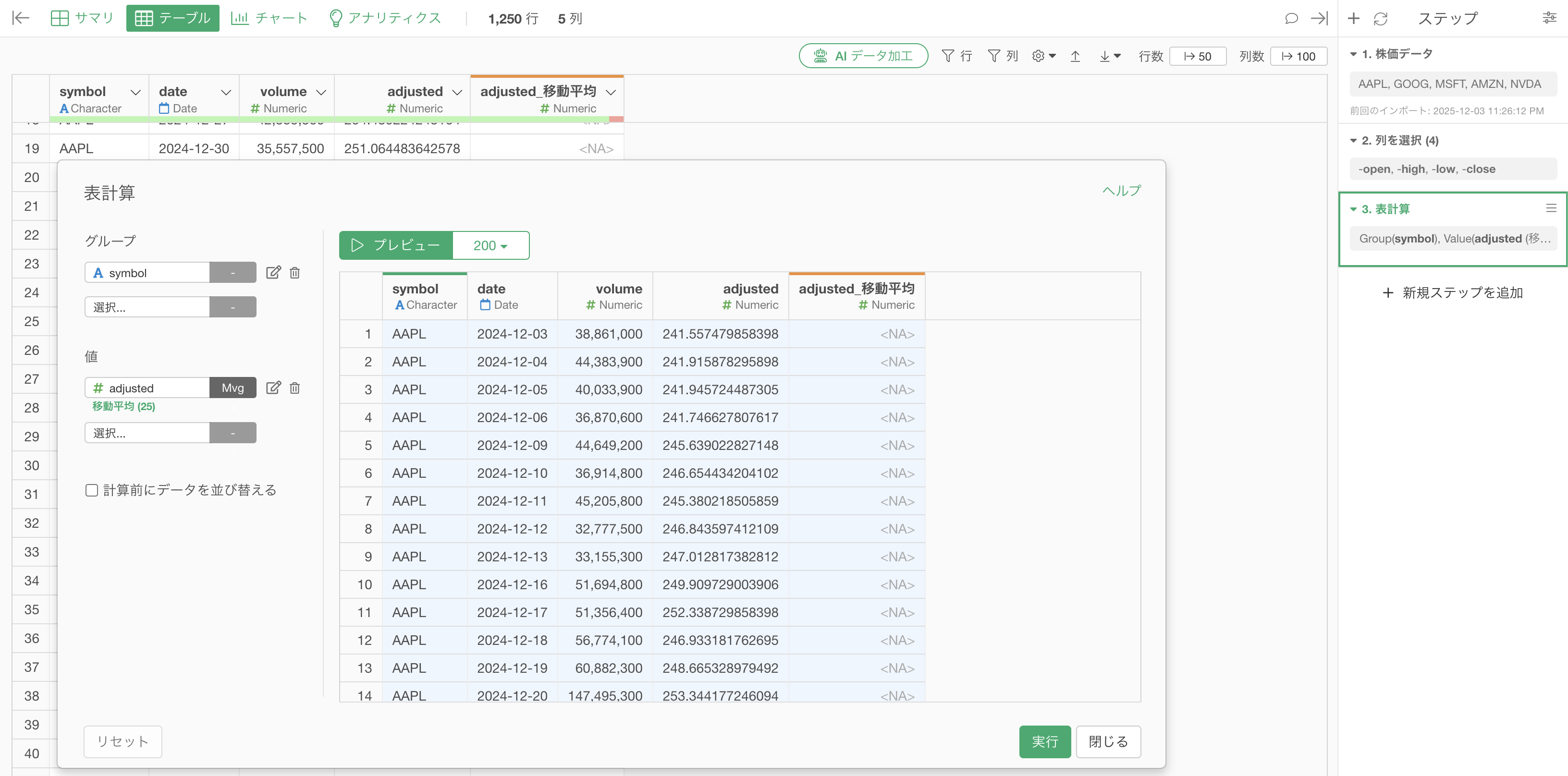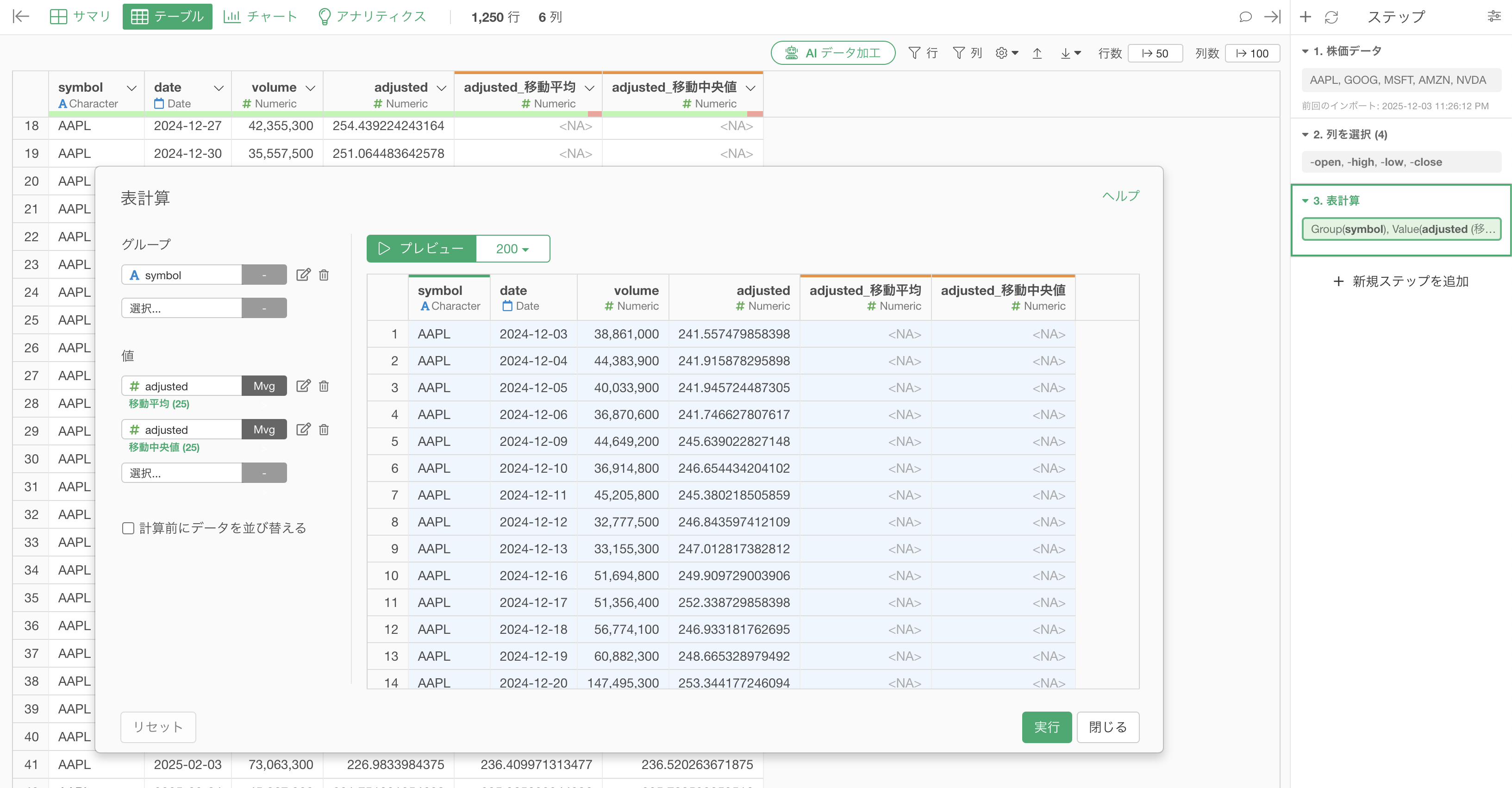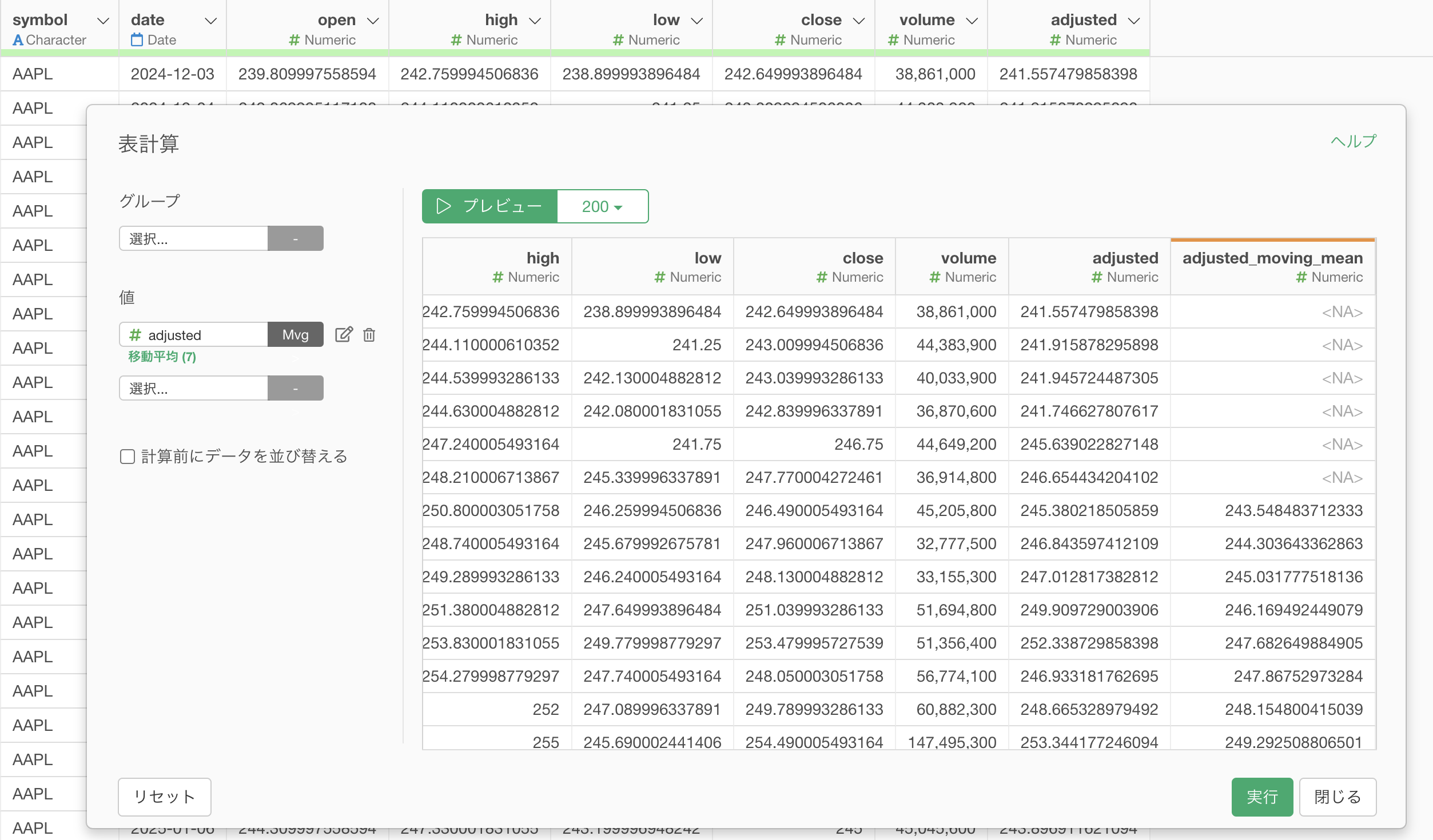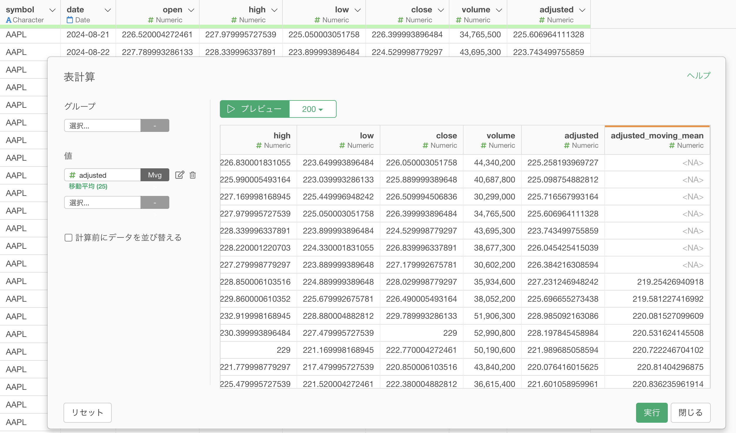 表計算のダイアログが表示され、株価の移動平均を求めた新しい列(adjusted_moving_mean)が作成されています。