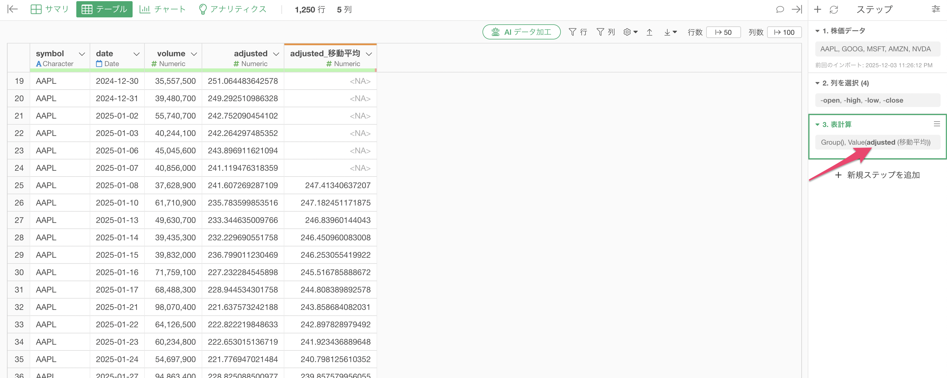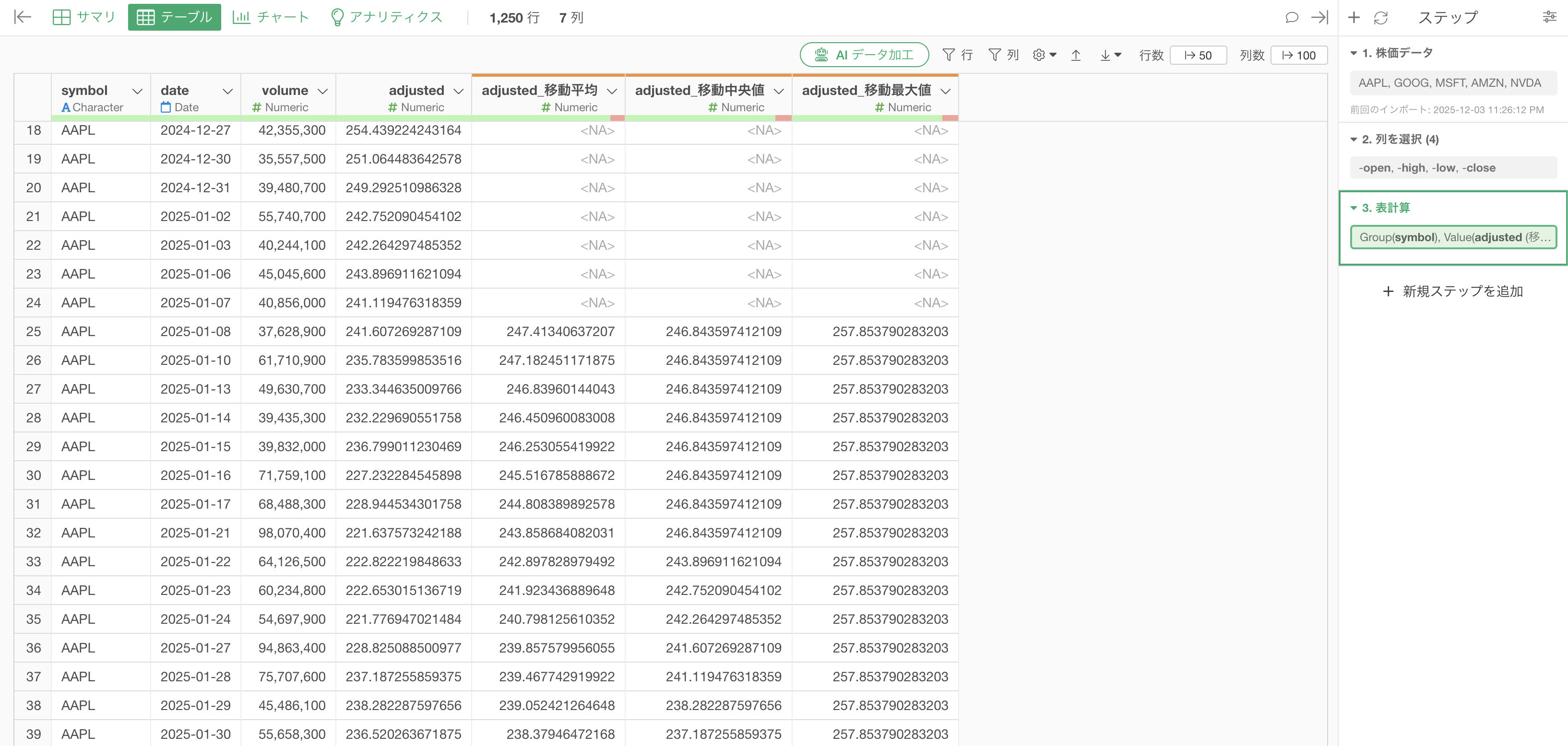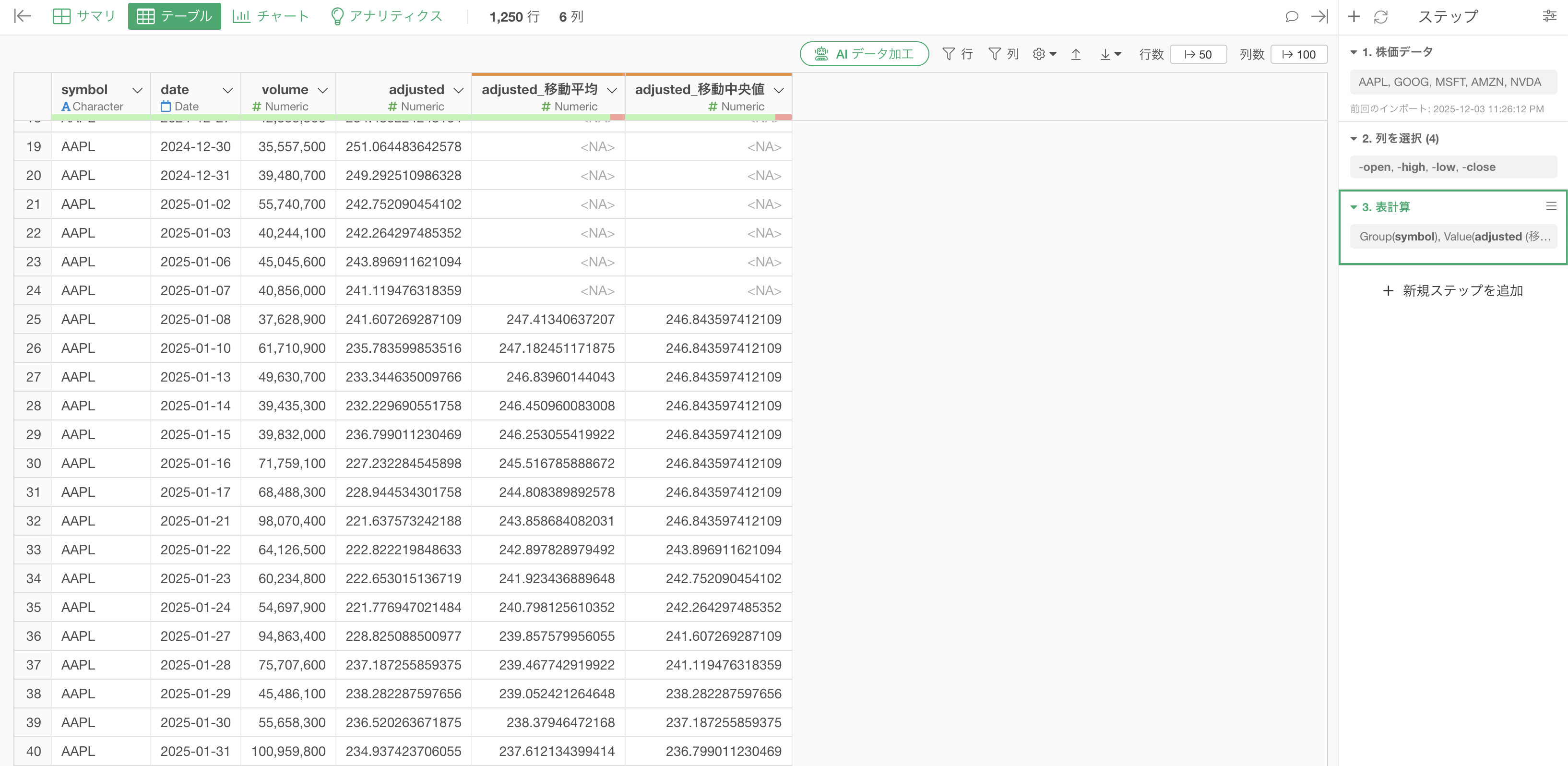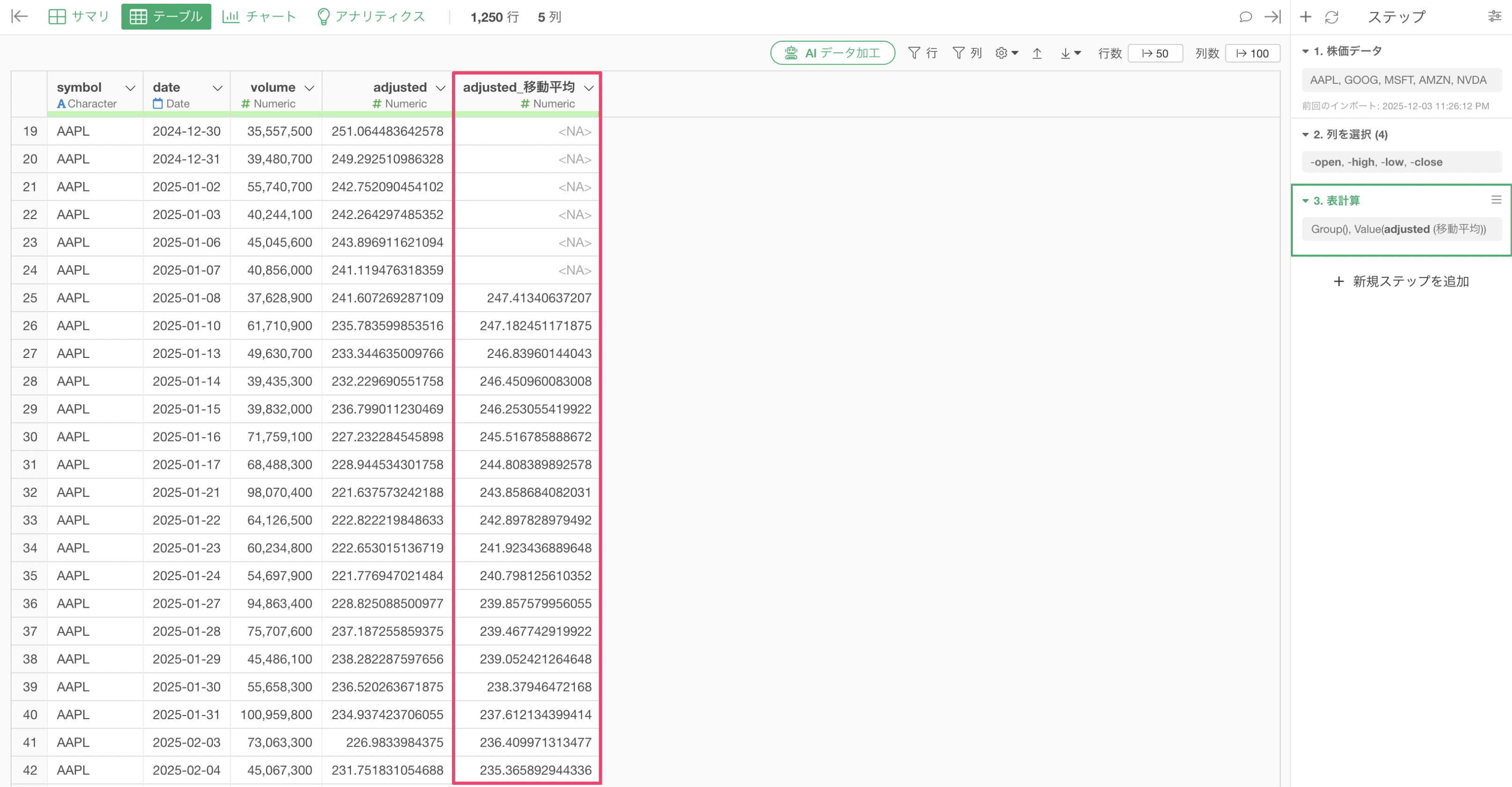 表計算のダイアログが表示され、株価の移動平均を求めた新しい列(adjusted_moving_mean)が作成されています。