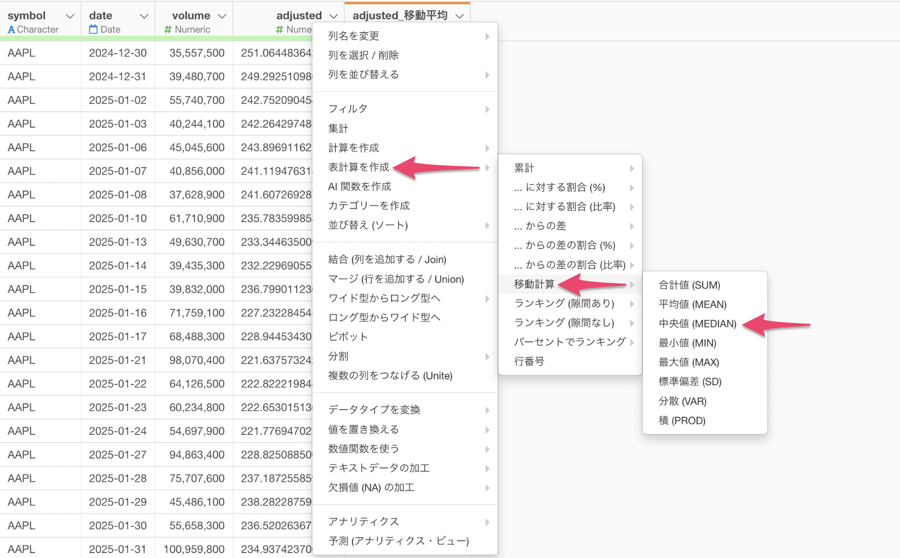 株価(adjusted)の列ヘッダメニューから「表計算を作成」の「移動計算」を選び、今度は「中央値(MEDIAN)」を選択します。