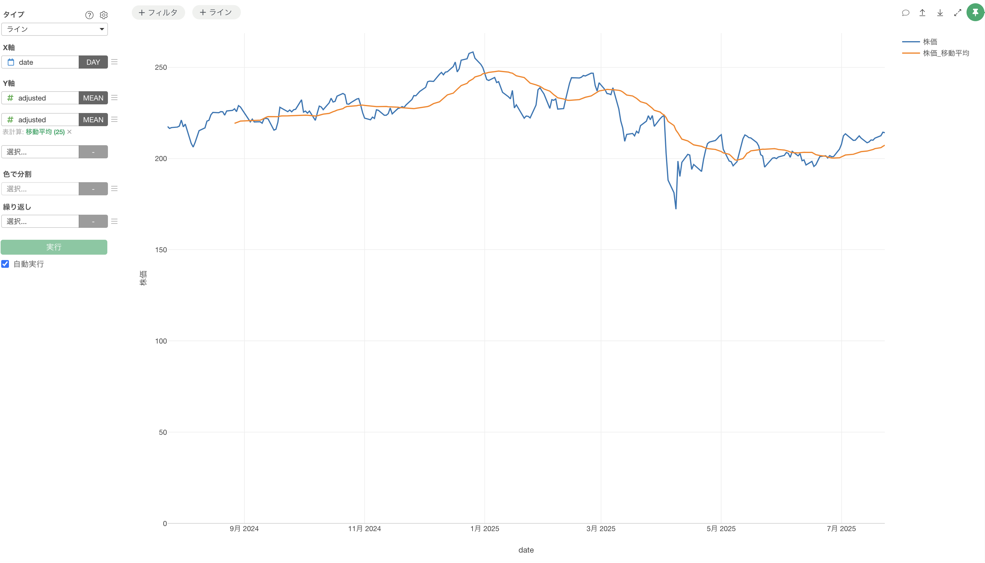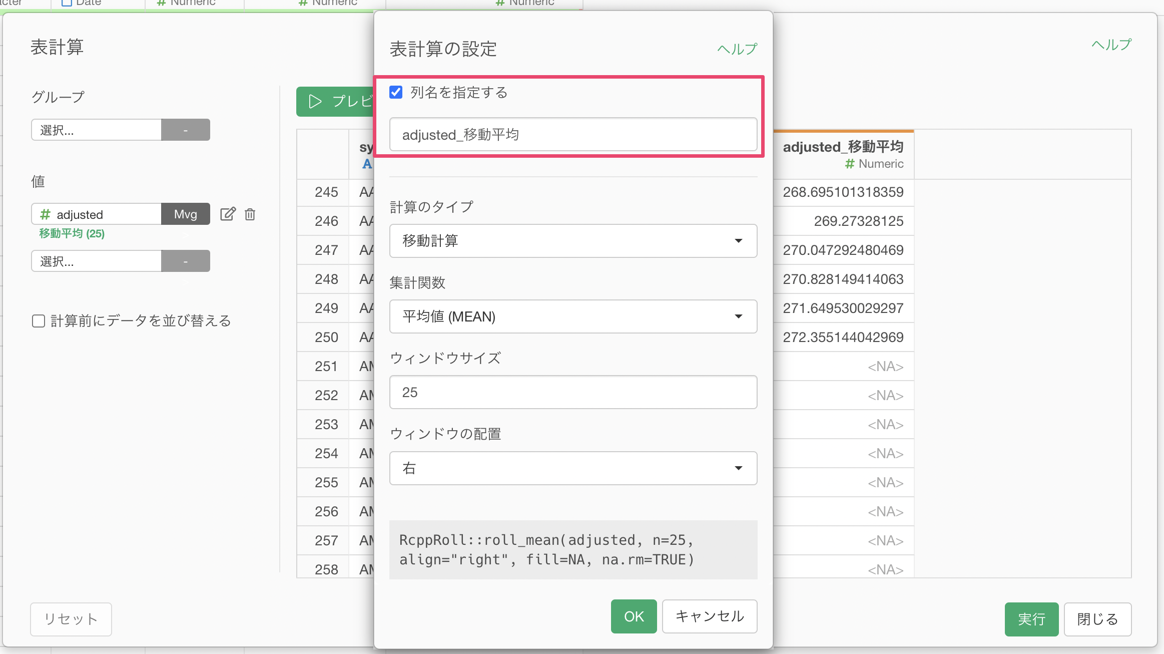 株価の移動平均を求めた列の名前が「adjusted_roll_mean」となっているため、列名を変更するため「列名を指定する」にチェックをつけることで列名の変更ができます。