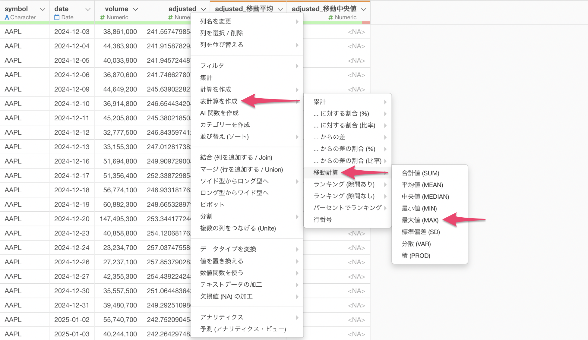 株価(adjusted)の列ヘッダメニューから「表計算を作成」の「移動計算」を選び、「最大値(MAX)」を選択します。