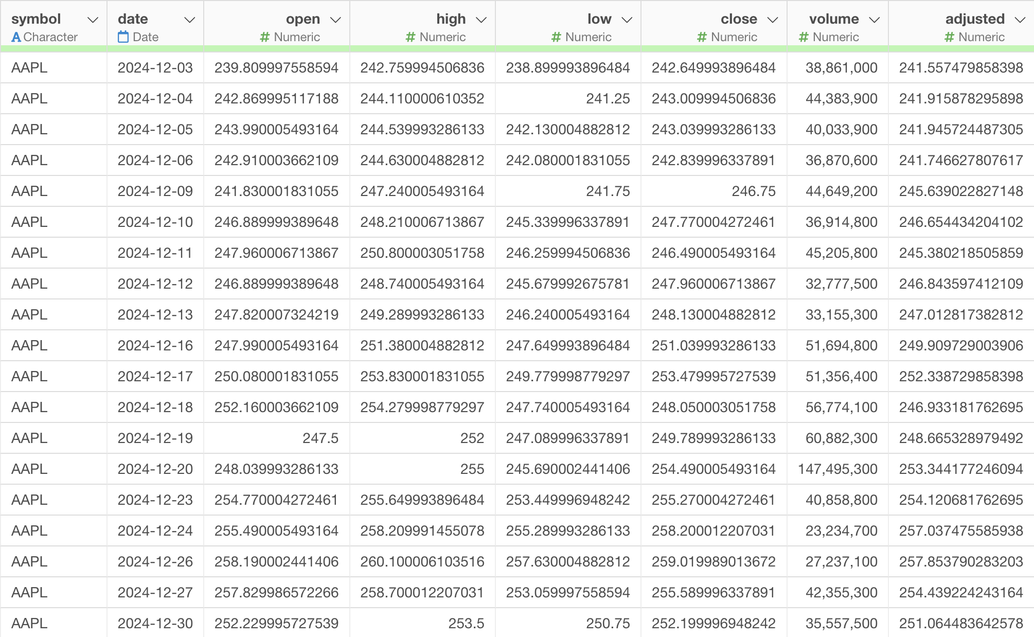例えば、下記のように銘柄ごとに各日の株価が記録されたデータがあったとします。