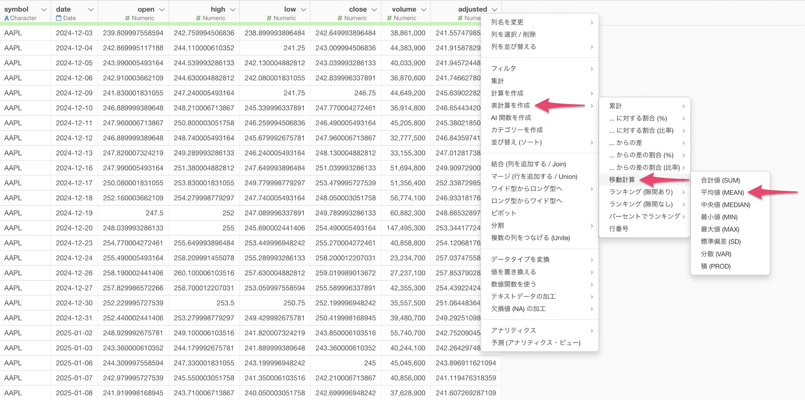 株価(adjusted)の列ヘッダメニューから「表計算を作成」の「移動計算」を選び、「平均値(MEAN)」を選択します。