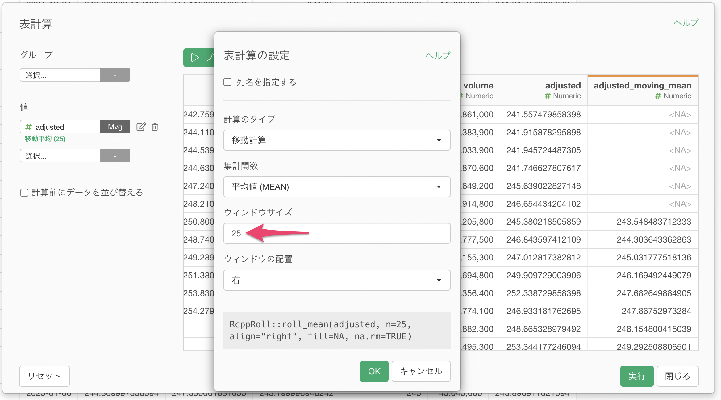 例えば、25日間の移動平均を計算したい場合は、ウィンドウサイズを「25」に変更することで可能です。