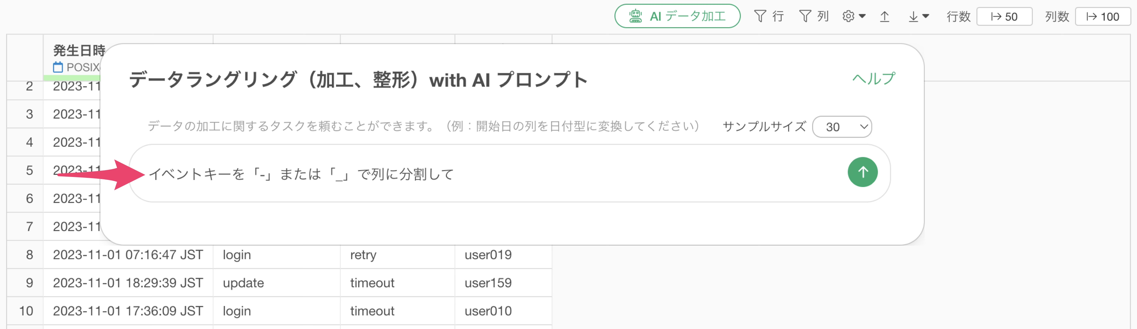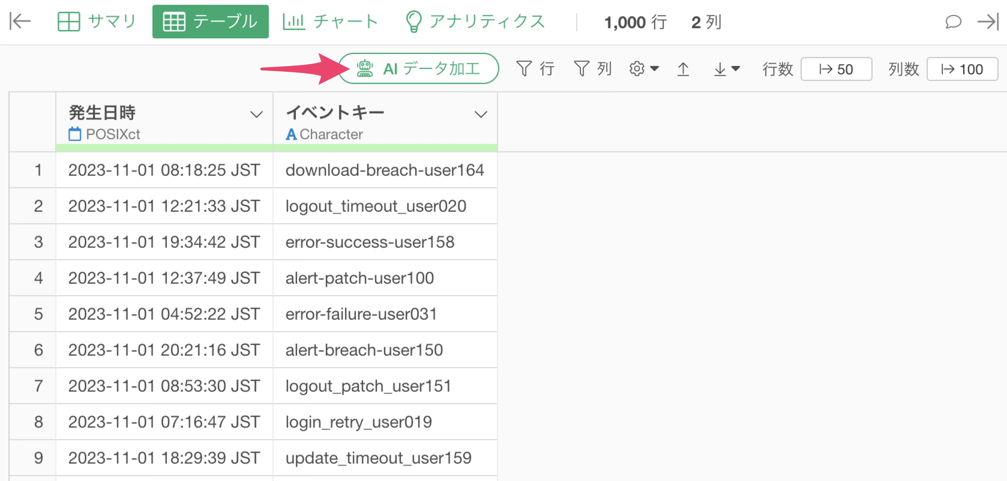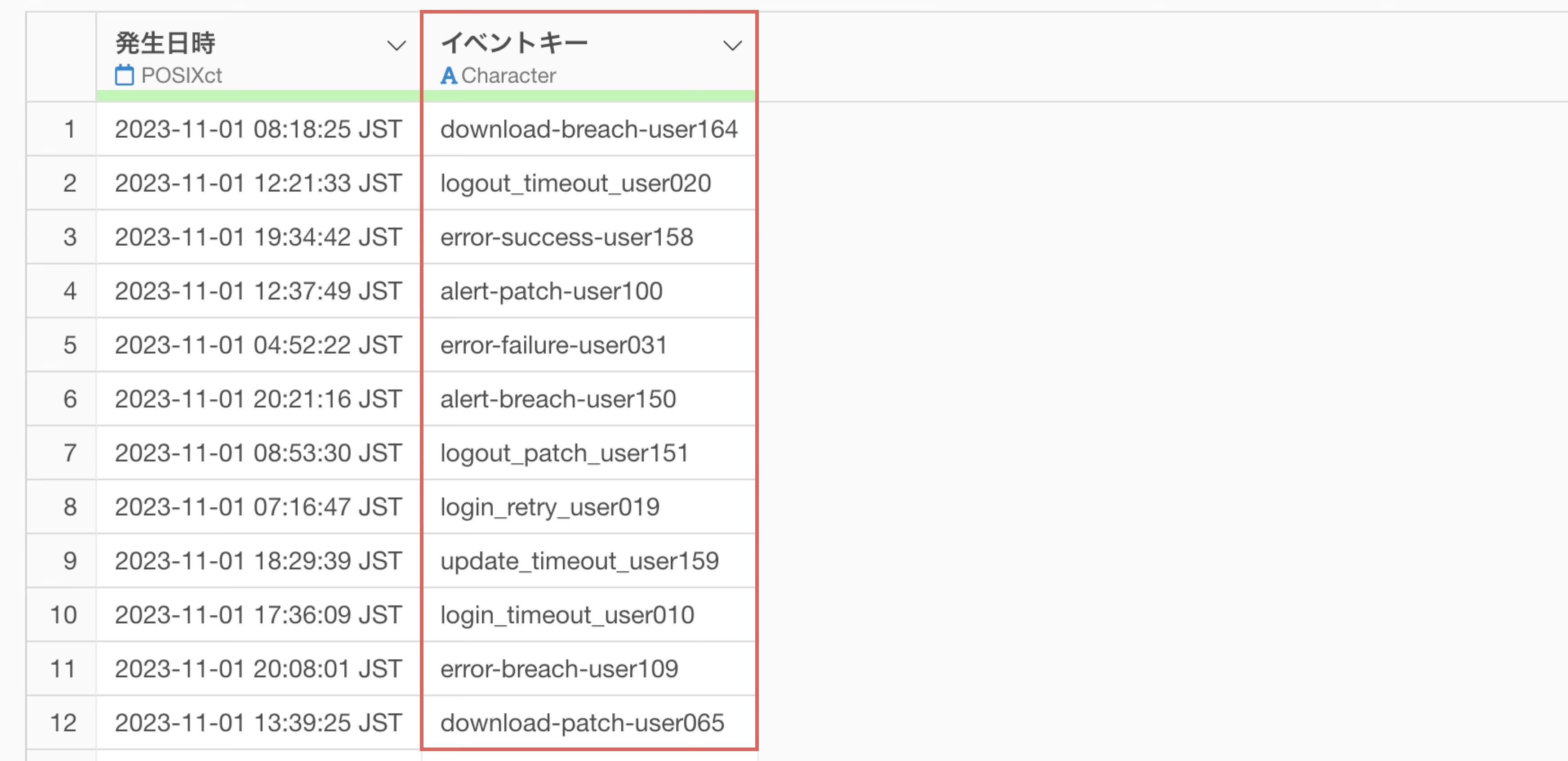 例えば上記は1行が1つログを表しており、「イベントキー」列には、「イベントの種類」や「イベントのステータス」「ユーザー」の情報が含まれているデータです。