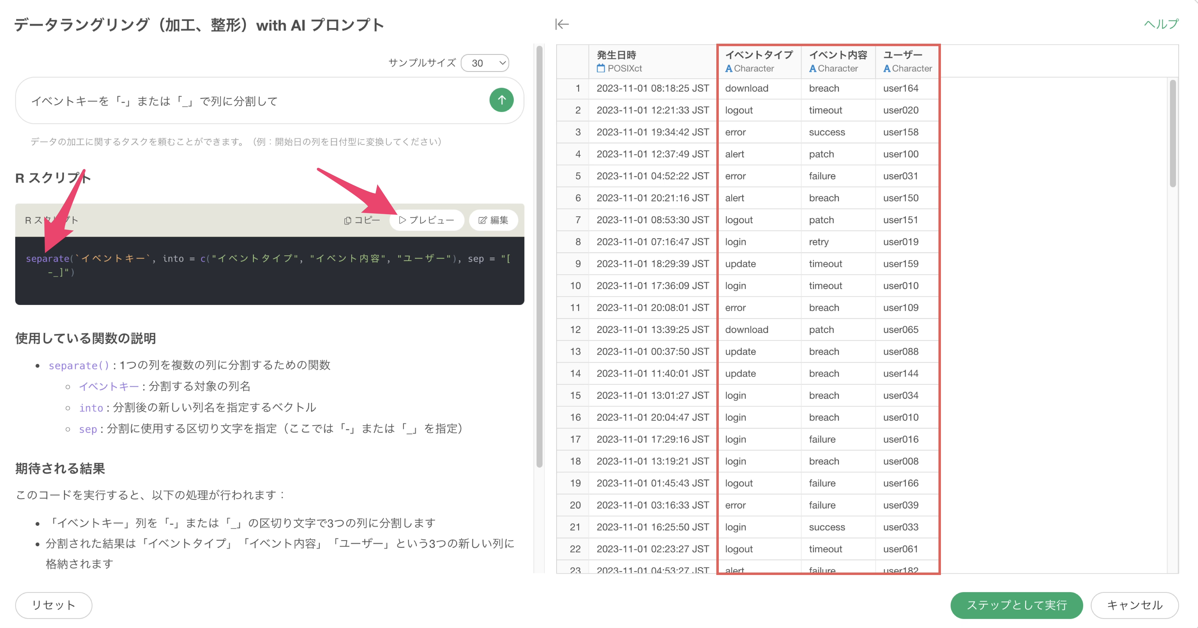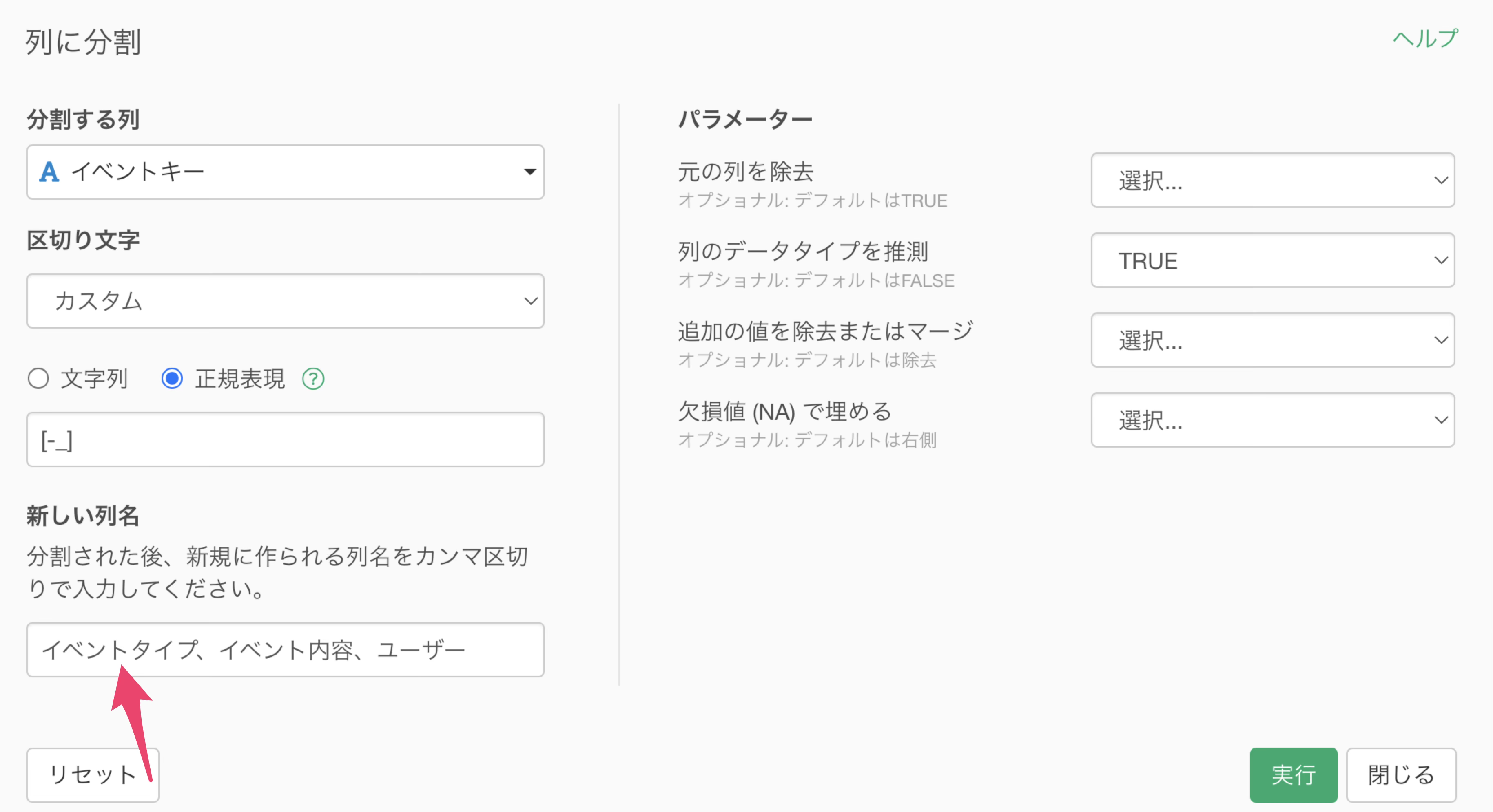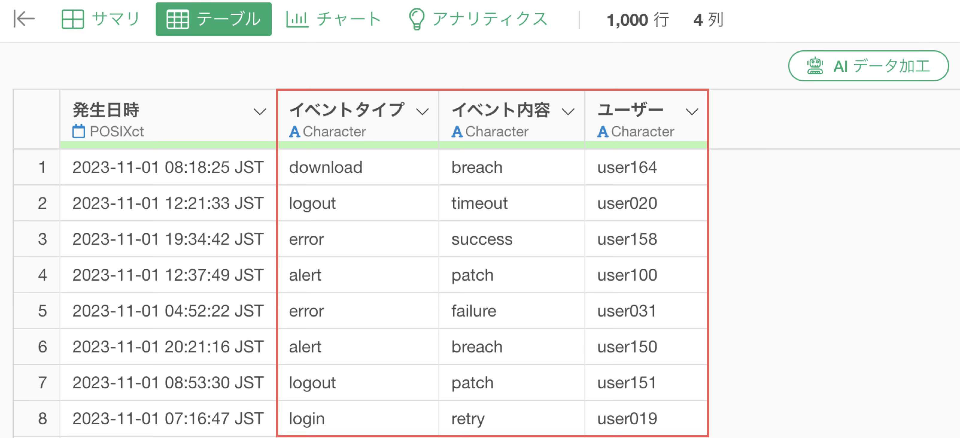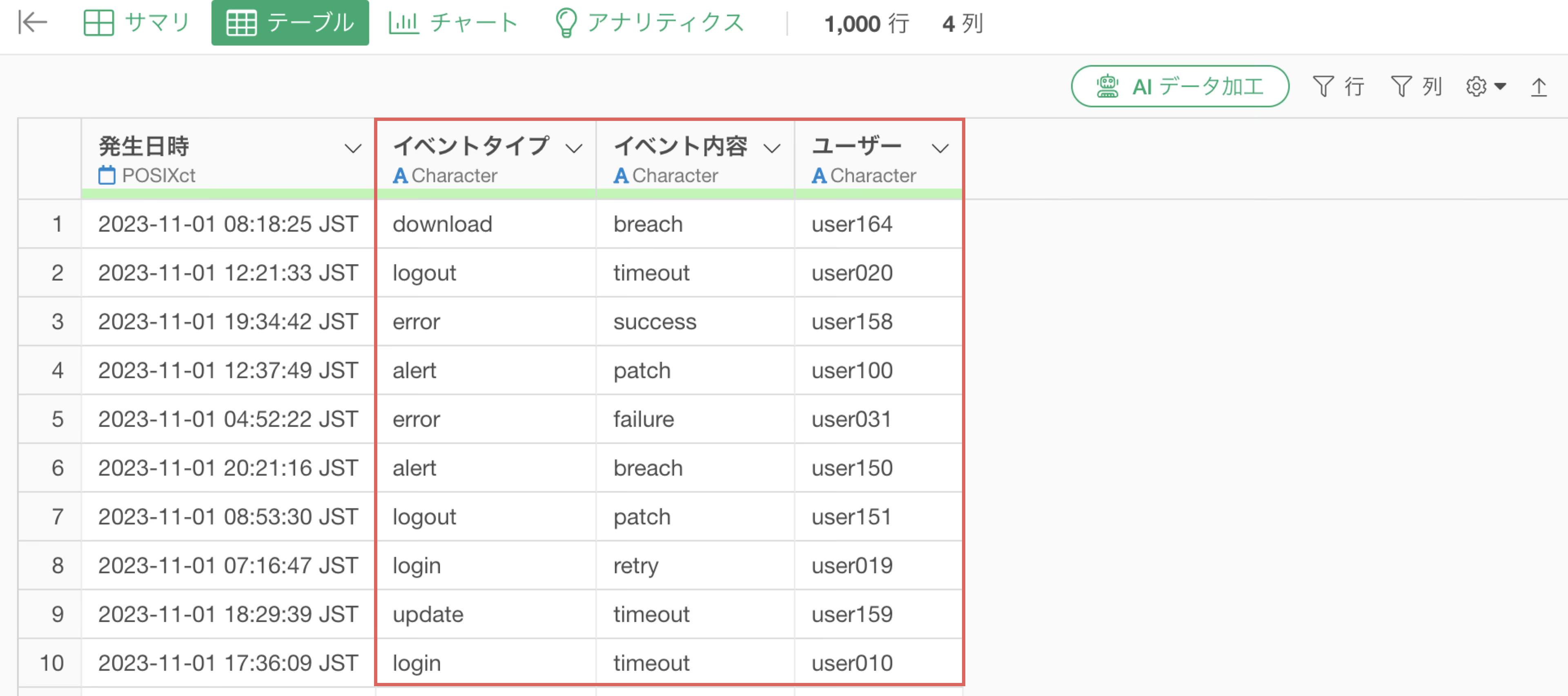 イベントタイプ、イベント内容、ユーザーに分けられるため、それらをカンマ区切りで新しい列として指定して実行します。
