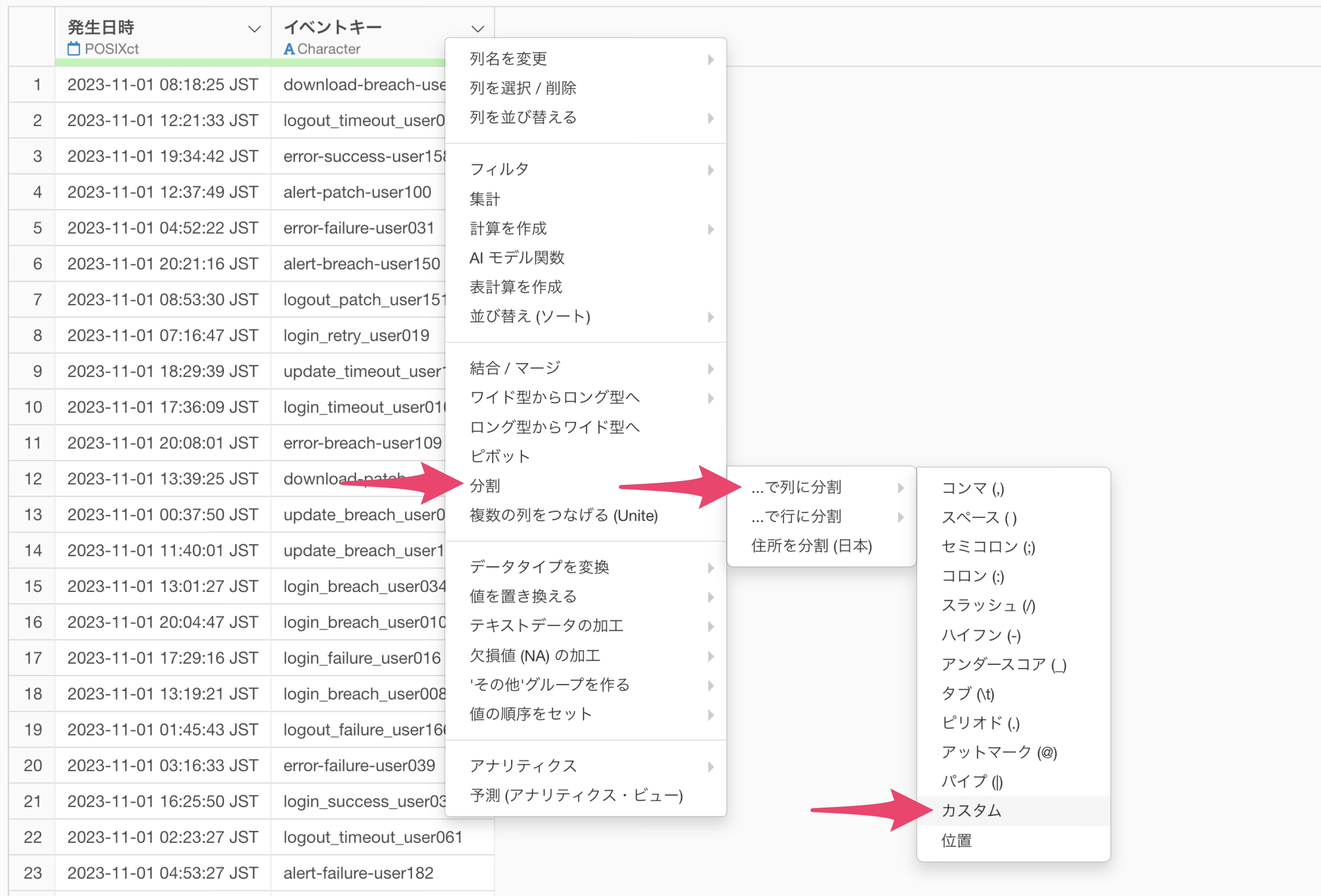 UIを利用する場合、テーブル・ビューからイベントキーの列ヘッダーメニューの「分割」から、「…で列に分割」を選択、「カスタム」を選択します。