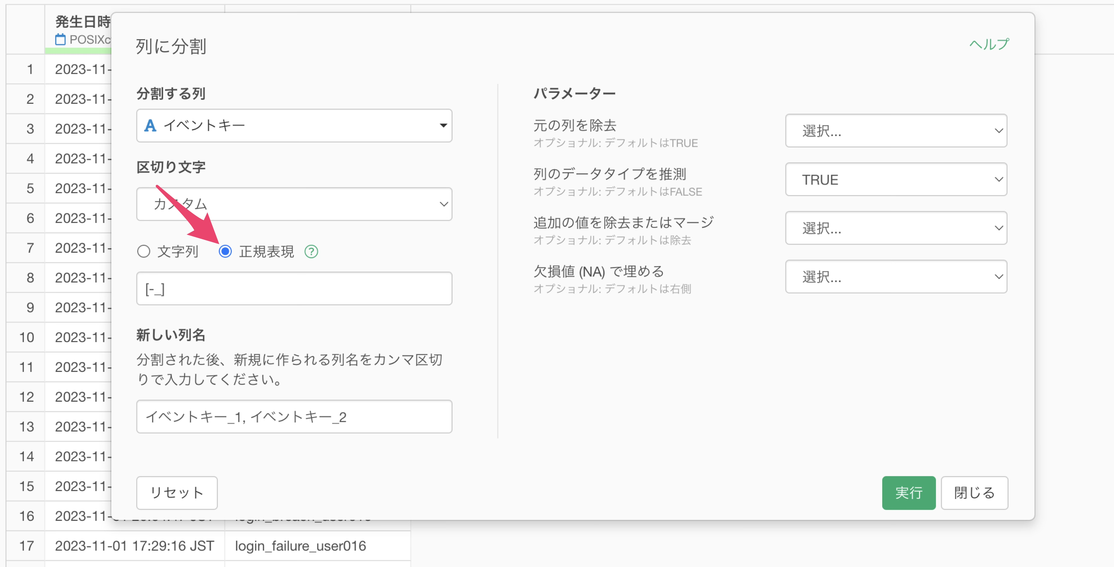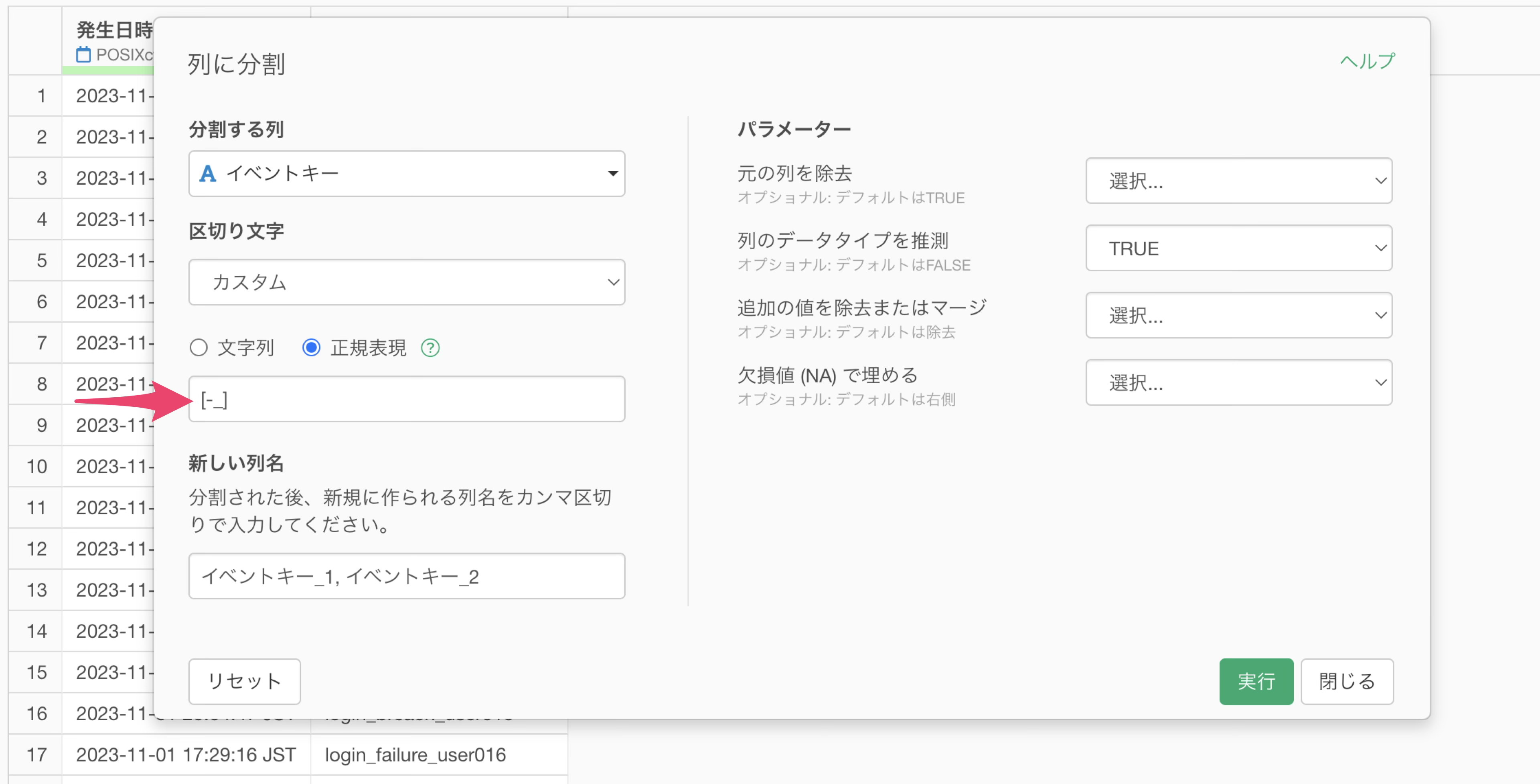 なお、今回のようなデータの場合、ハイフンであってもアンダースコアであっても出現したら列に分割する処理をしてもらいたいため、最初に出てくるといった条件を設定する必要はありません。