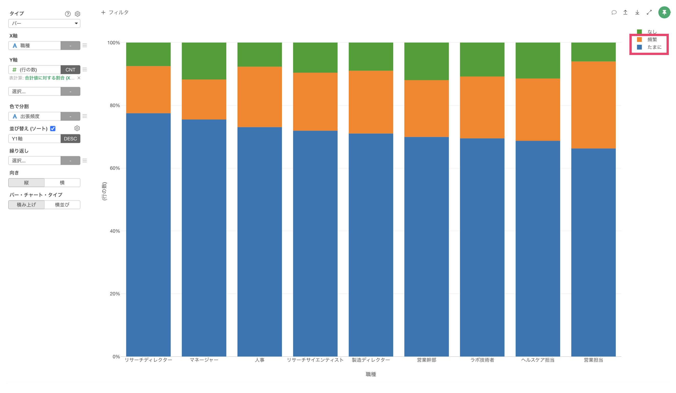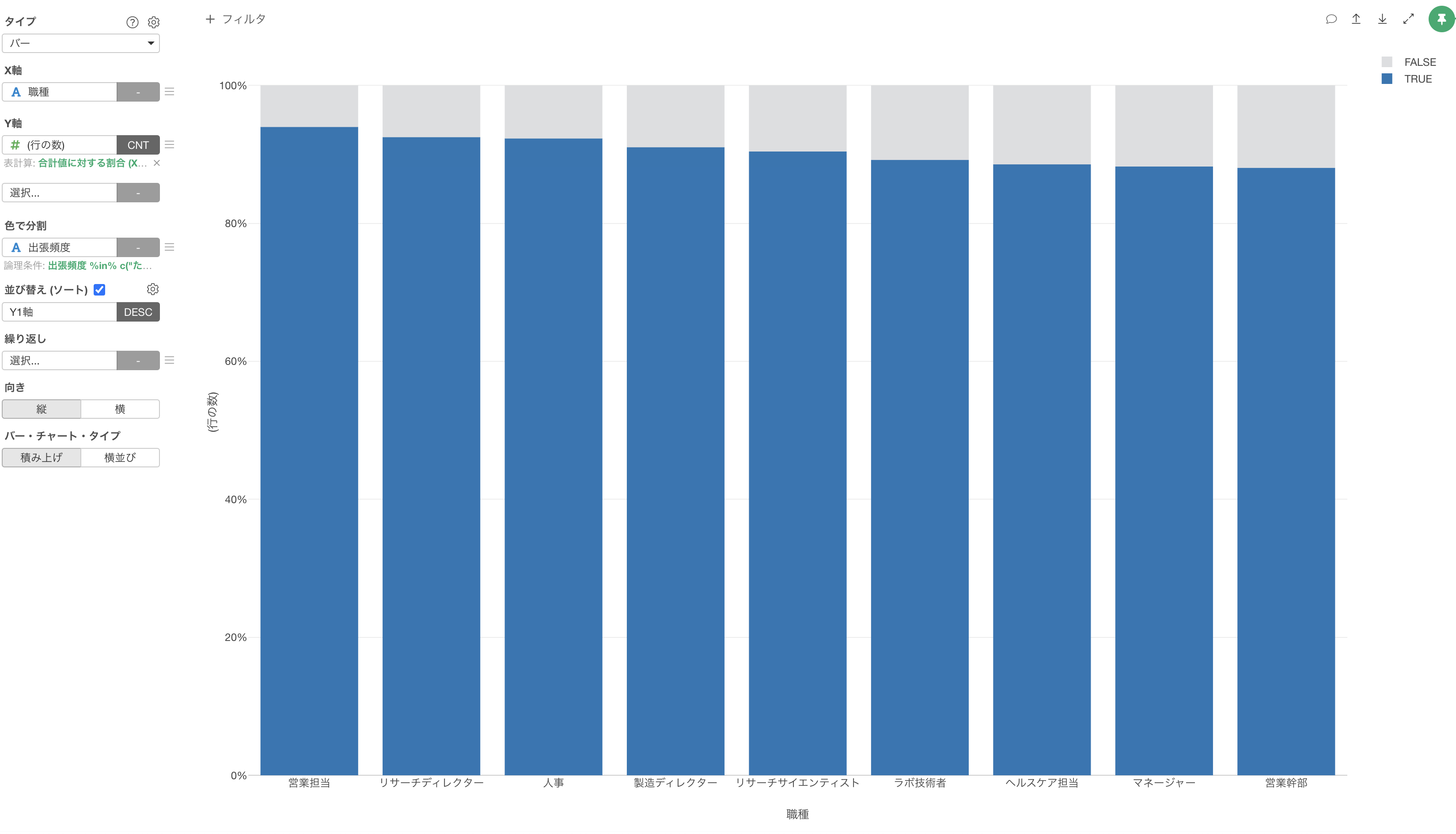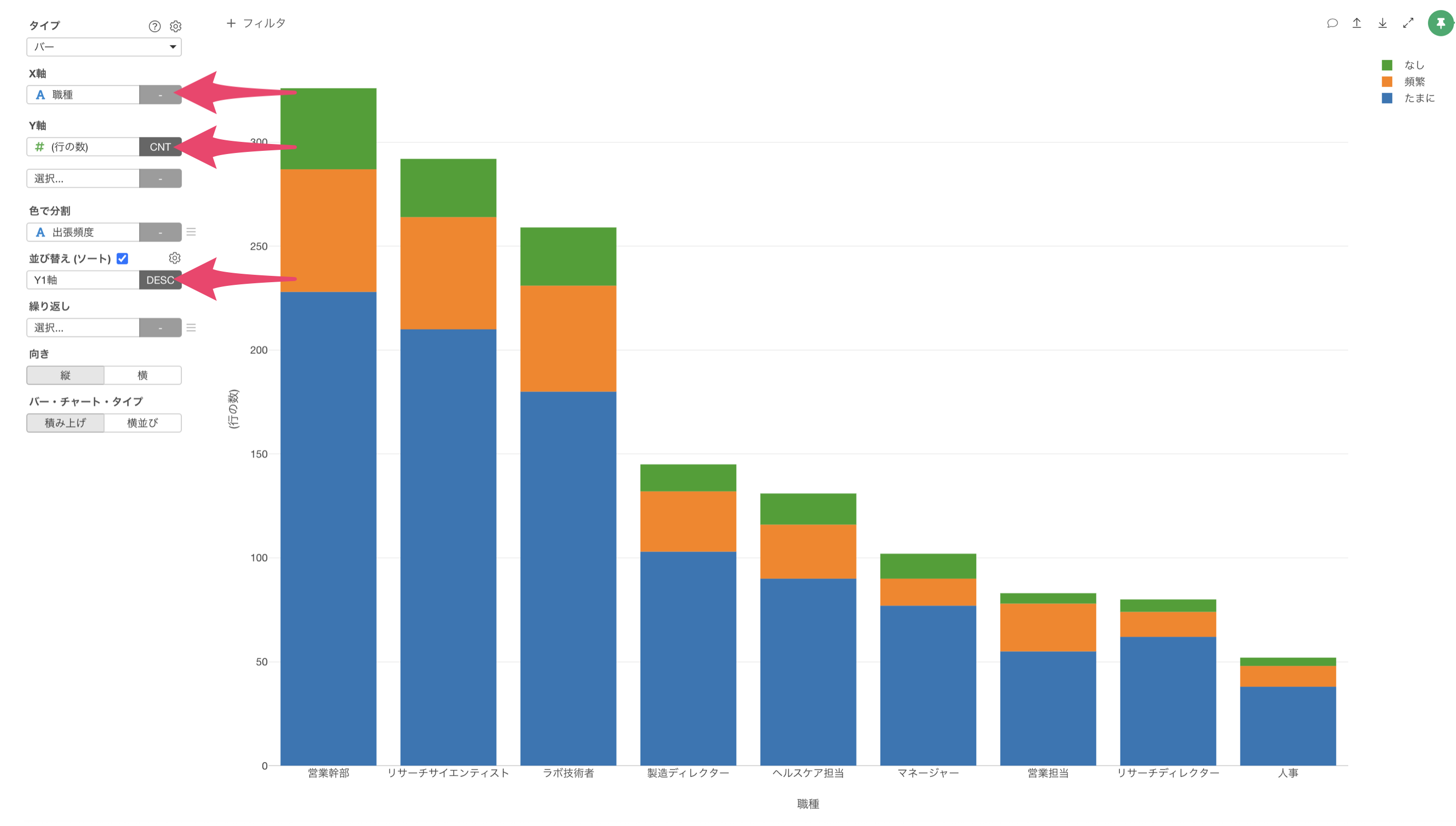 バーチャートにて、X軸に「職種」を、Y軸には「行の数(従業員数)」を割り当てます。 次に、「色で分割」に「出張頻度」を割り当てて、職種ごとの出張頻度を可視化します。