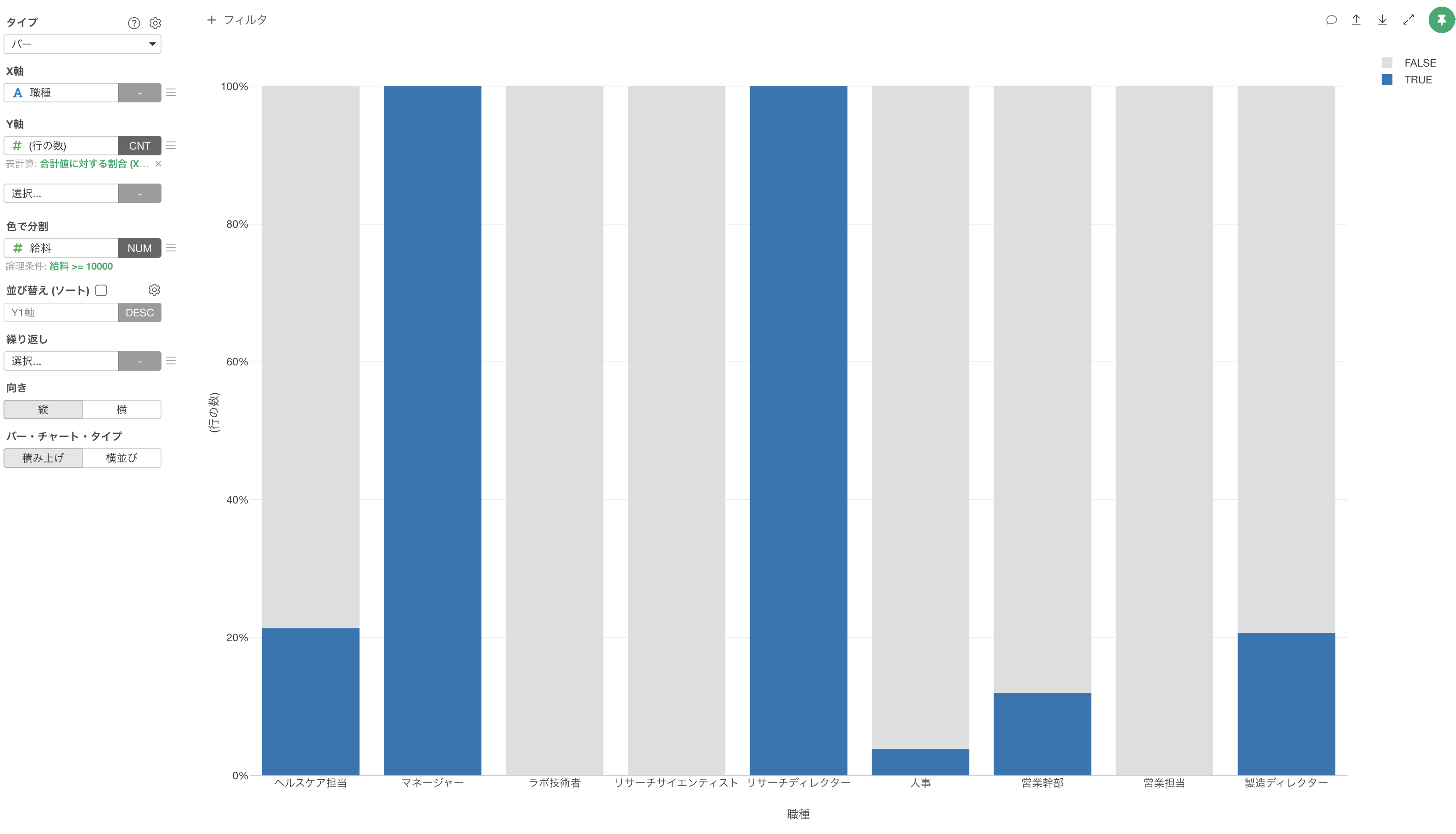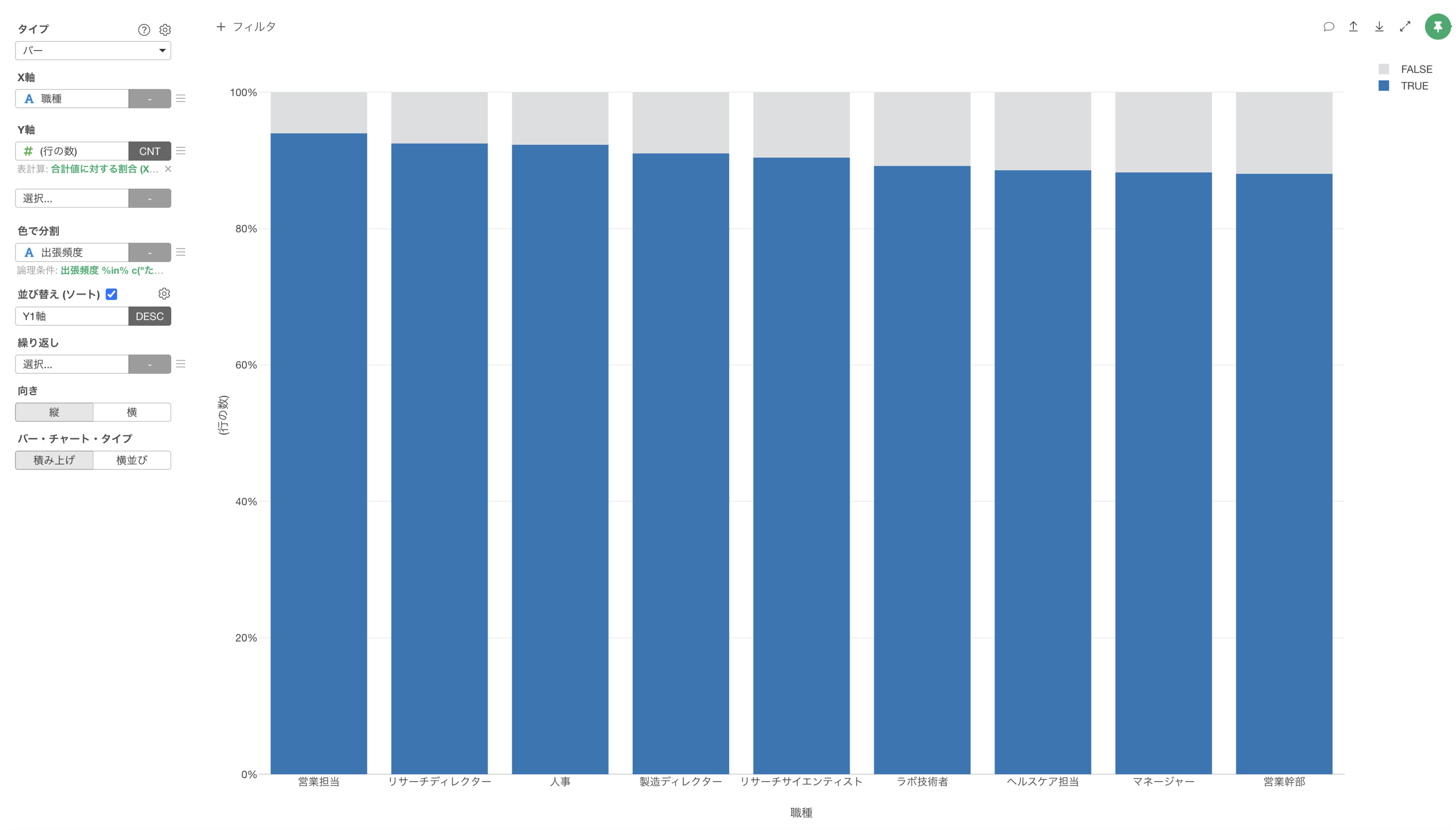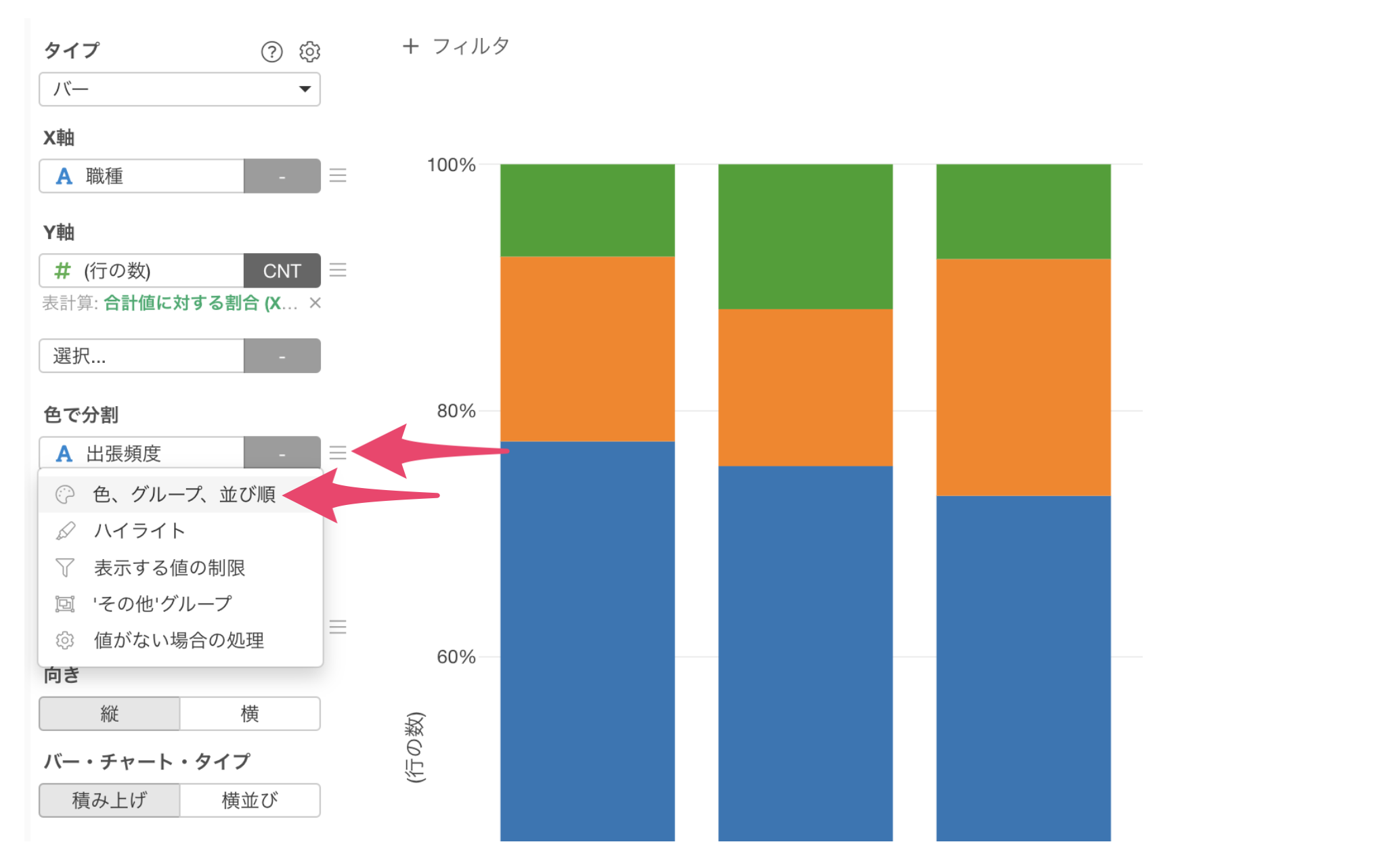バーチャートにて、X軸に「職種」を、Y軸には「行の数(従業員数)」を割り当てます。 次に、「色で分割」に「出張頻度」を割り当てて、職種ごとの出張頻度を可視化します。