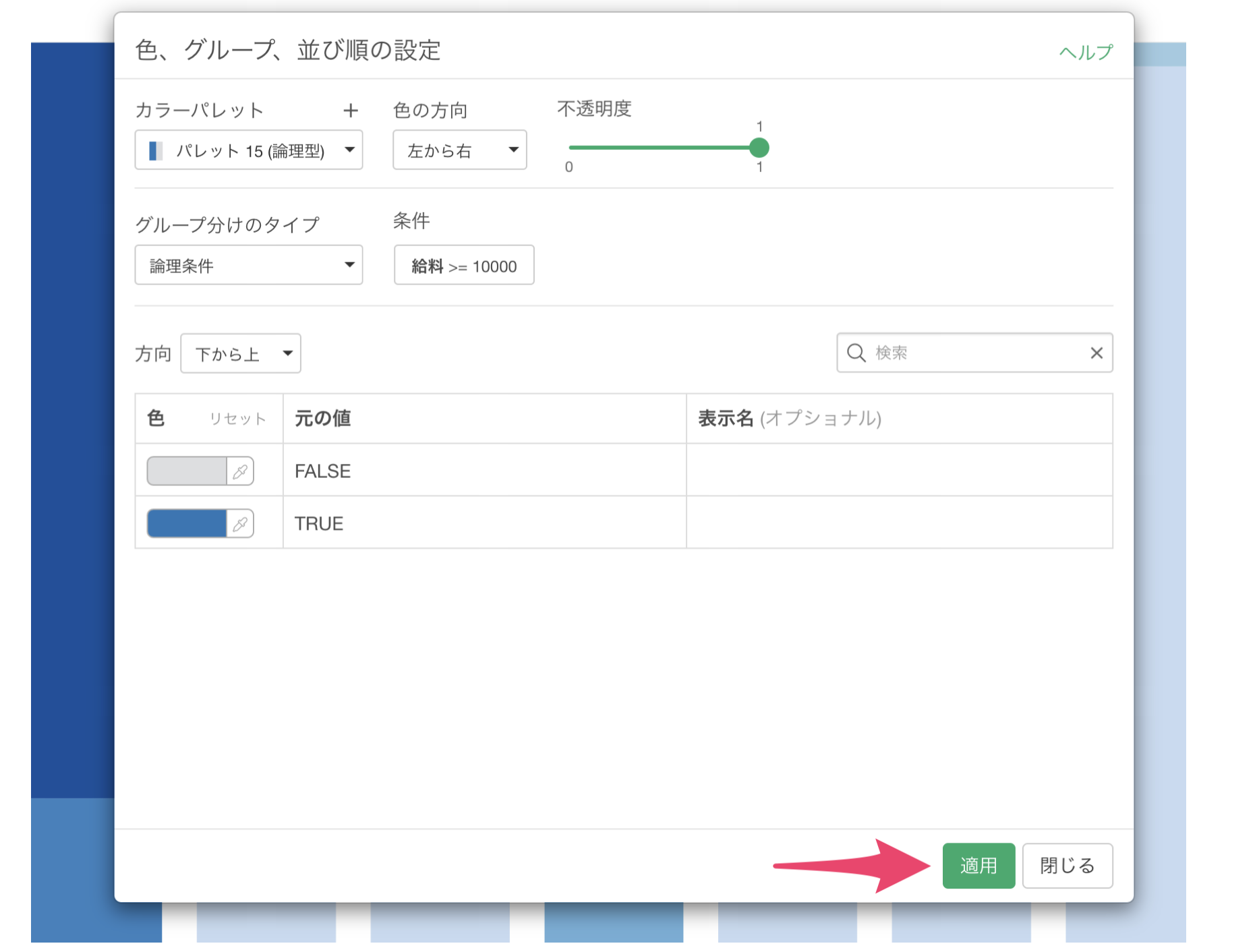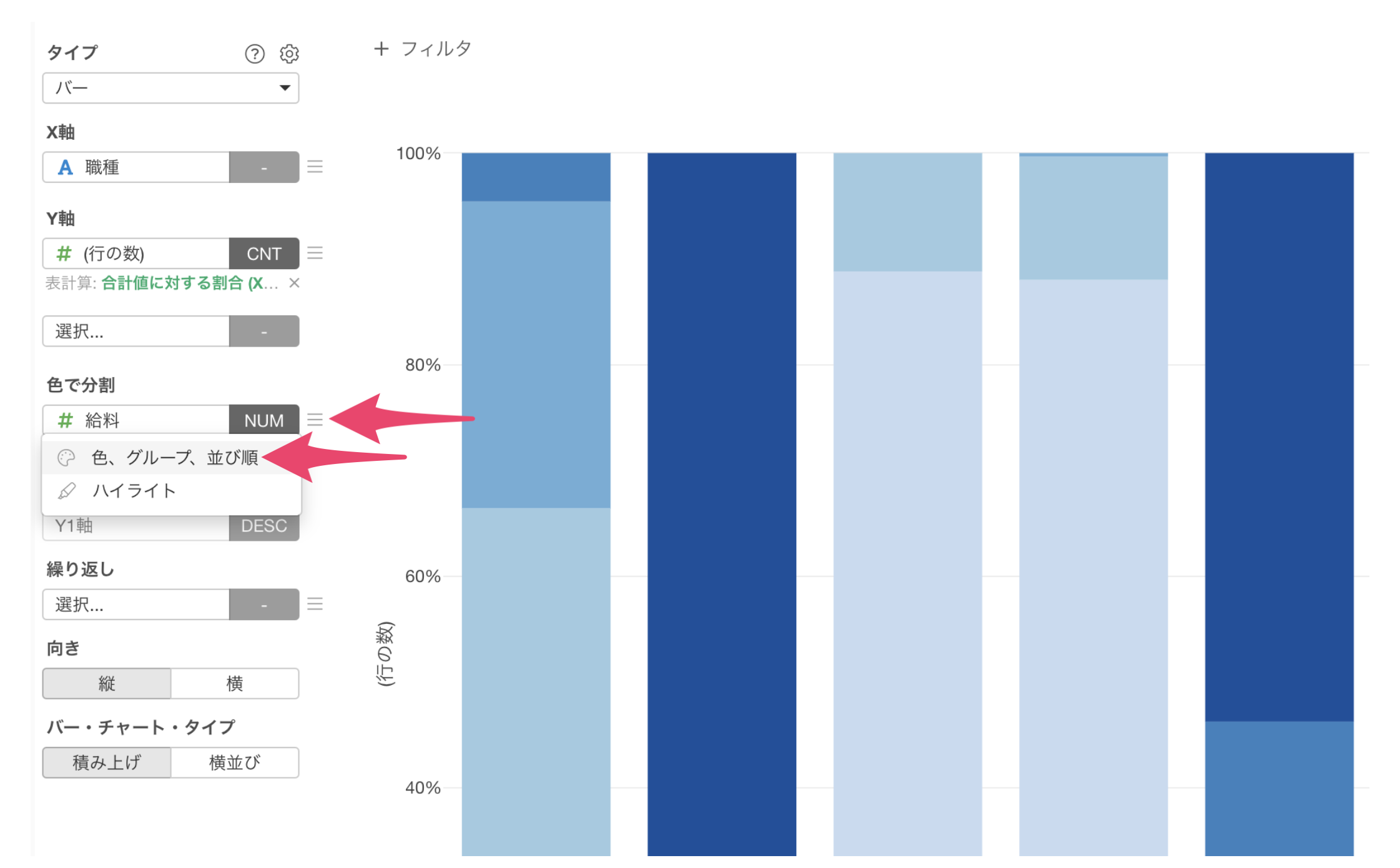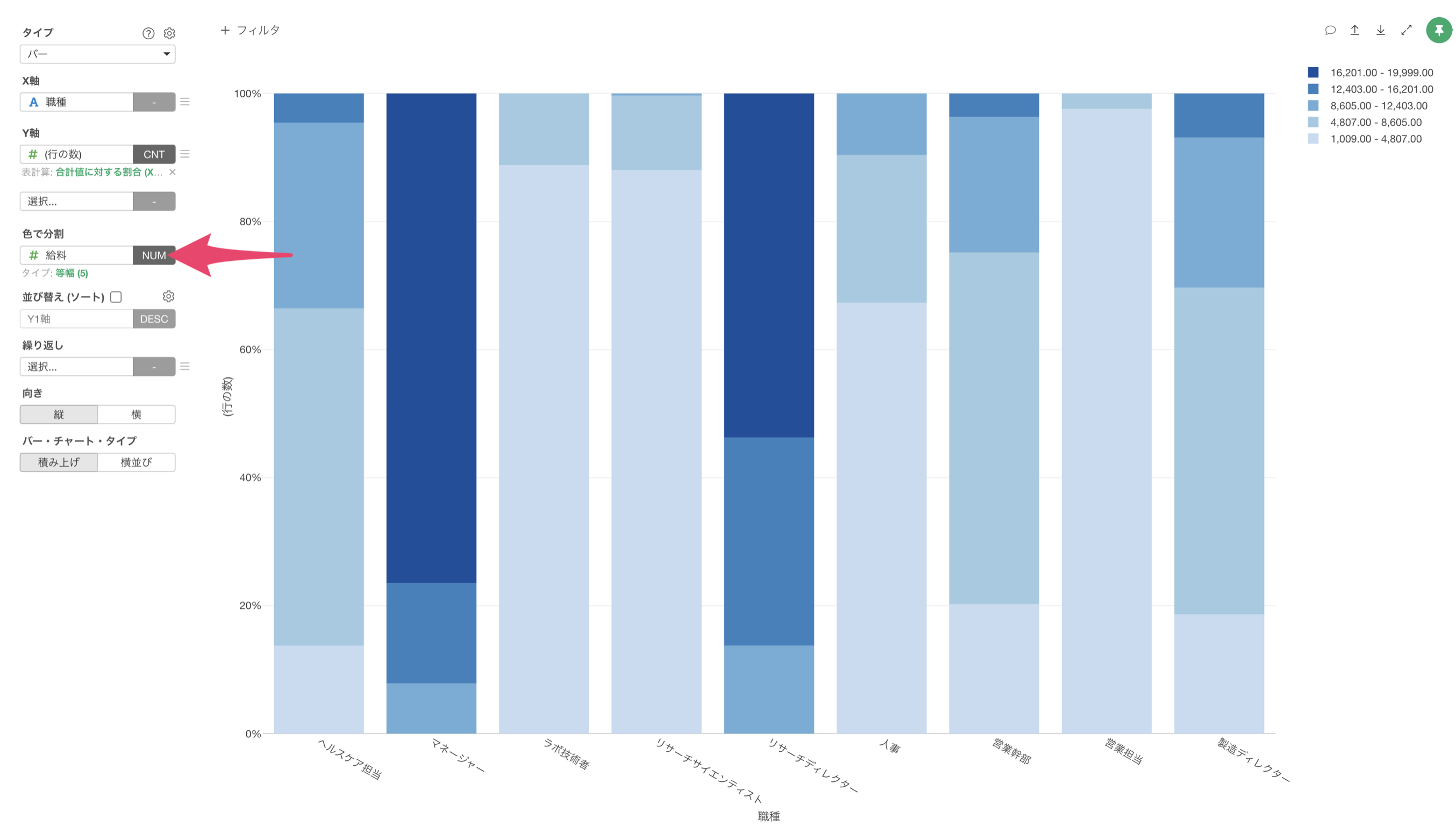 上記と同様の手順でバーチャートを作成しますが、「色で分割」には数値列である「給料」を割り当てます。