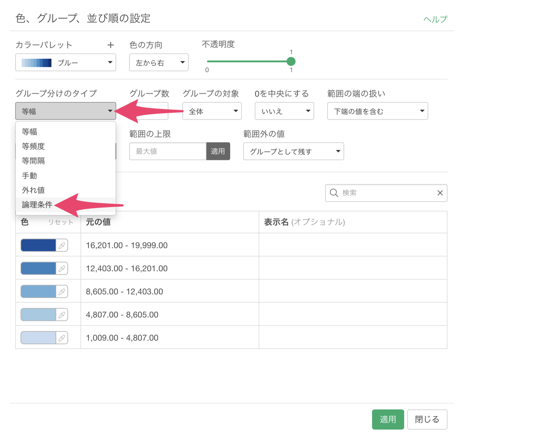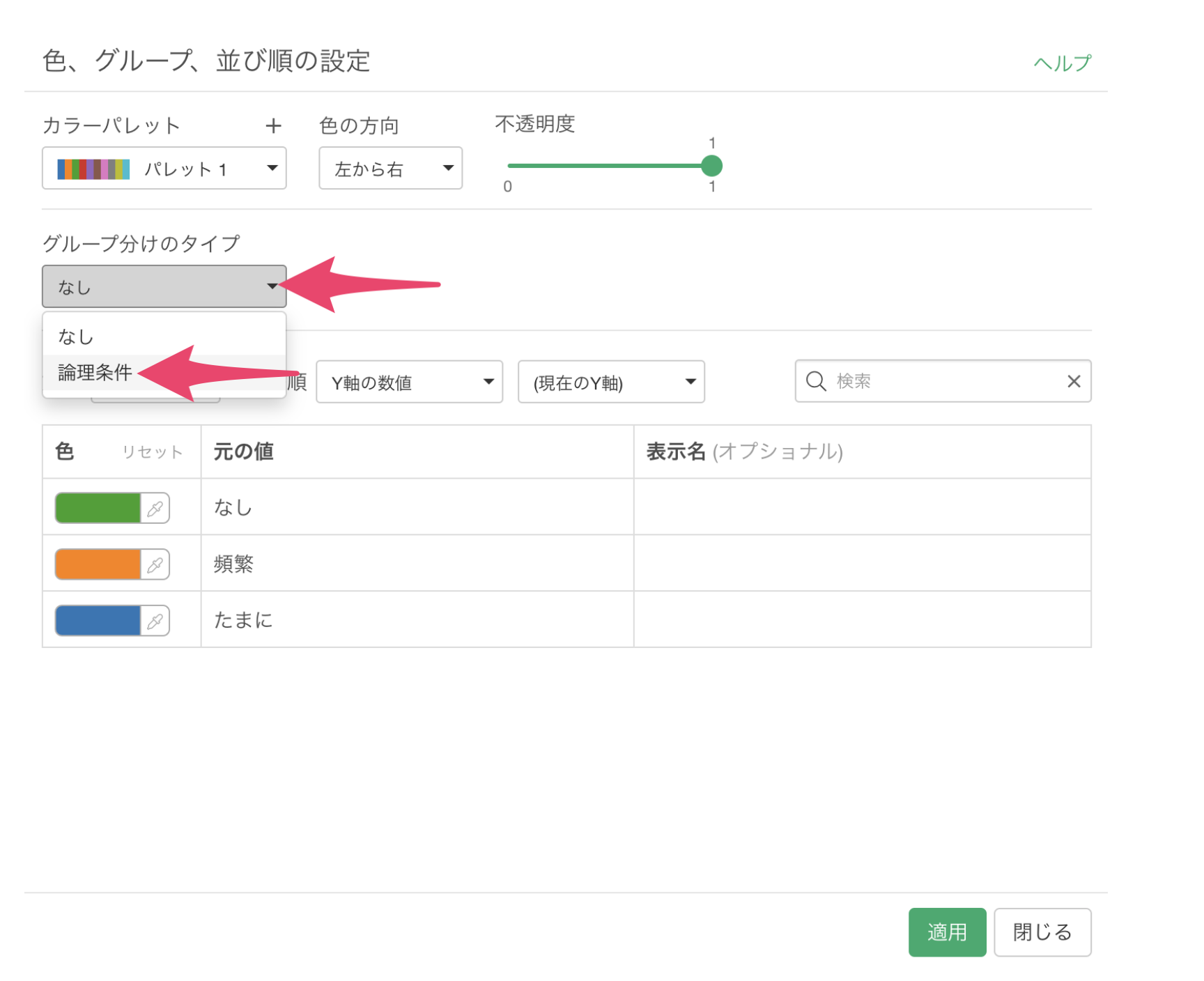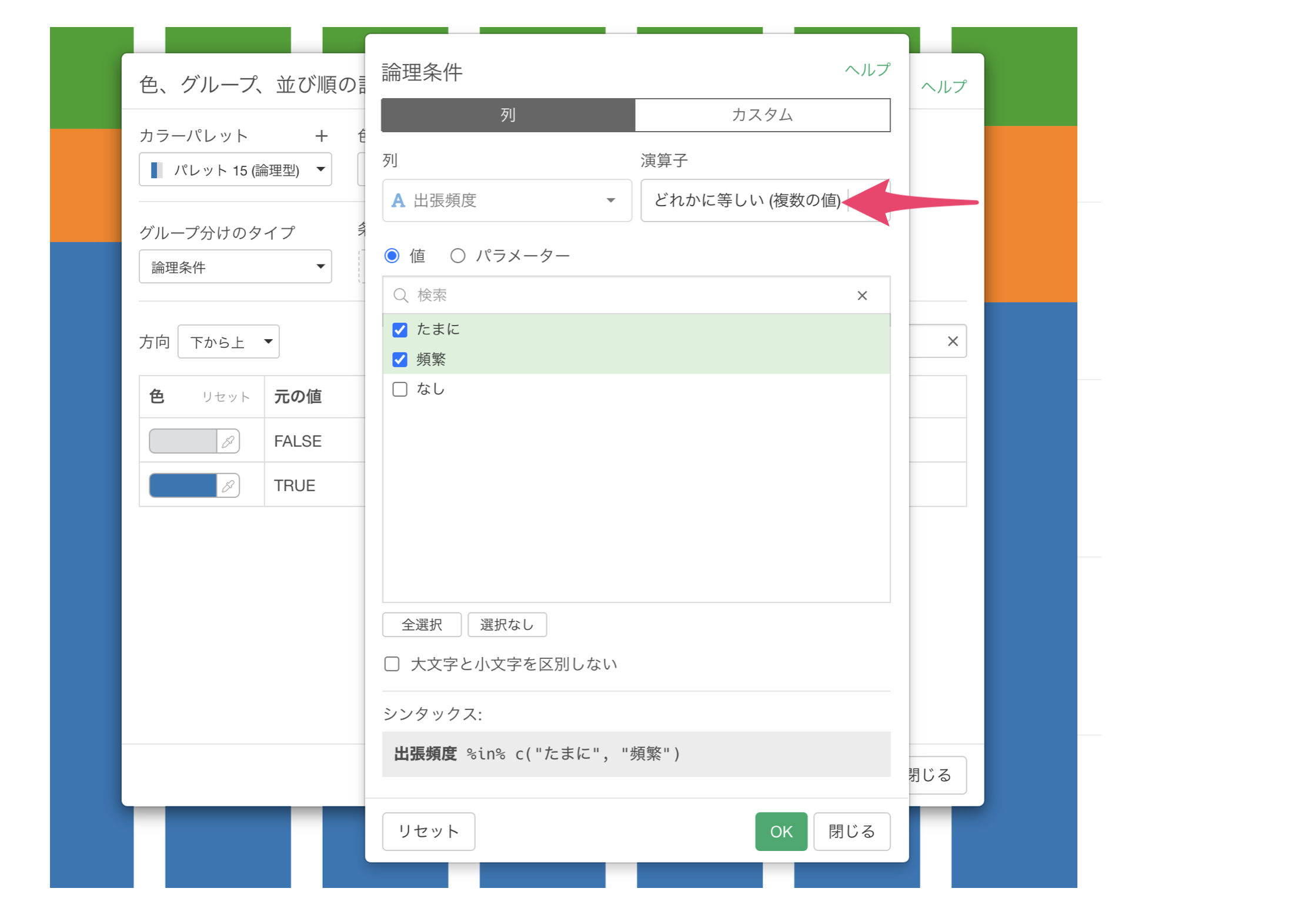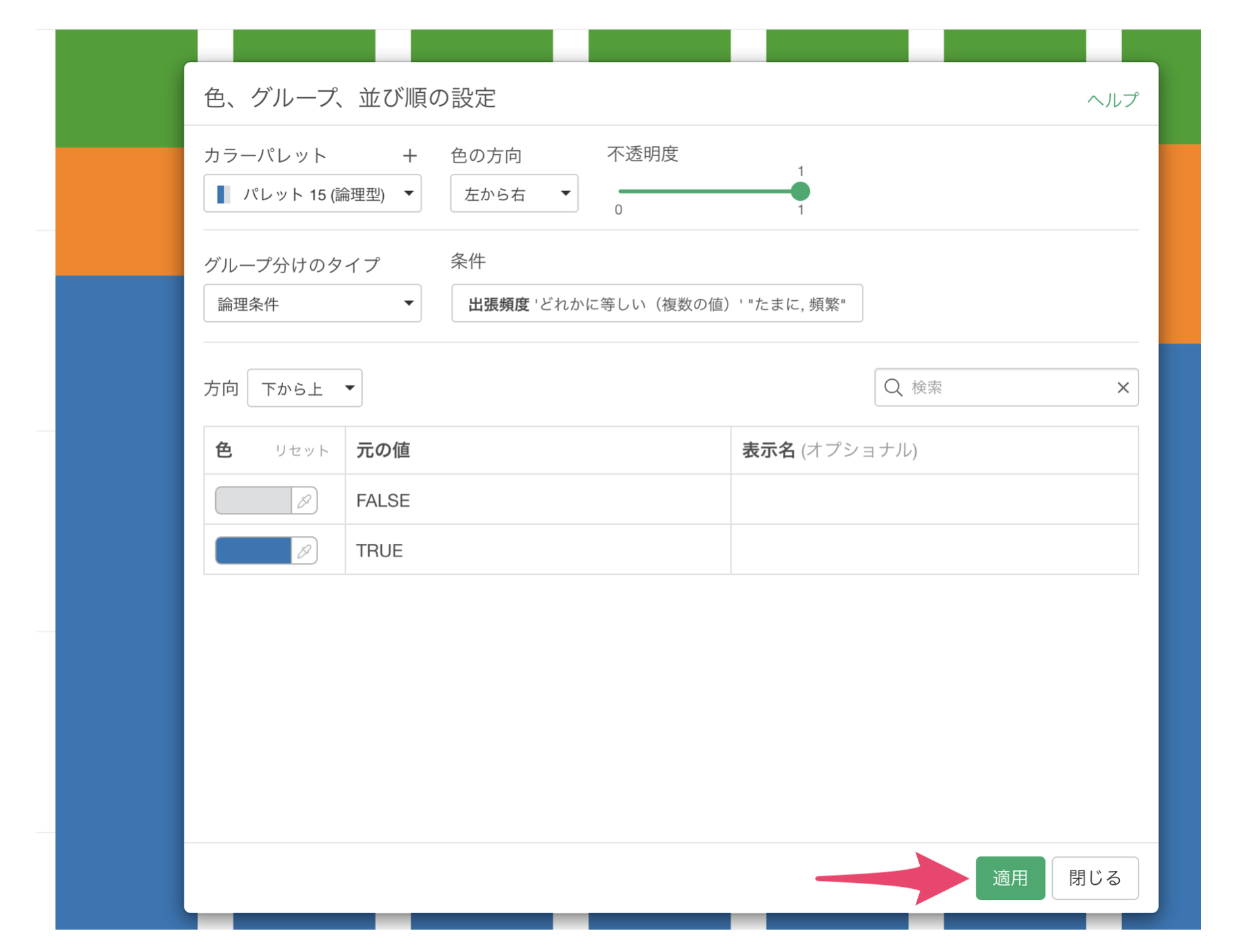 Exploratoryの「色で分割」機能と「論理条件」オプションを使用して、条件にマッチした値の割合を可視化します。