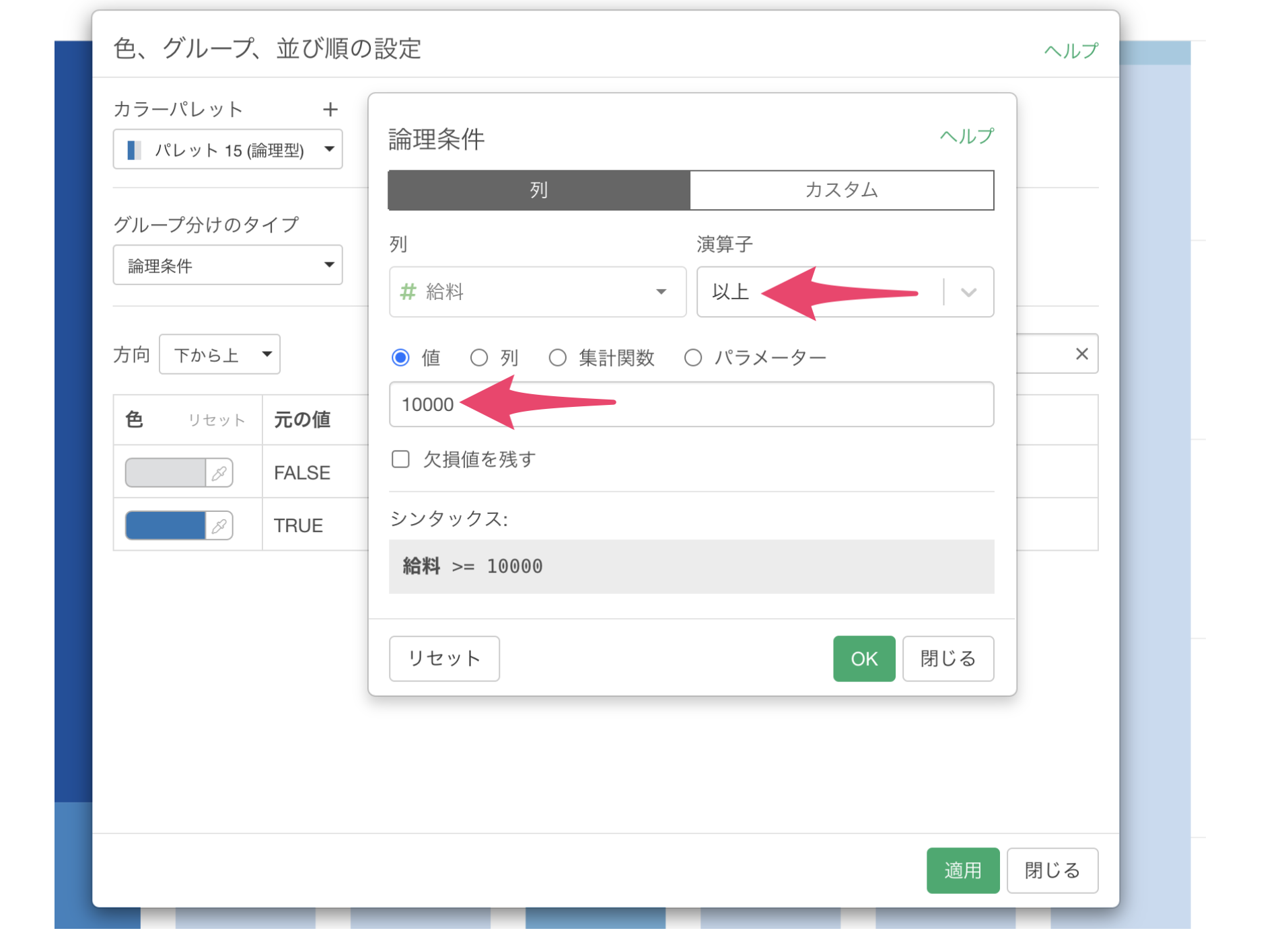 条件設定では演算子に「以上」を選び、値として「10000」(1万ドル)を入力します。