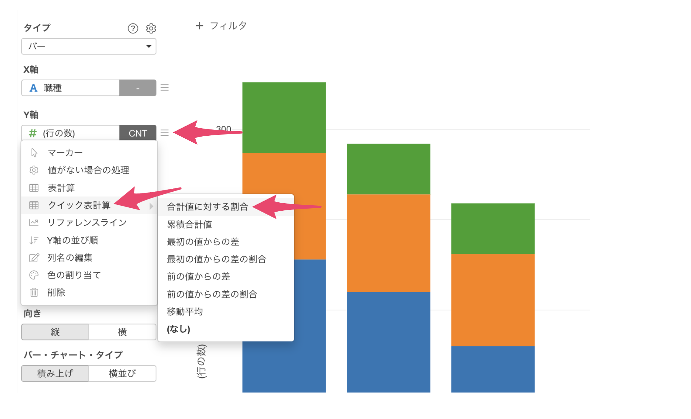 割合として表示するために、Y軸のメニューから「クイック表計算」の「合計値に対する割合」を選択します。