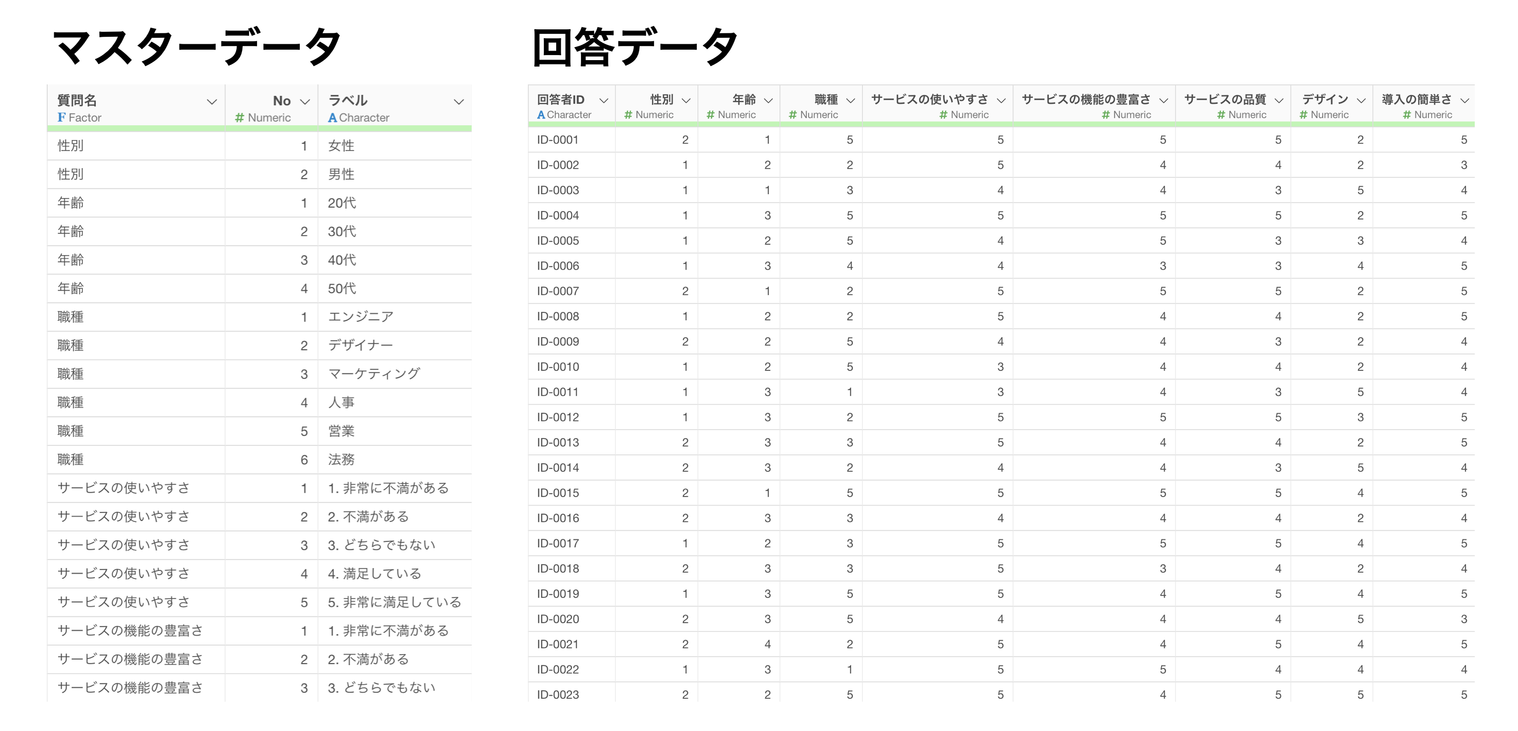 そこで、回答データにある回答コードをマスタデータにあるラベルで置き換えていきます。