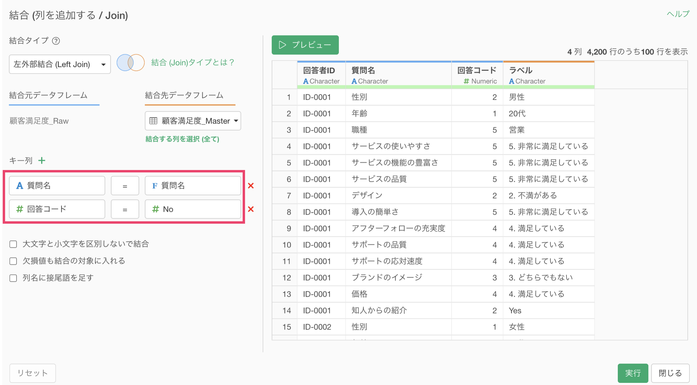 結合先のデータフレームとしてマスターデータを選択し、キー列として「質問名」と「回答のナンバー」に対応する列を指定します。