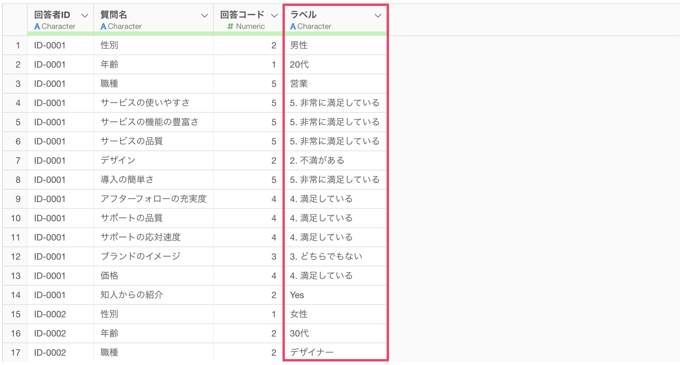 実行することで、質問コードだった値をラベルに変更することができました。