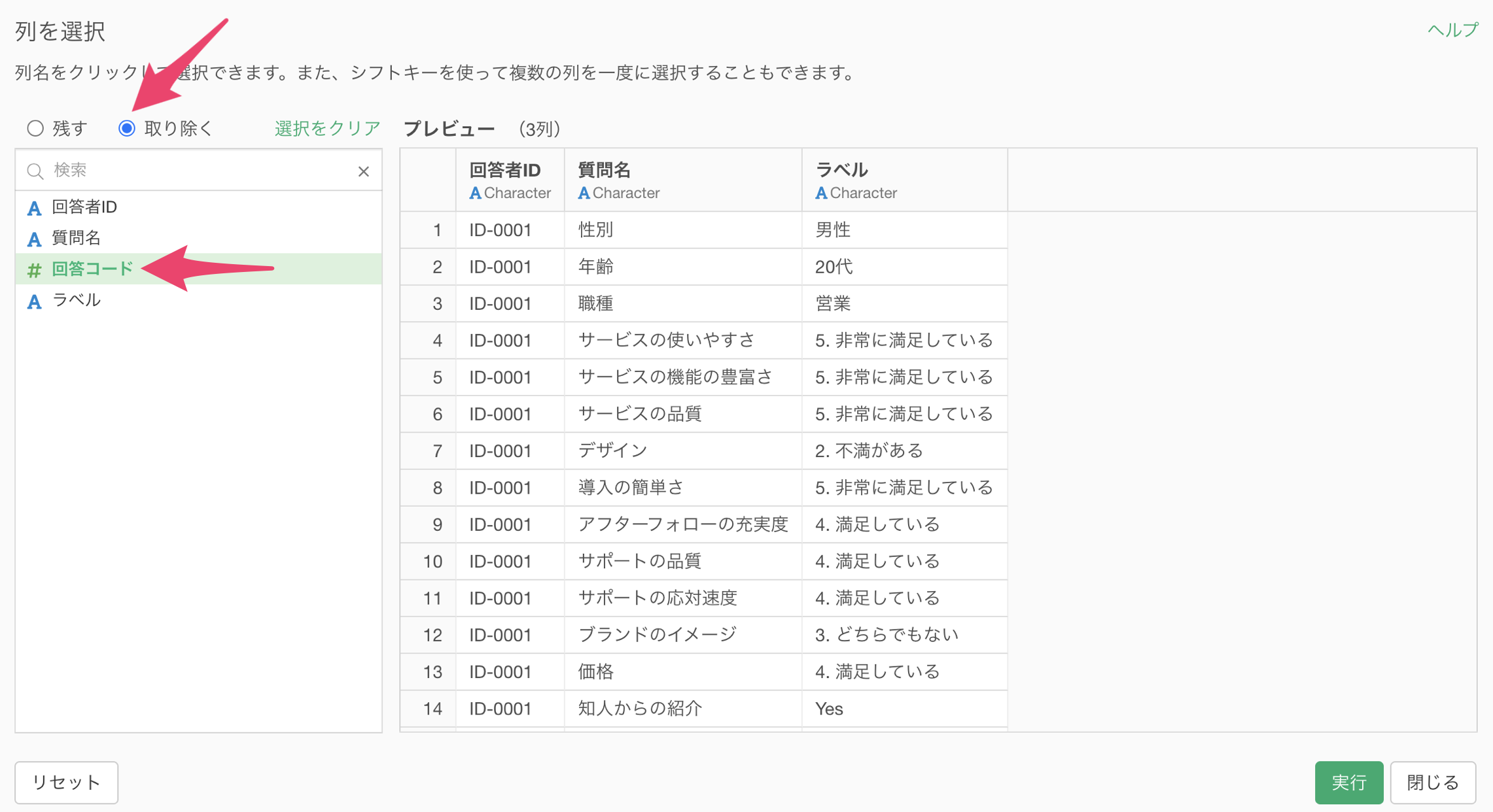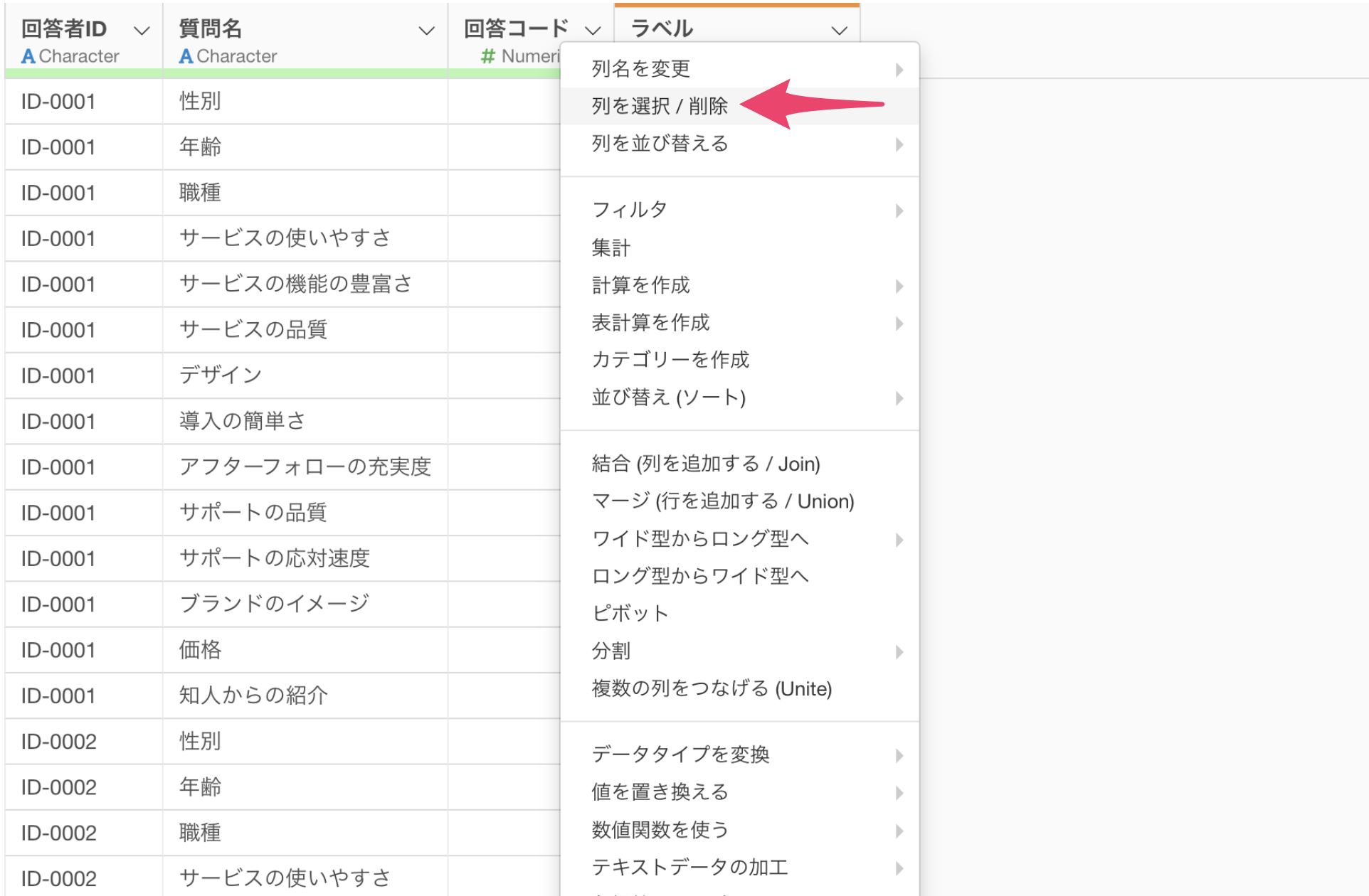 「回答コード」の列ヘッダメニューから「列を選択/削除」を使用します。
