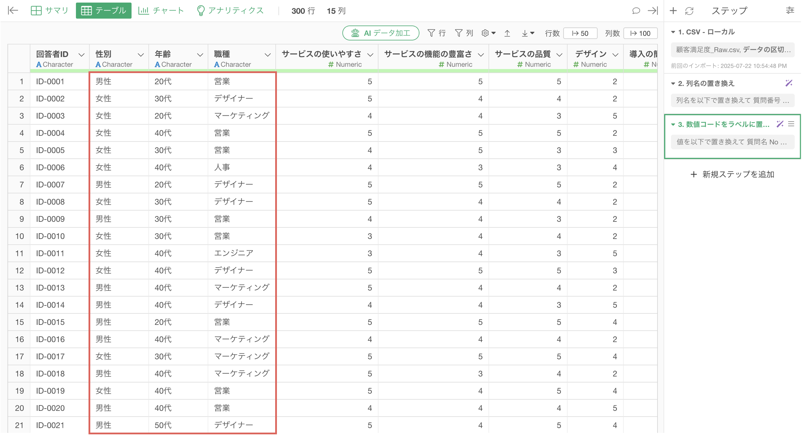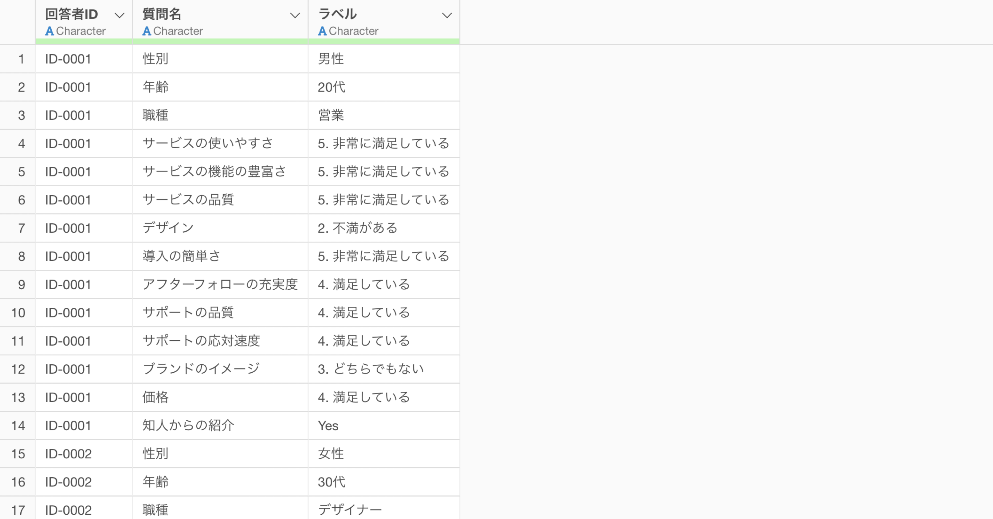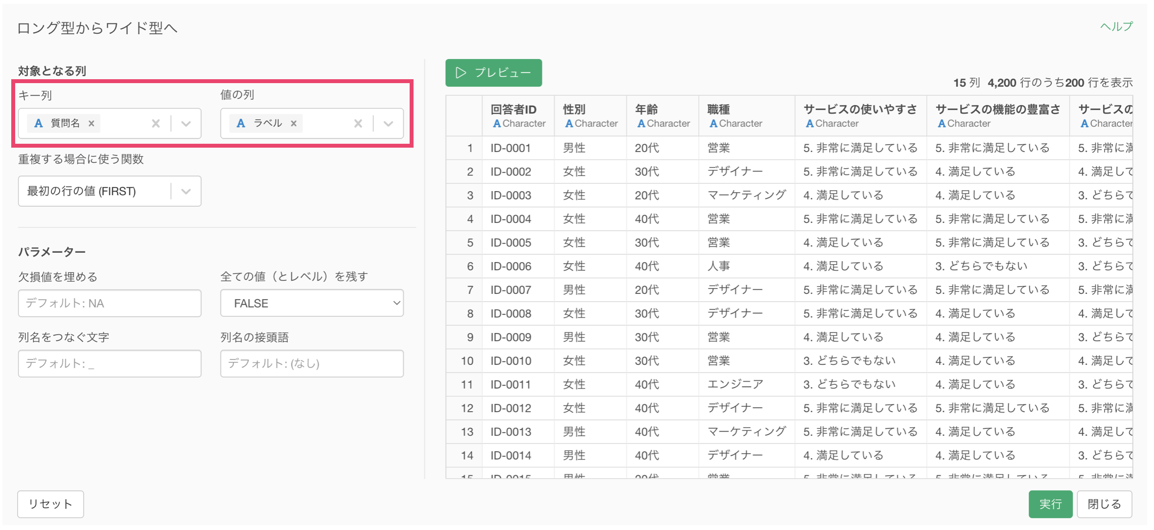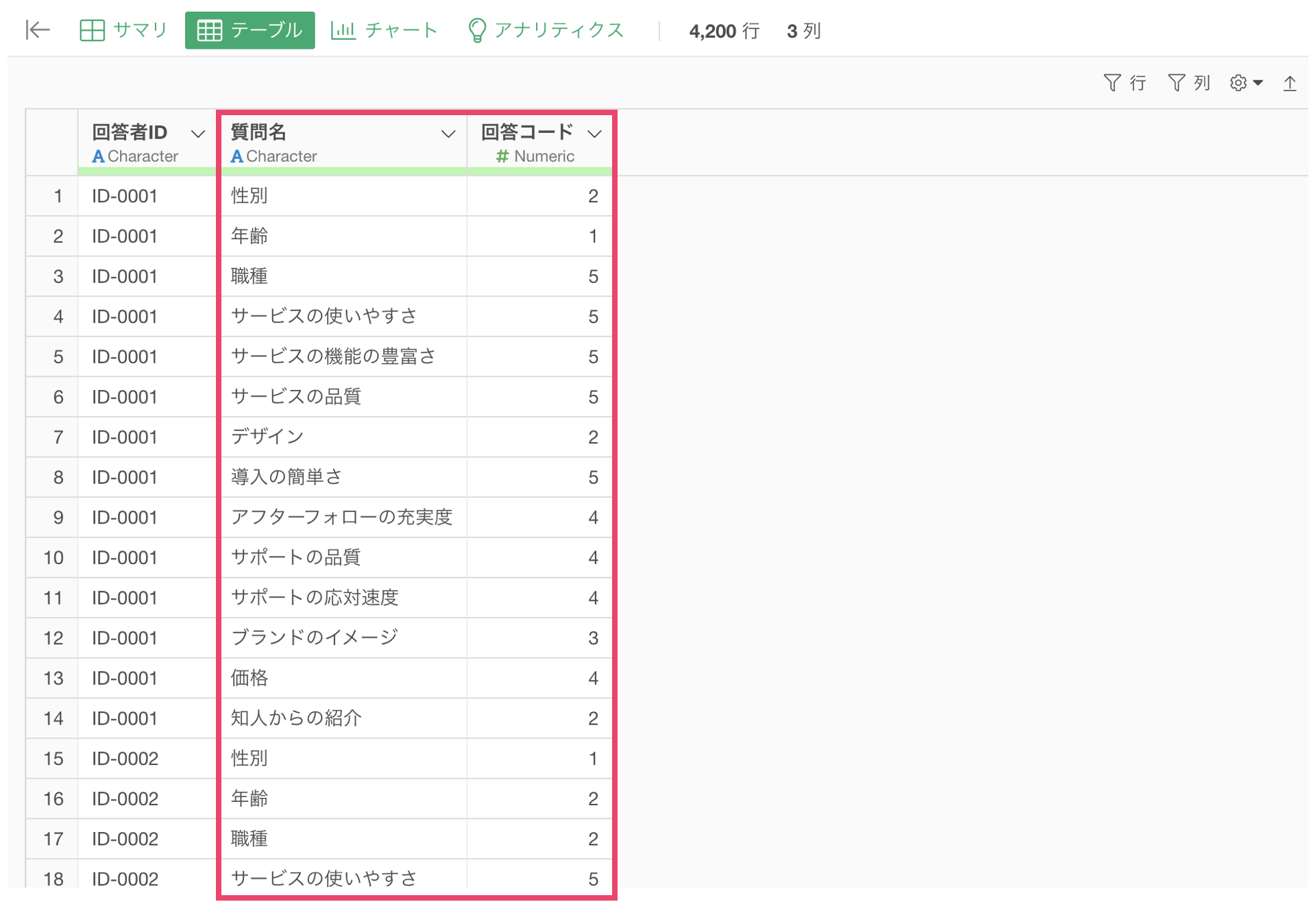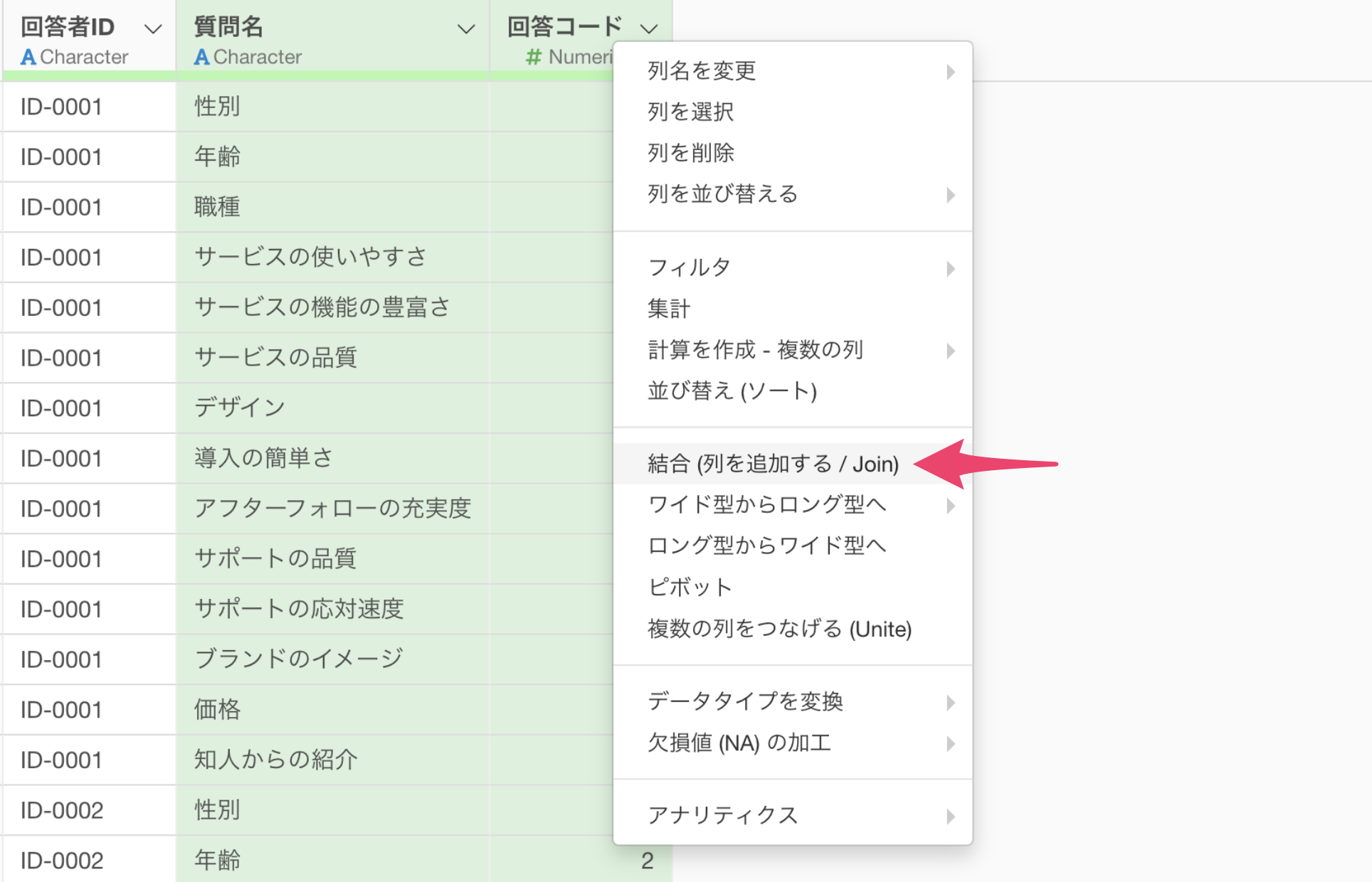 まず、アンケートデータをマスターデータと結合できる形式に変換します。