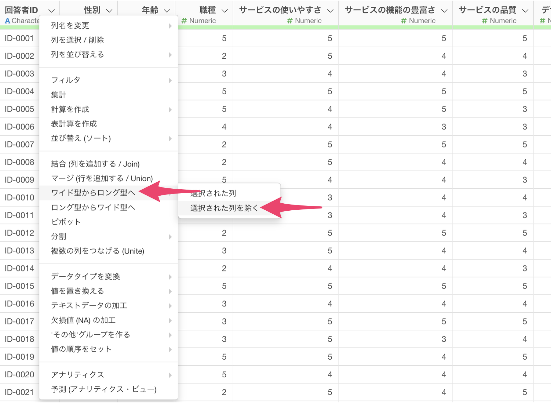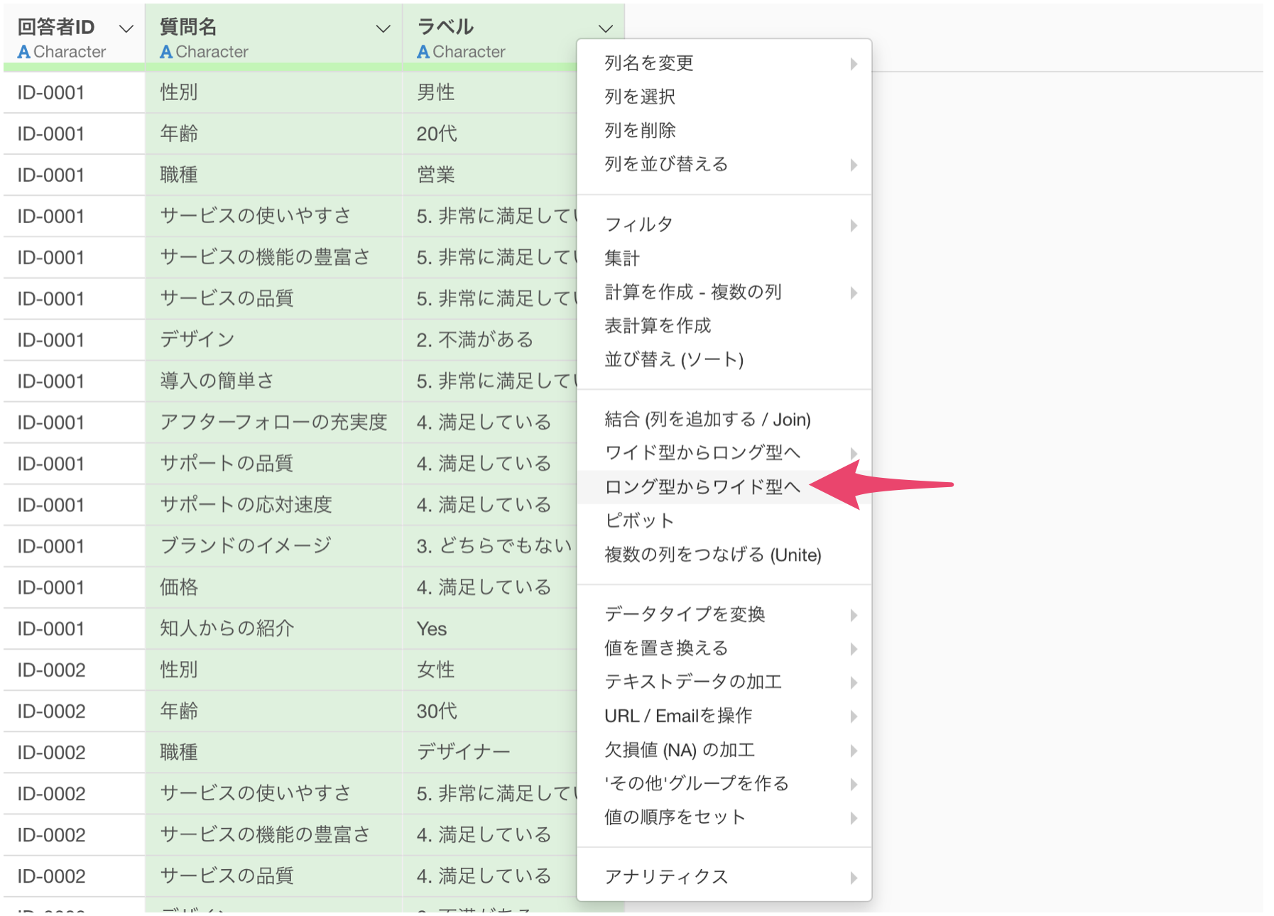 回答者IDの列ヘッダメニューから「ワイド型からロング型へ」の「選択された列」を選択します。