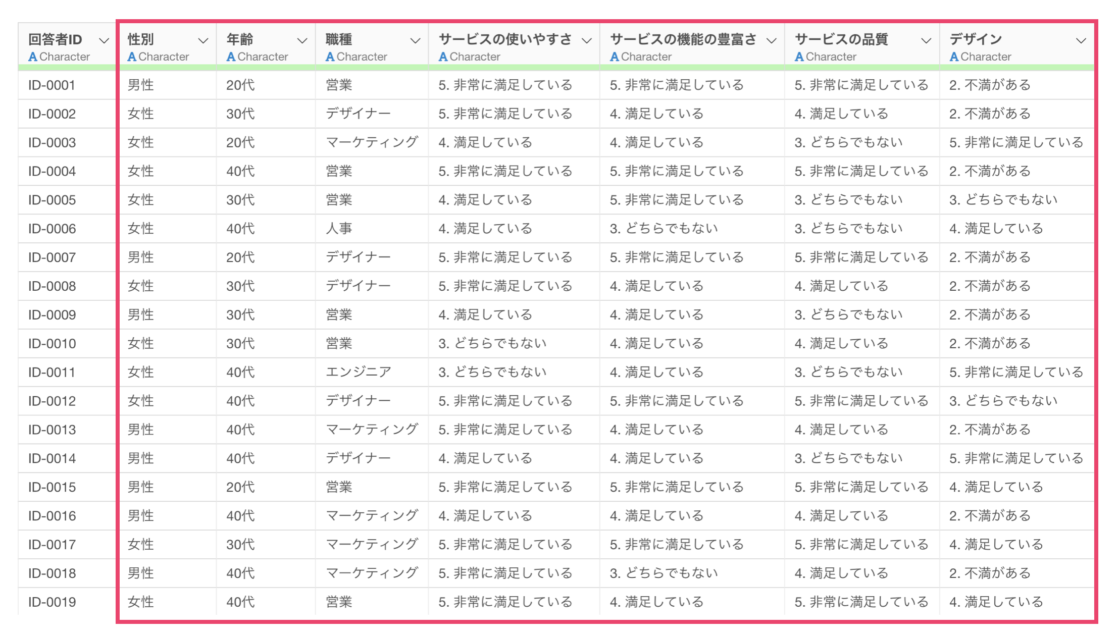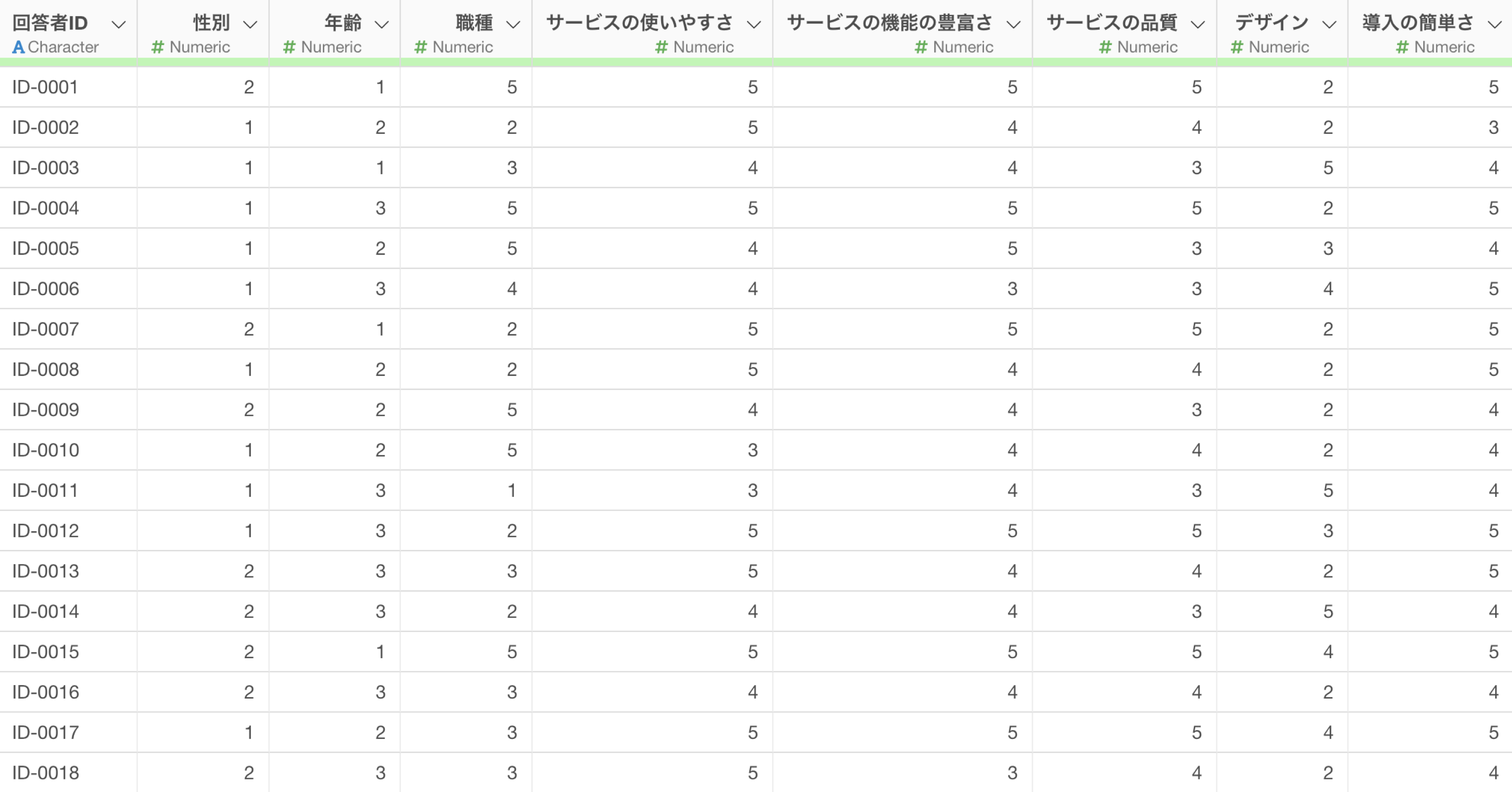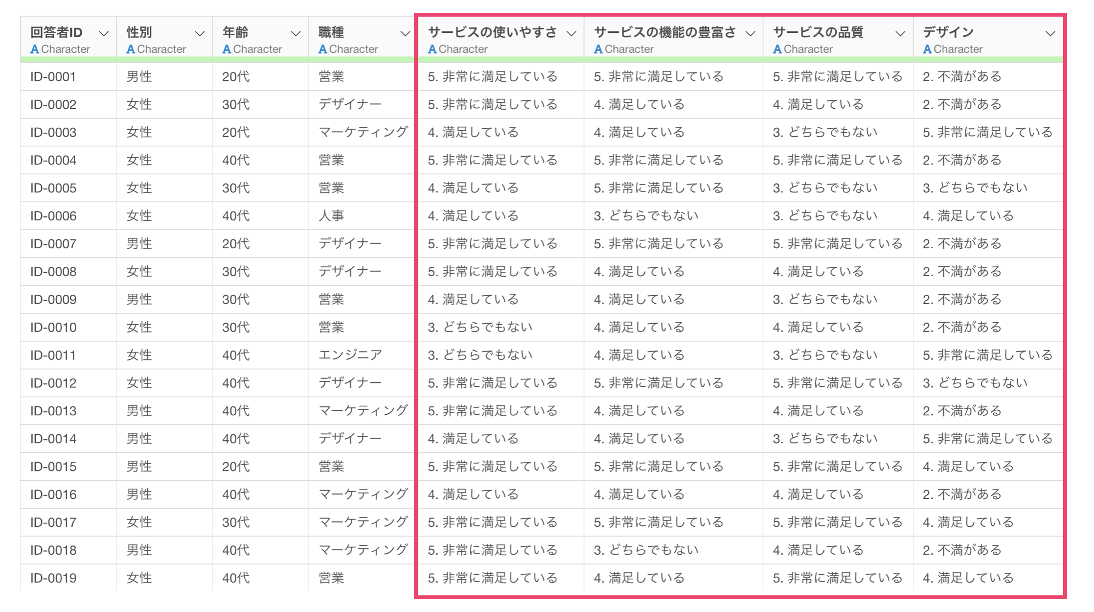 例えば、以下のようなアンケートのデータがあったとします。