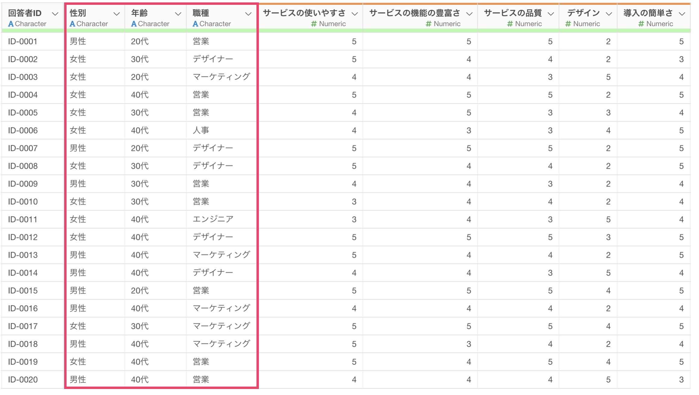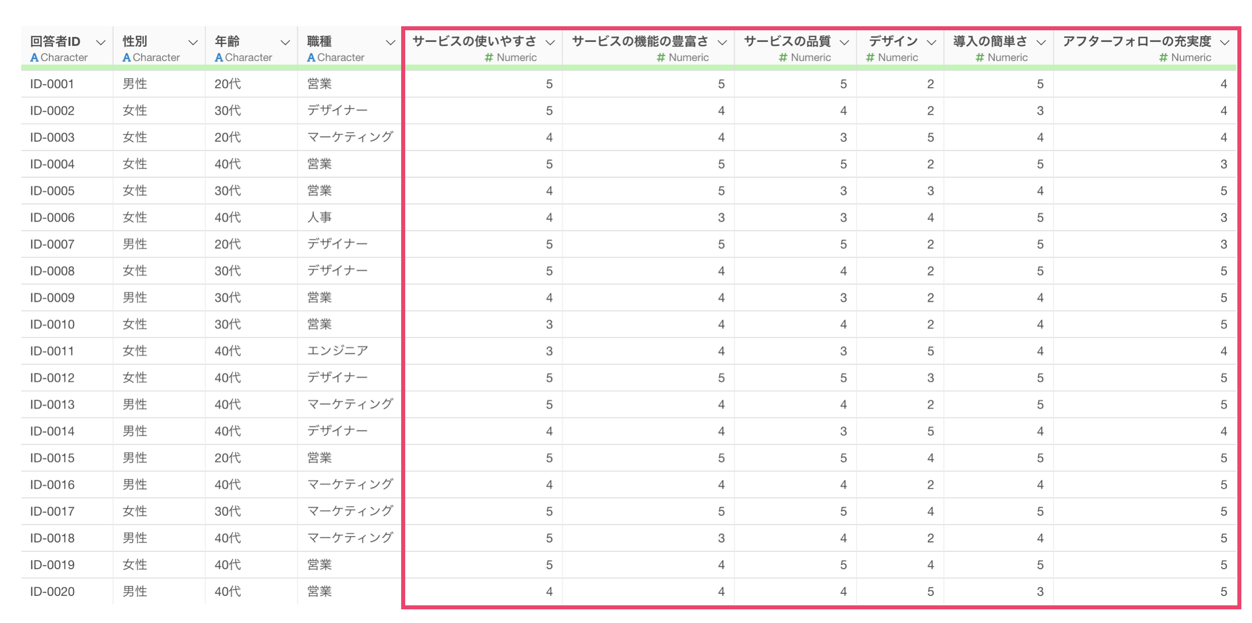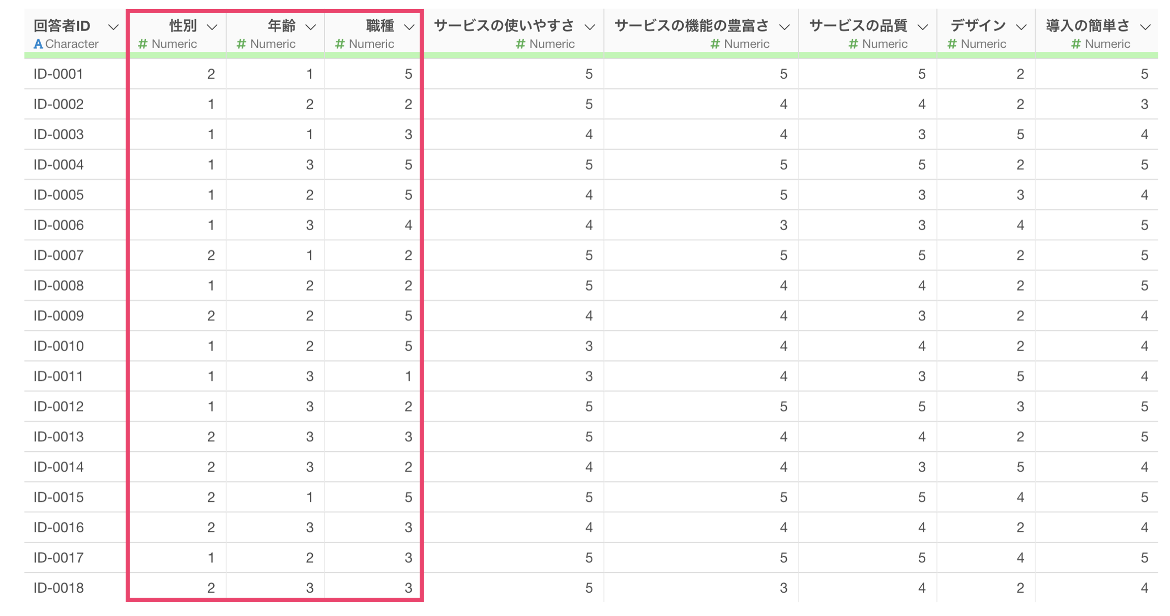 例えば、以下のようなアンケートのデータがあったとします。