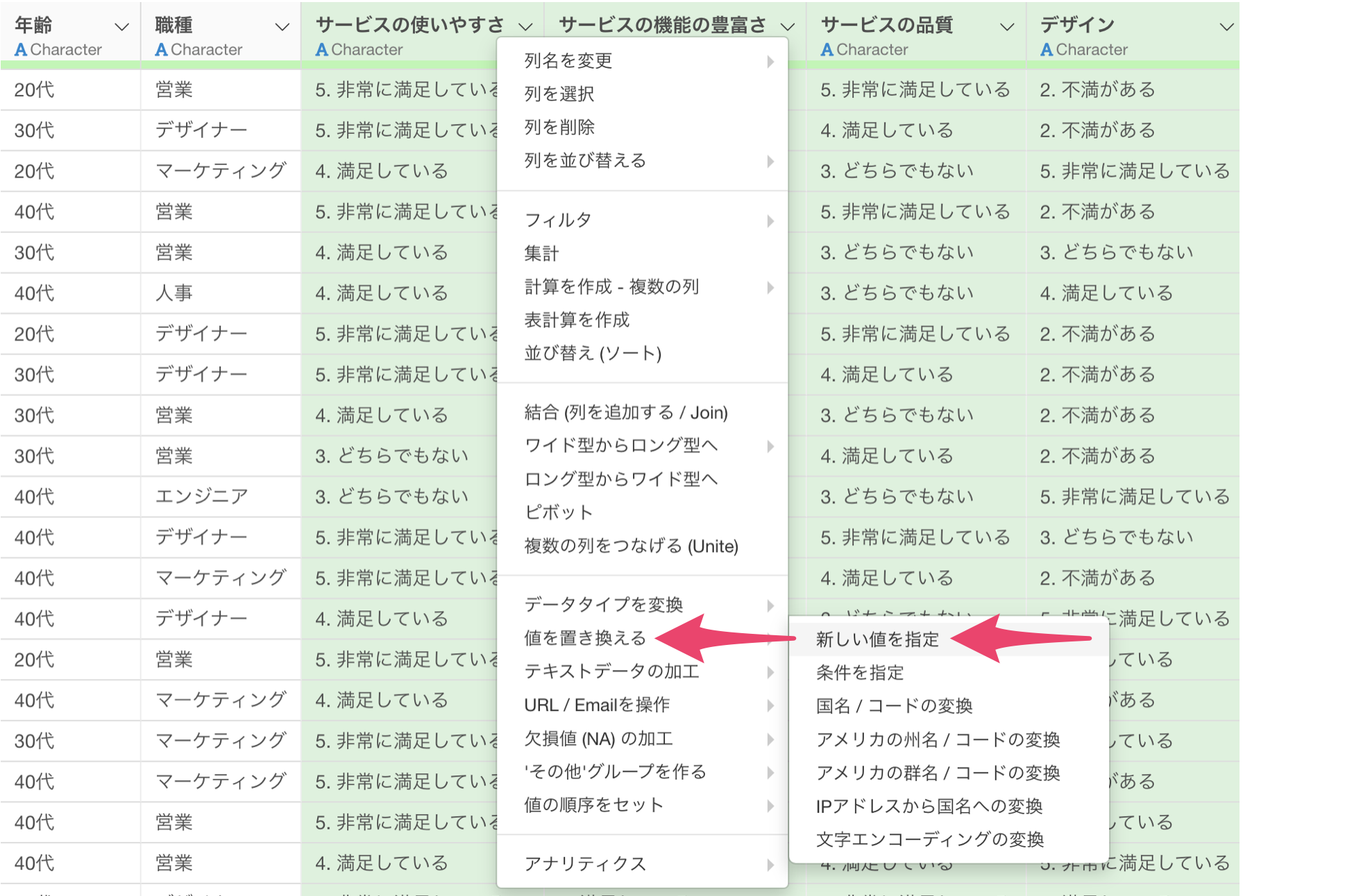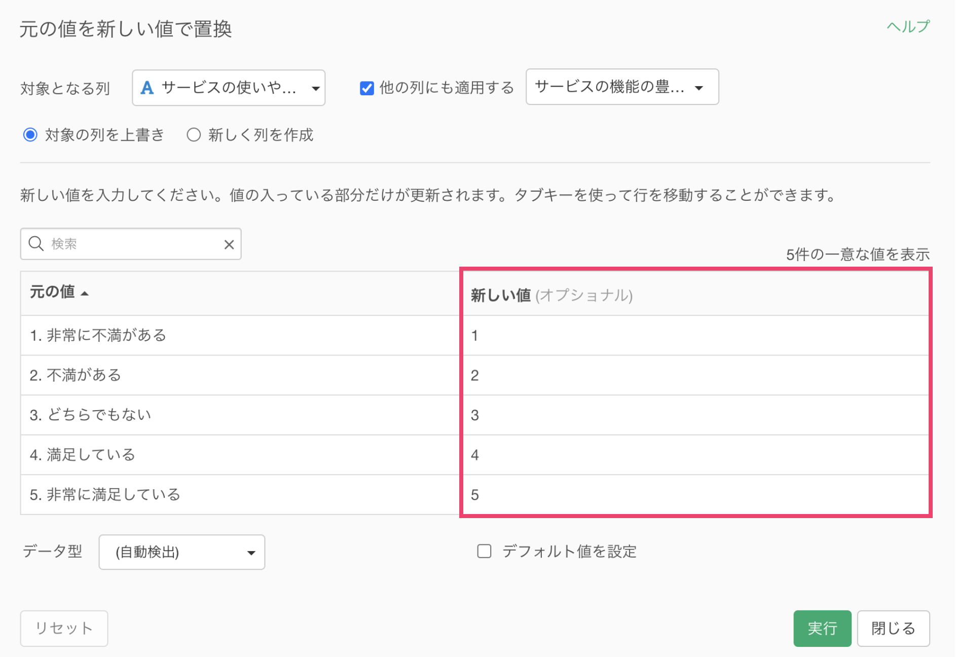 実行することで、5段階評価の文字列データを数値データに置き換えていくことができました。