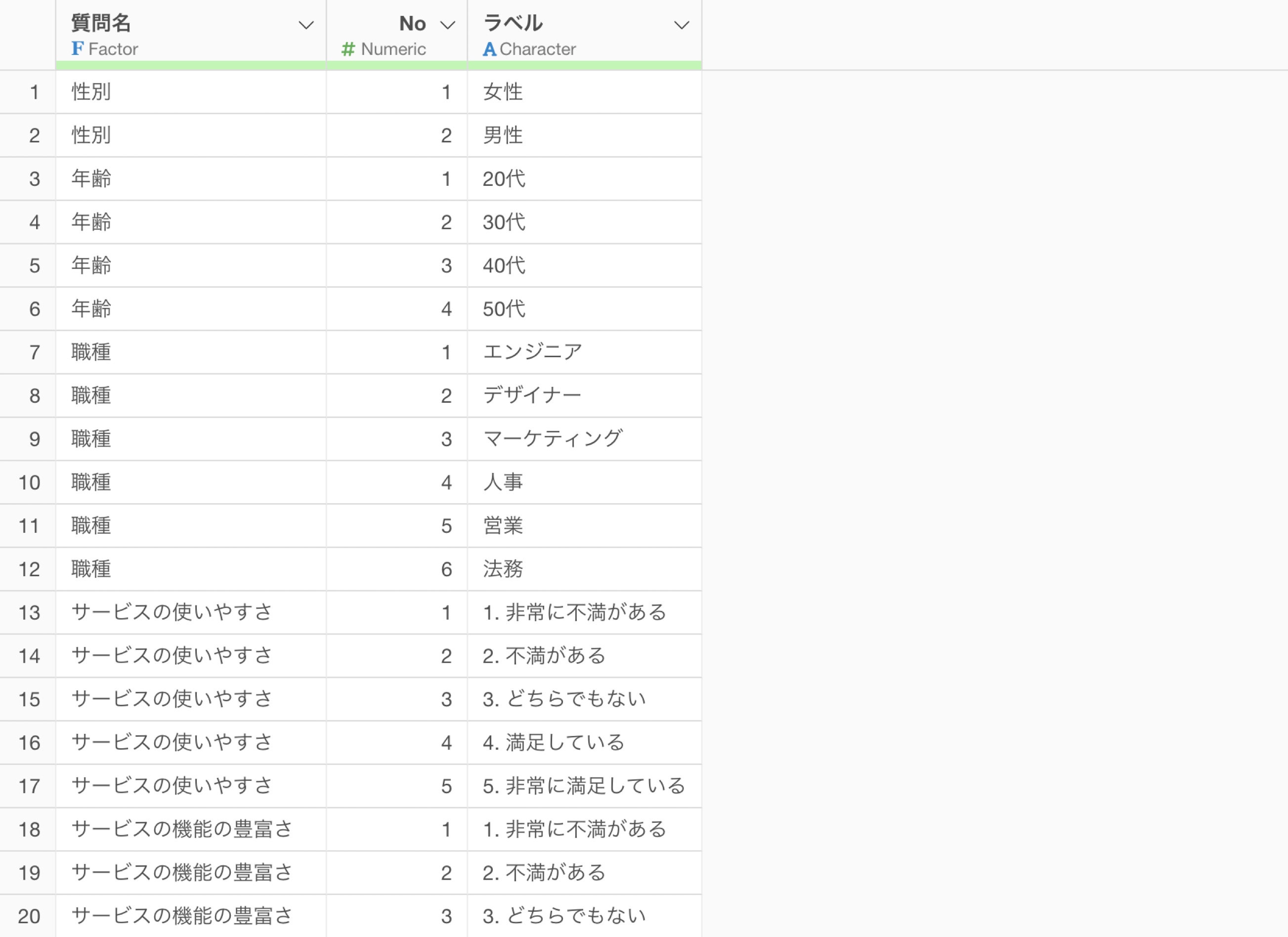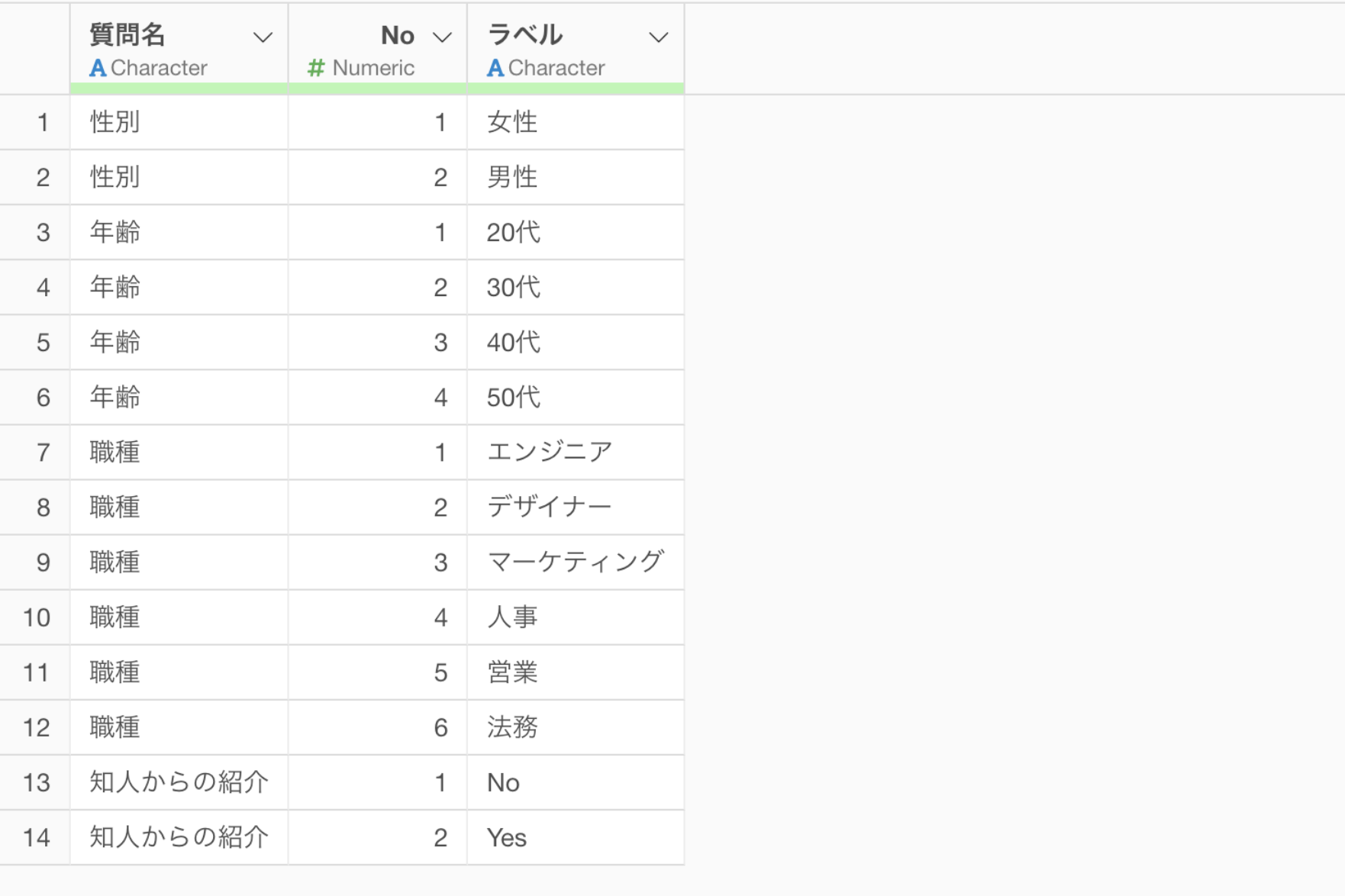もう一つマスタデータを持っており、こちらではそれぞれの回答コードに対応する回答ラベルのデータを持っています。