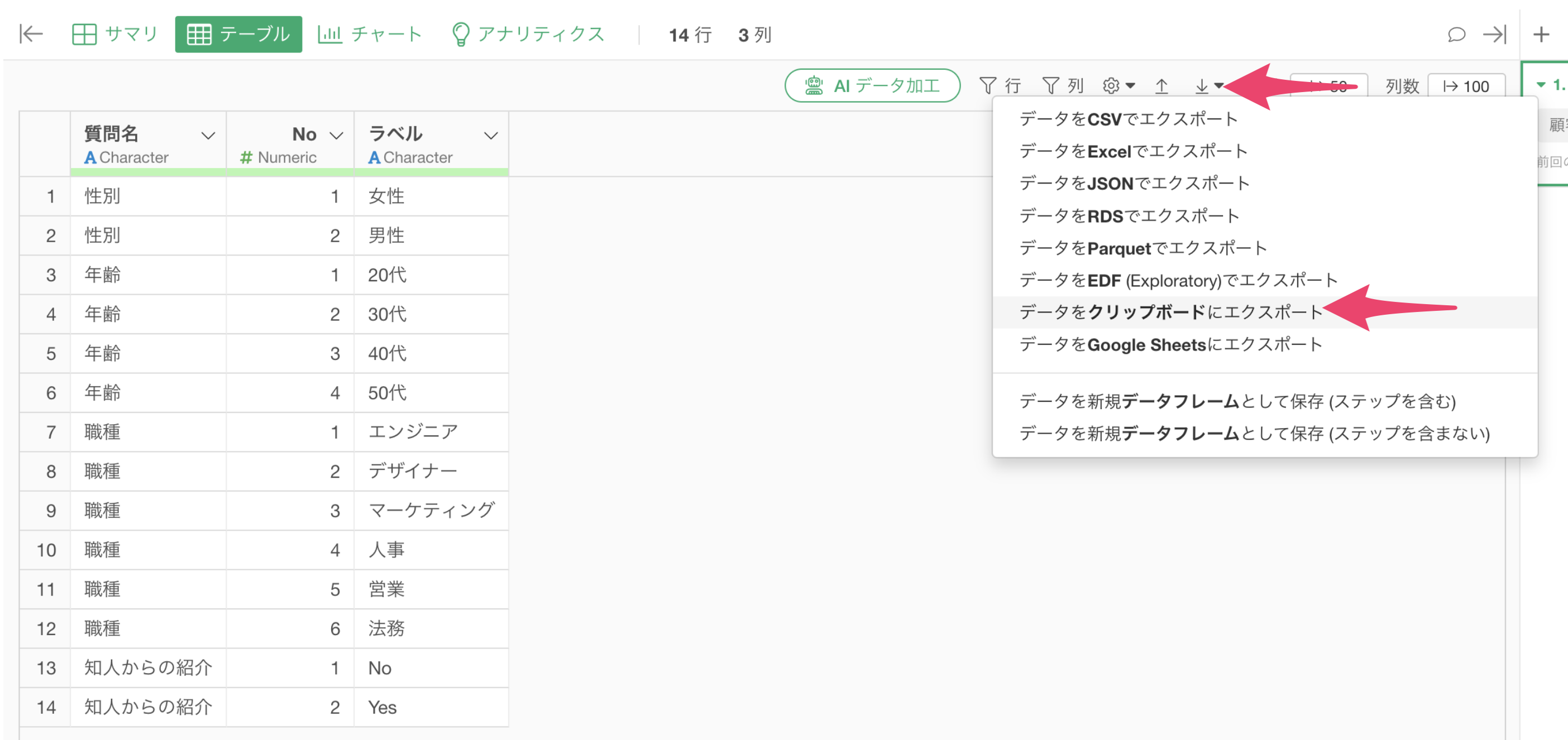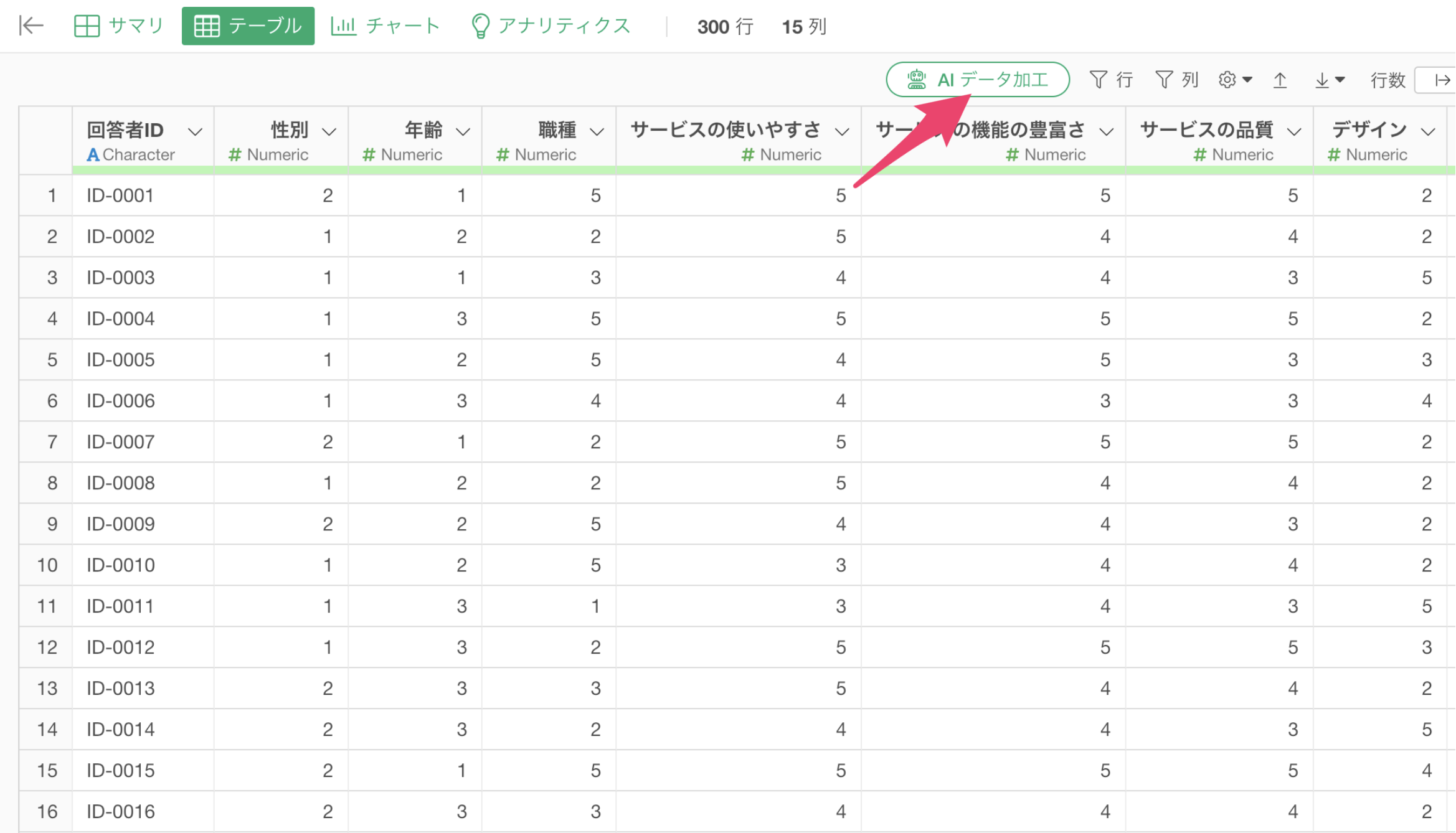 回答データのデータフレームを開き、「AI データ加工」をクリックする。