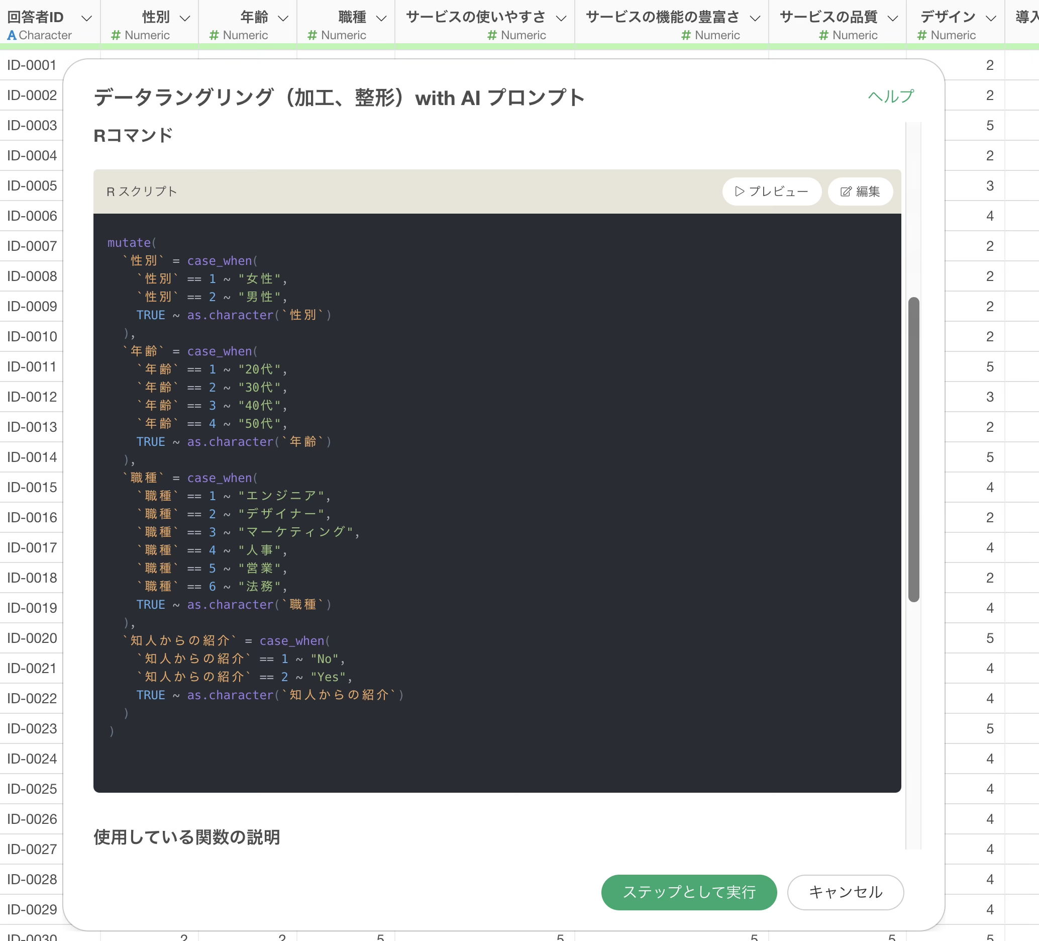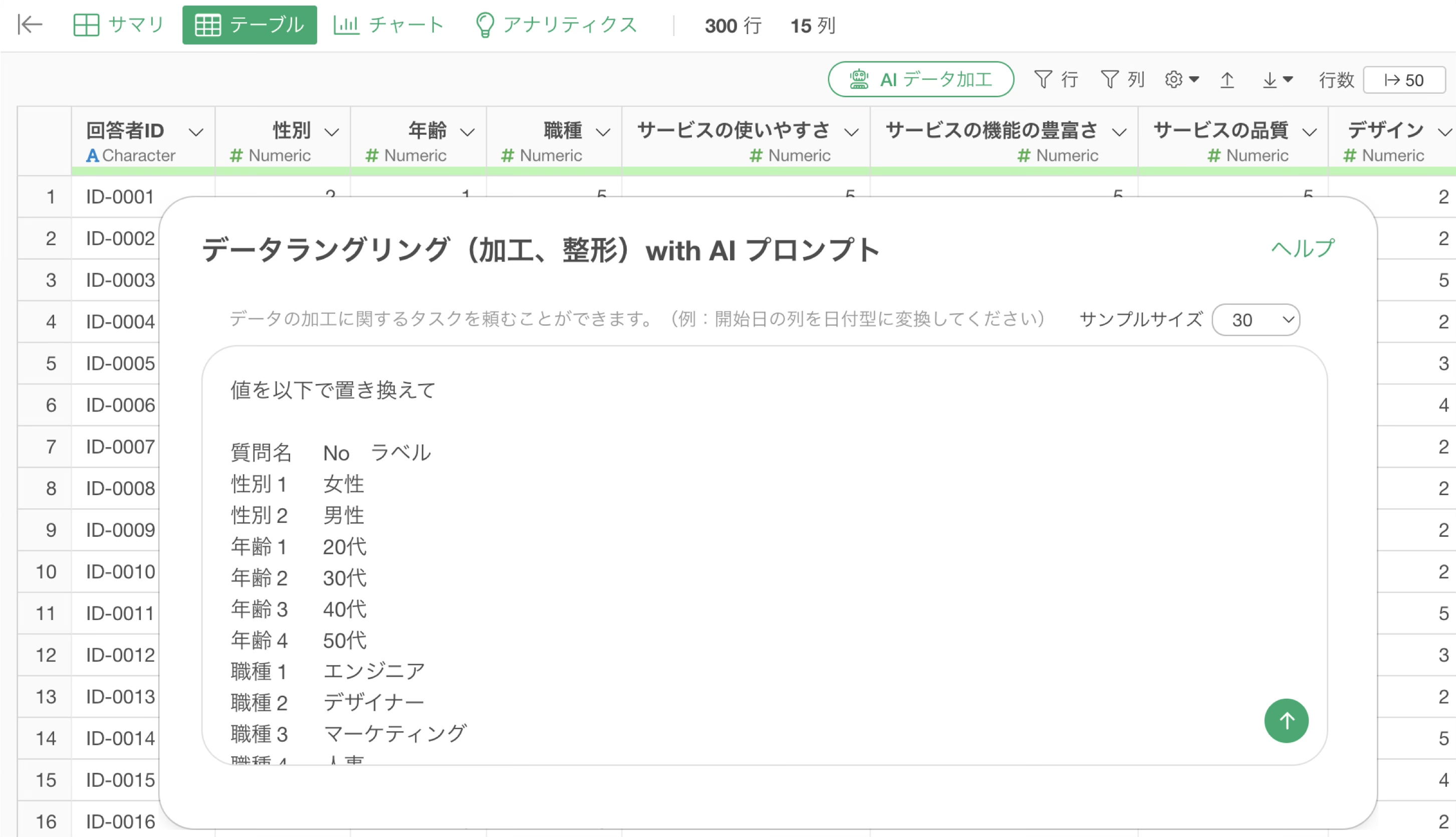 AI プロンプトを使うことで、UIのように複雑な処理をすることなく、簡単かつ素早く値のコードをラベルに変更していくことが可能です。