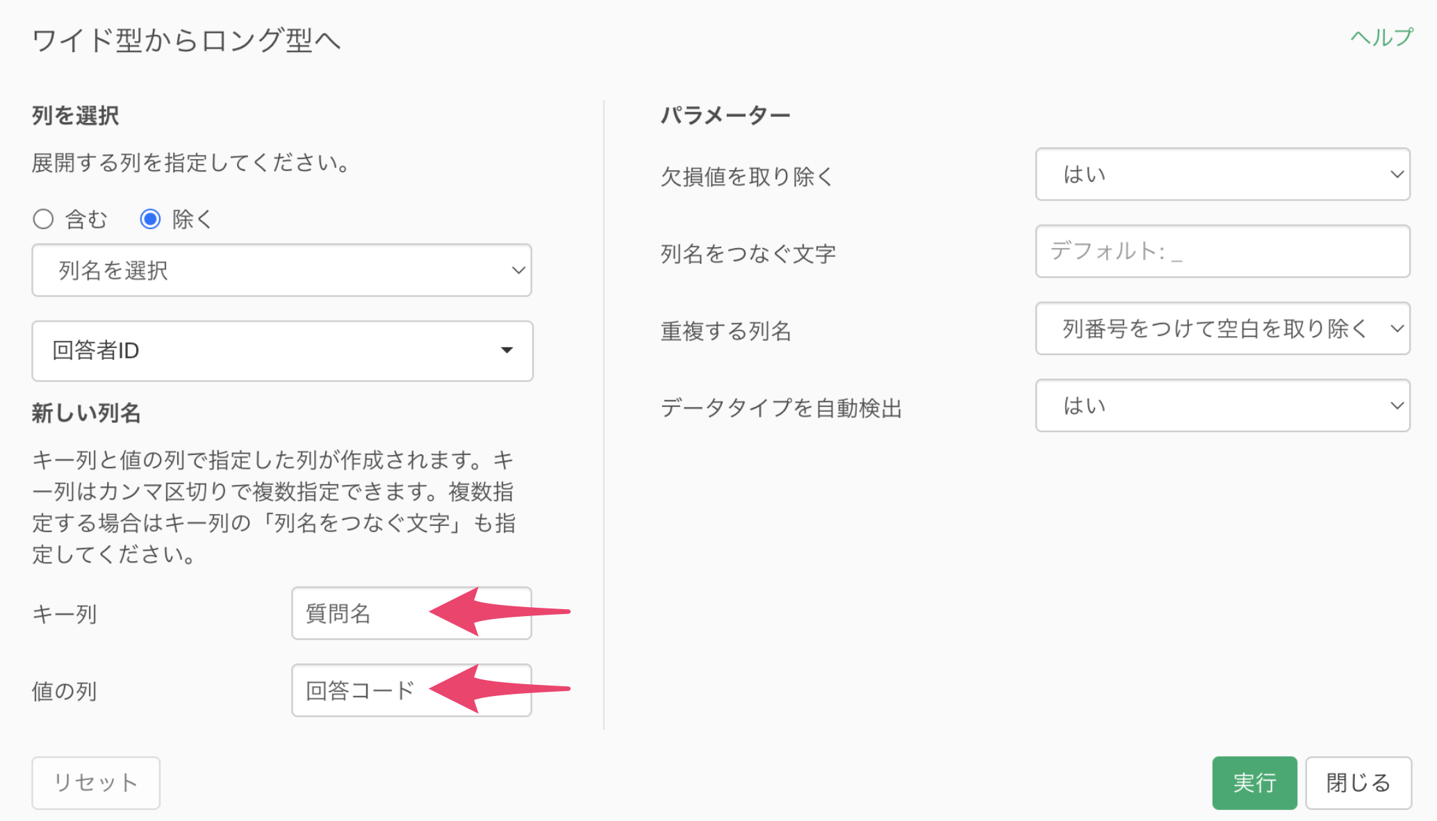 ワイド型からロング型へのダイアログが表示されるため、新しい列名には以下のように指定します。
