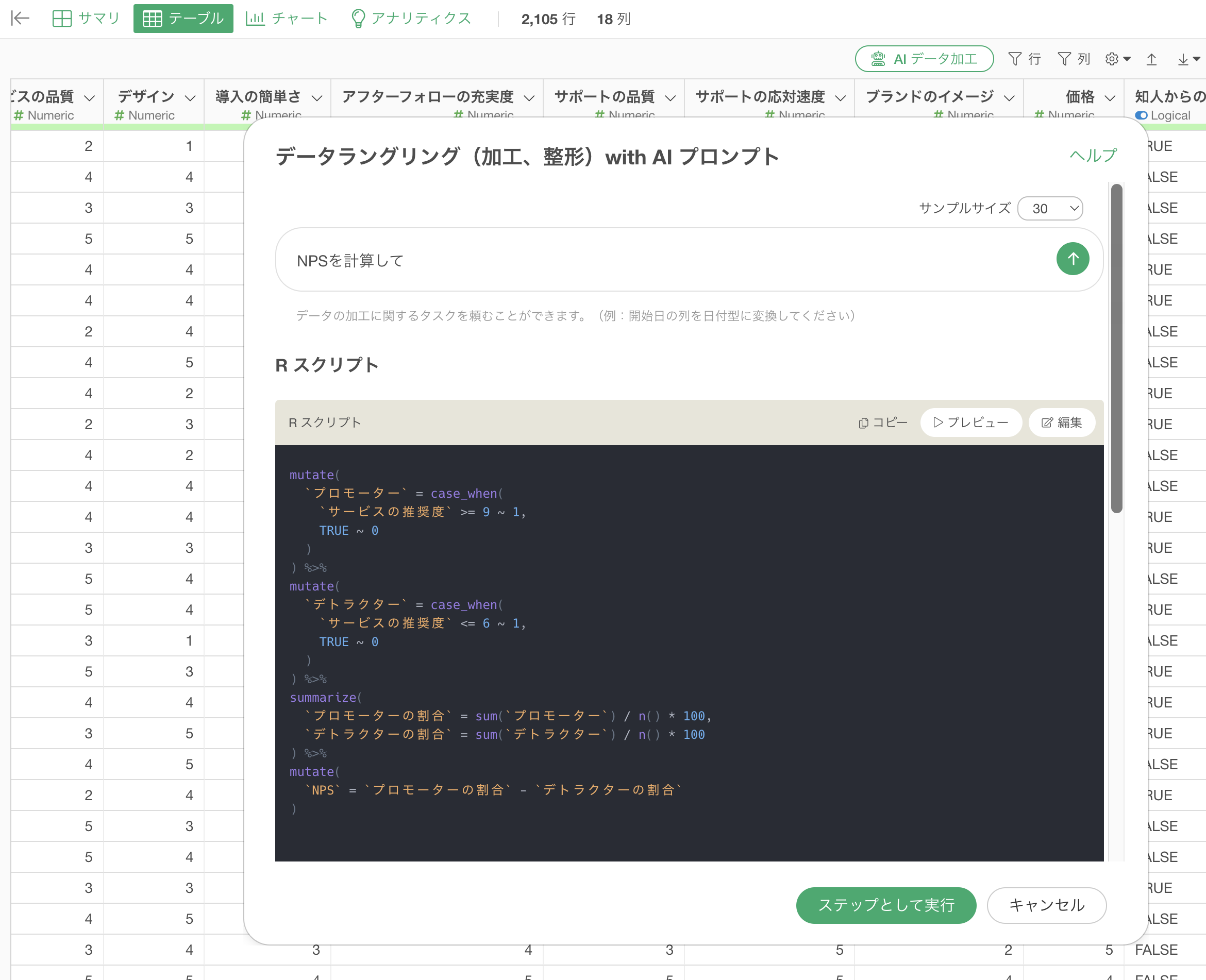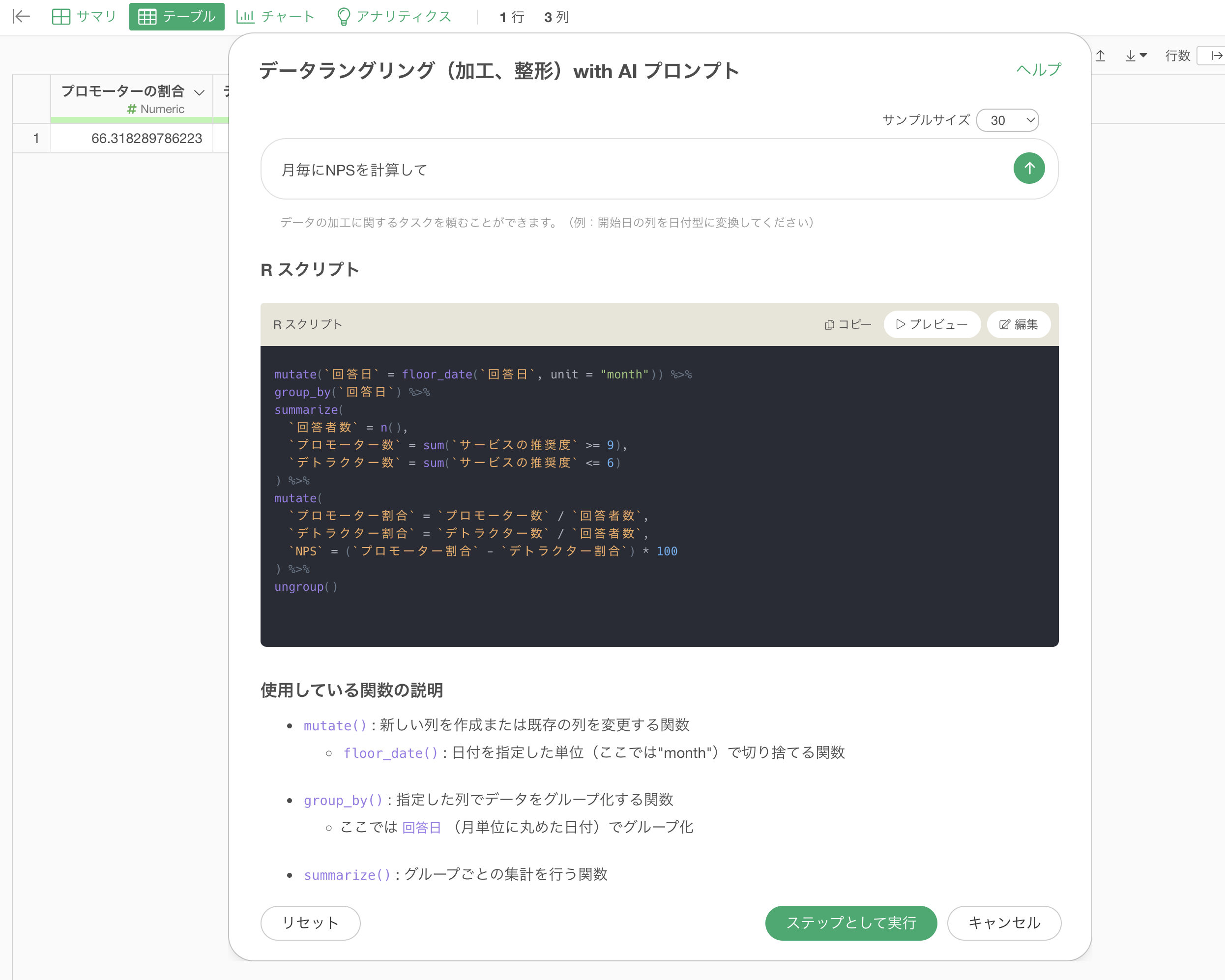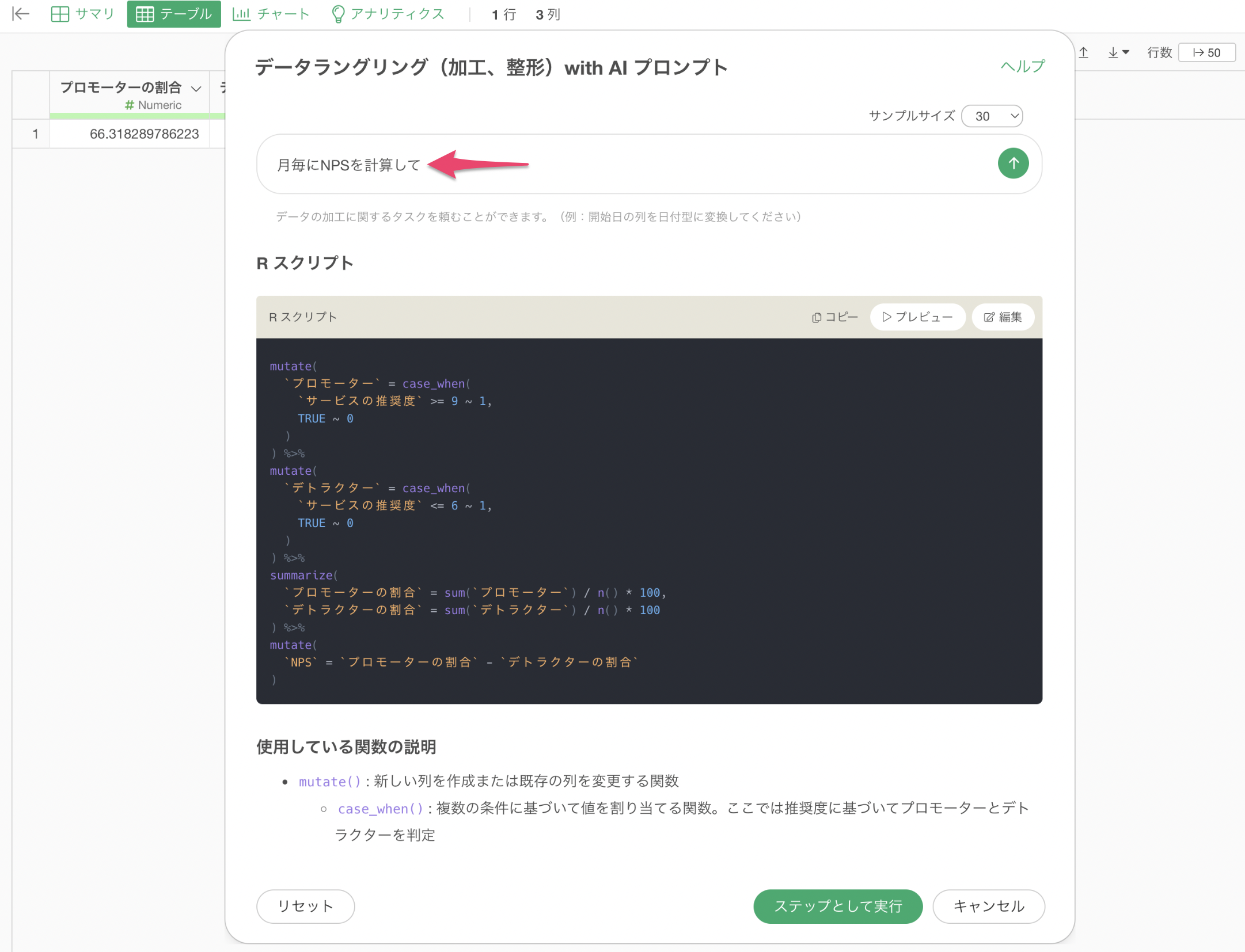 ここでは、ExploratoryのAI プロンプト機能を活用し、NPSを効率的に計算する方法について詳しく解説します。AI プロンプトを使用することで、この複雑な計算を簡単に行い、さらに月ごとのNPS推移を可視化する方法も紹介します。