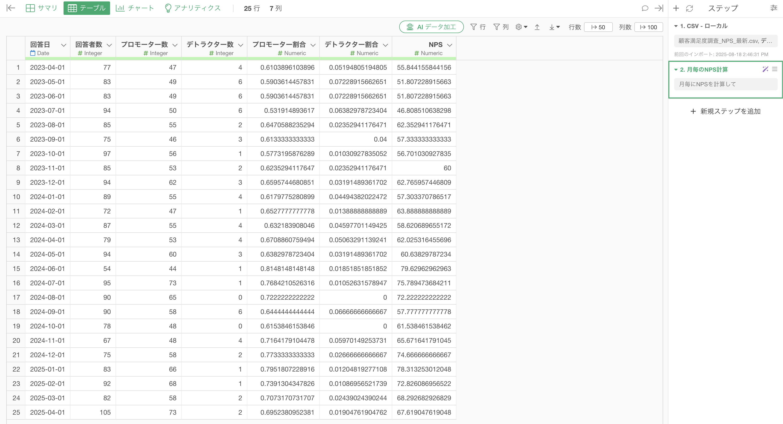 ステップとして実行することで、各月ごとのNPSが計算されたデータが生成されます。