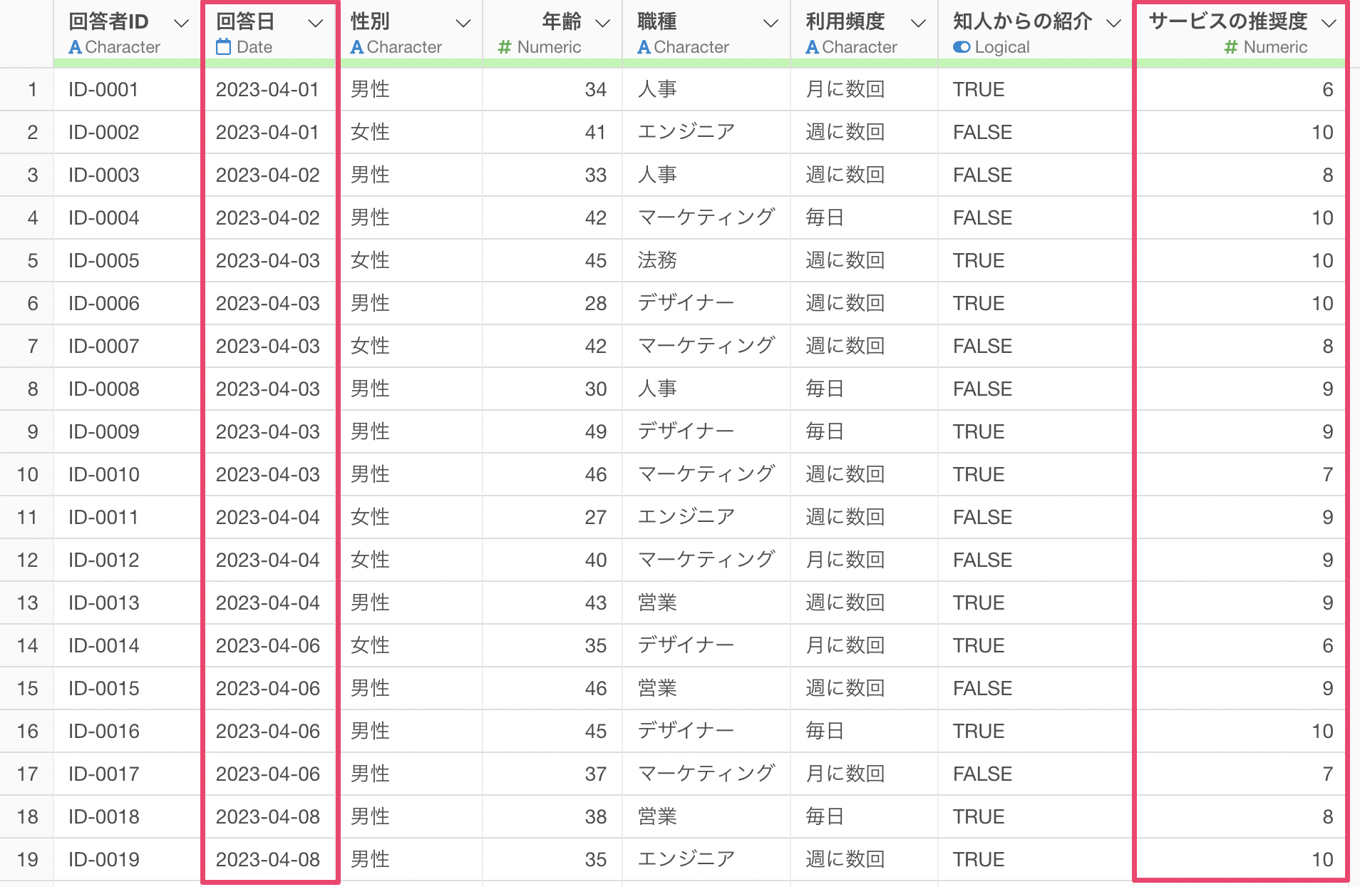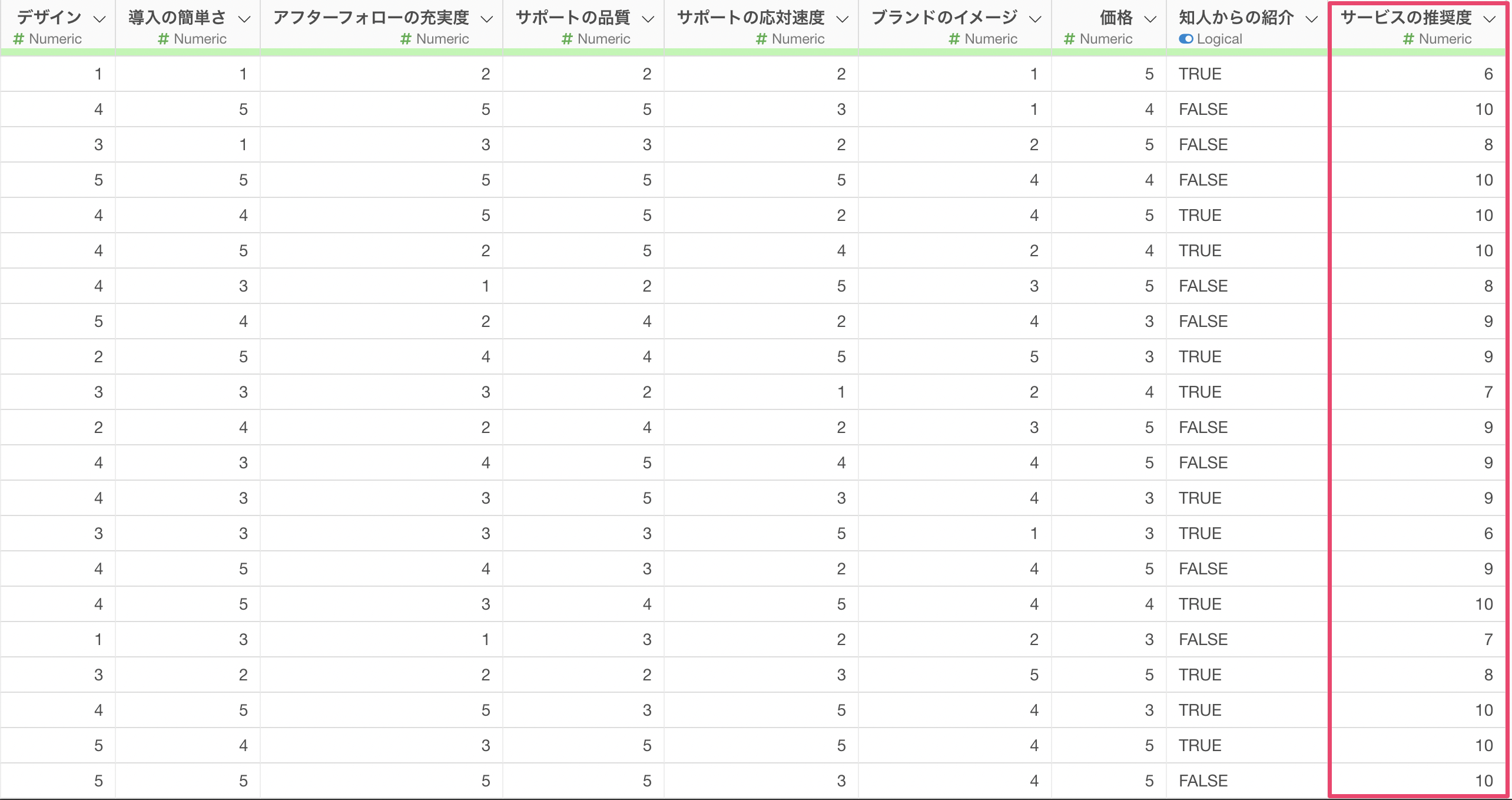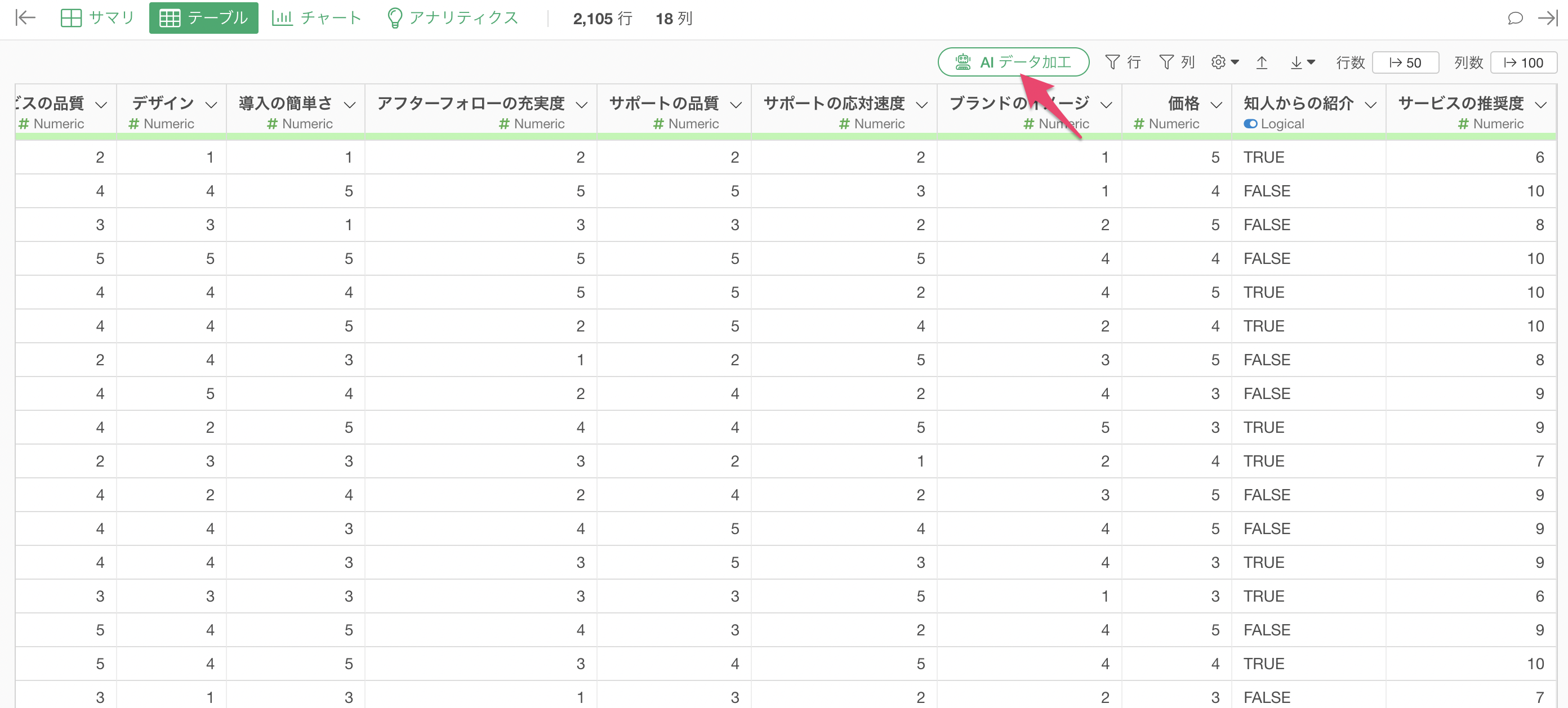 今回使用するデータは、1行が1回答者に対応し、各列にアンケートの質問項目が格納されています。特に「サービスの推奨度」という列は、NPSを計算するために使用される10段階評価の質問項目です。このデータを用いて、AIプロンプト機能を活用し、NPSを効率的に計算します。