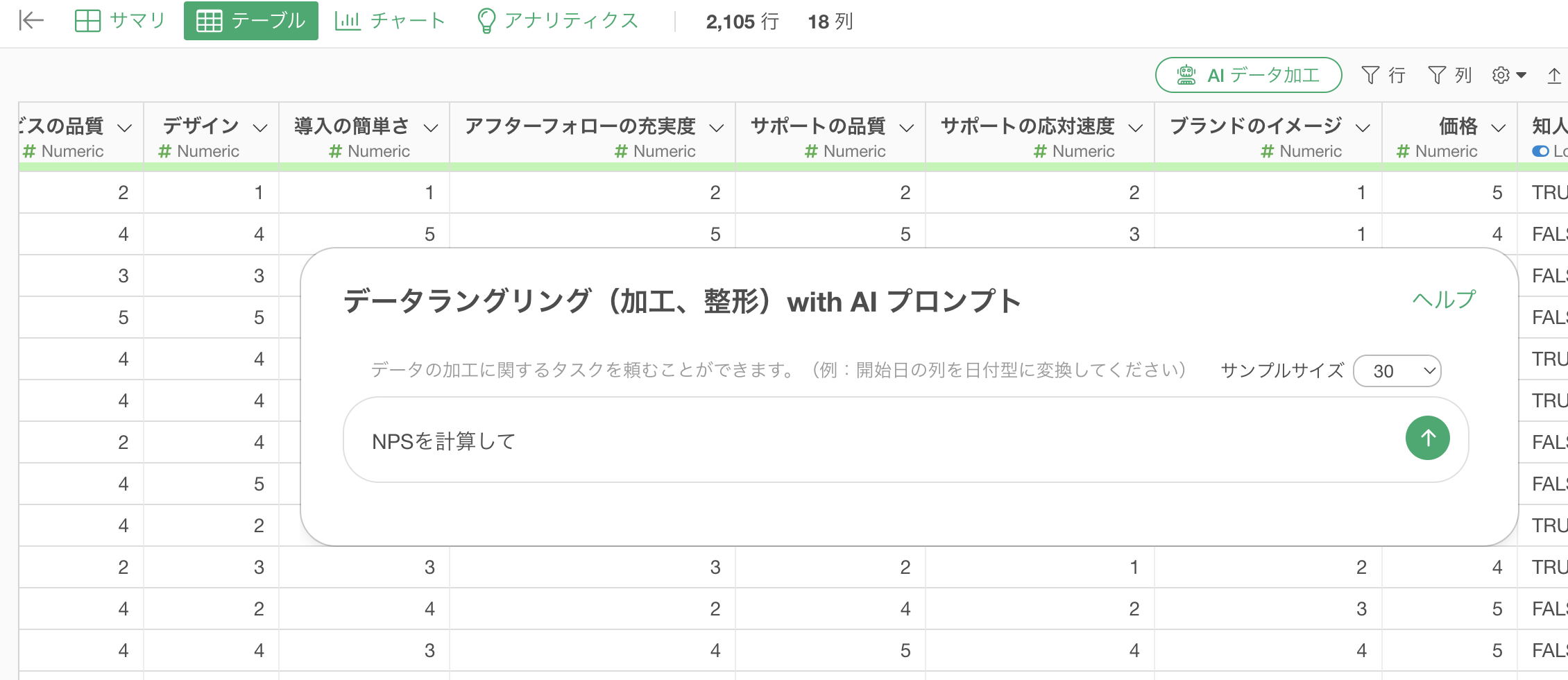AIは「サービスの推奨度」列を自動的にNPS計算に利用する列として認識します。もしAIが正しく列を認識しない場合は、プロンプトに「サービスの推奨度列を使ってNPSを計算して」のように、使用する列名を明示的に含める必要があります。