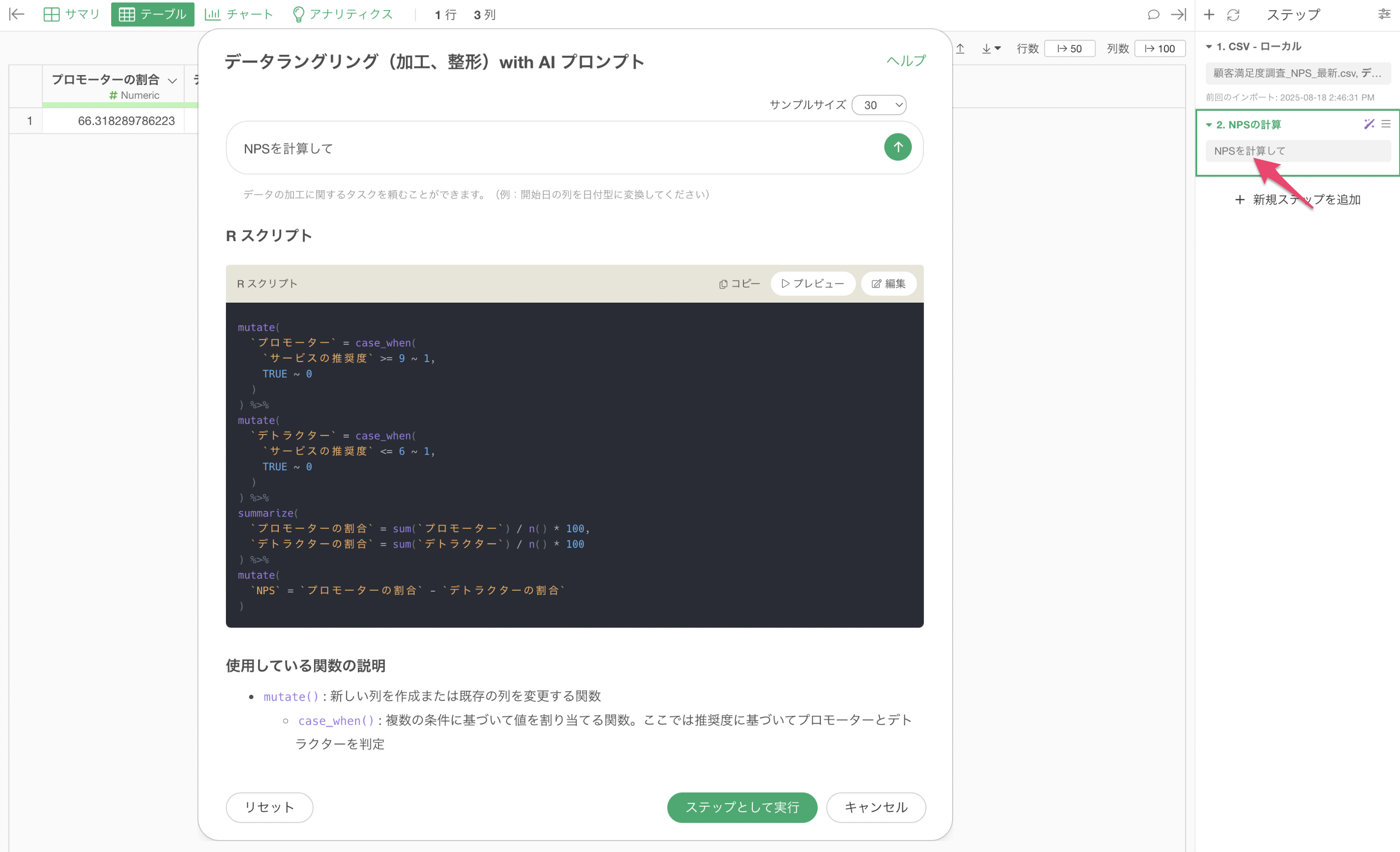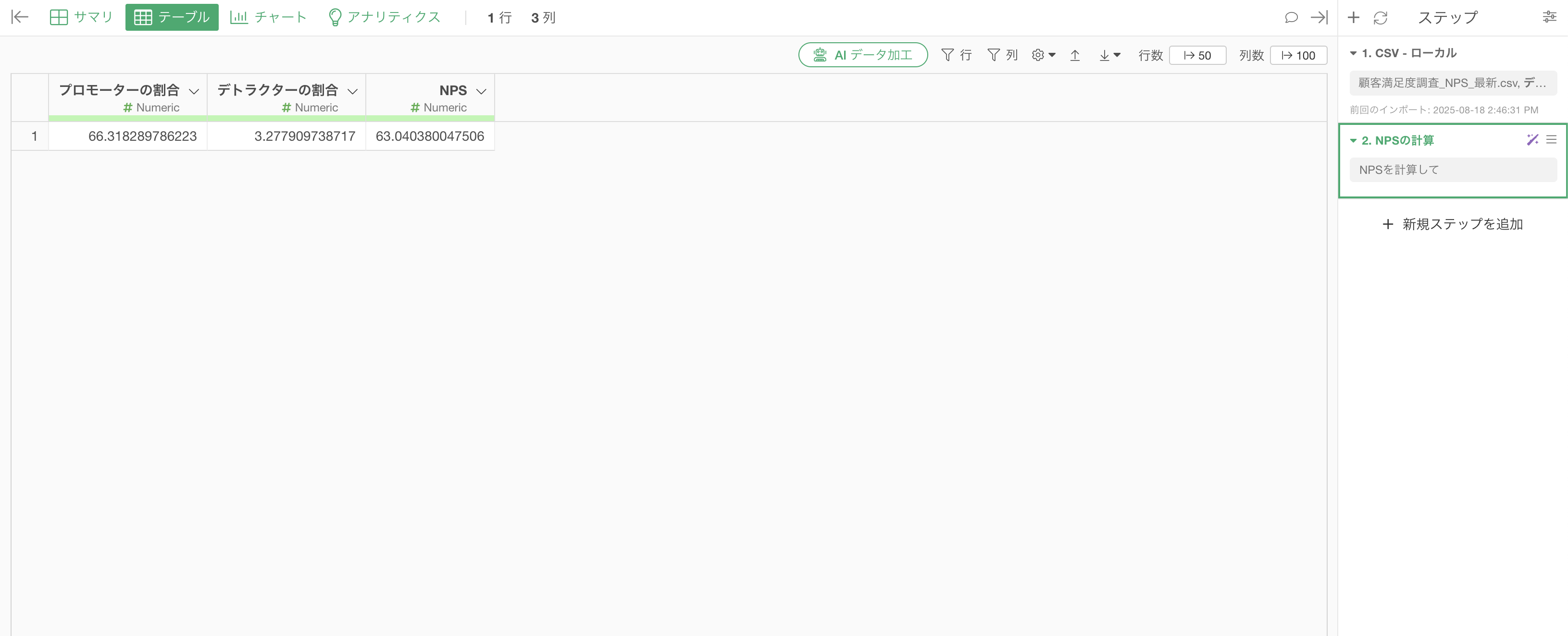 このステップを実行することで、データにNPS列が追加され、全体のNPSスコアを確認できます。