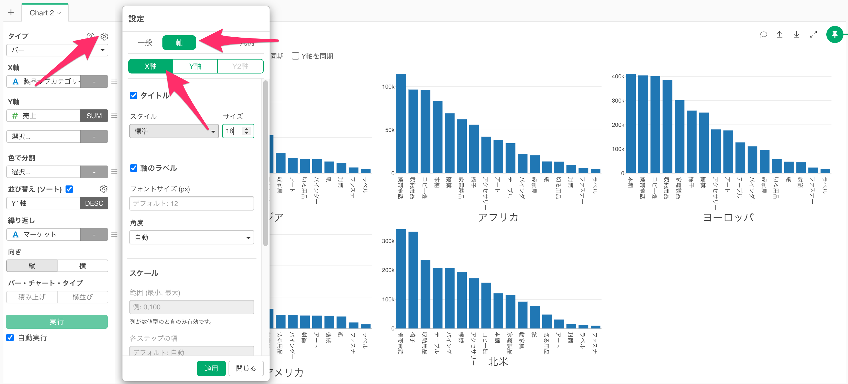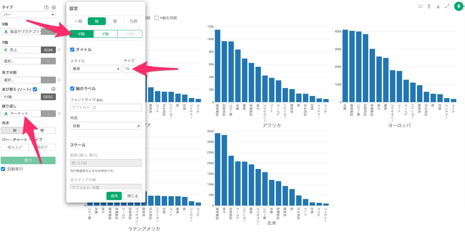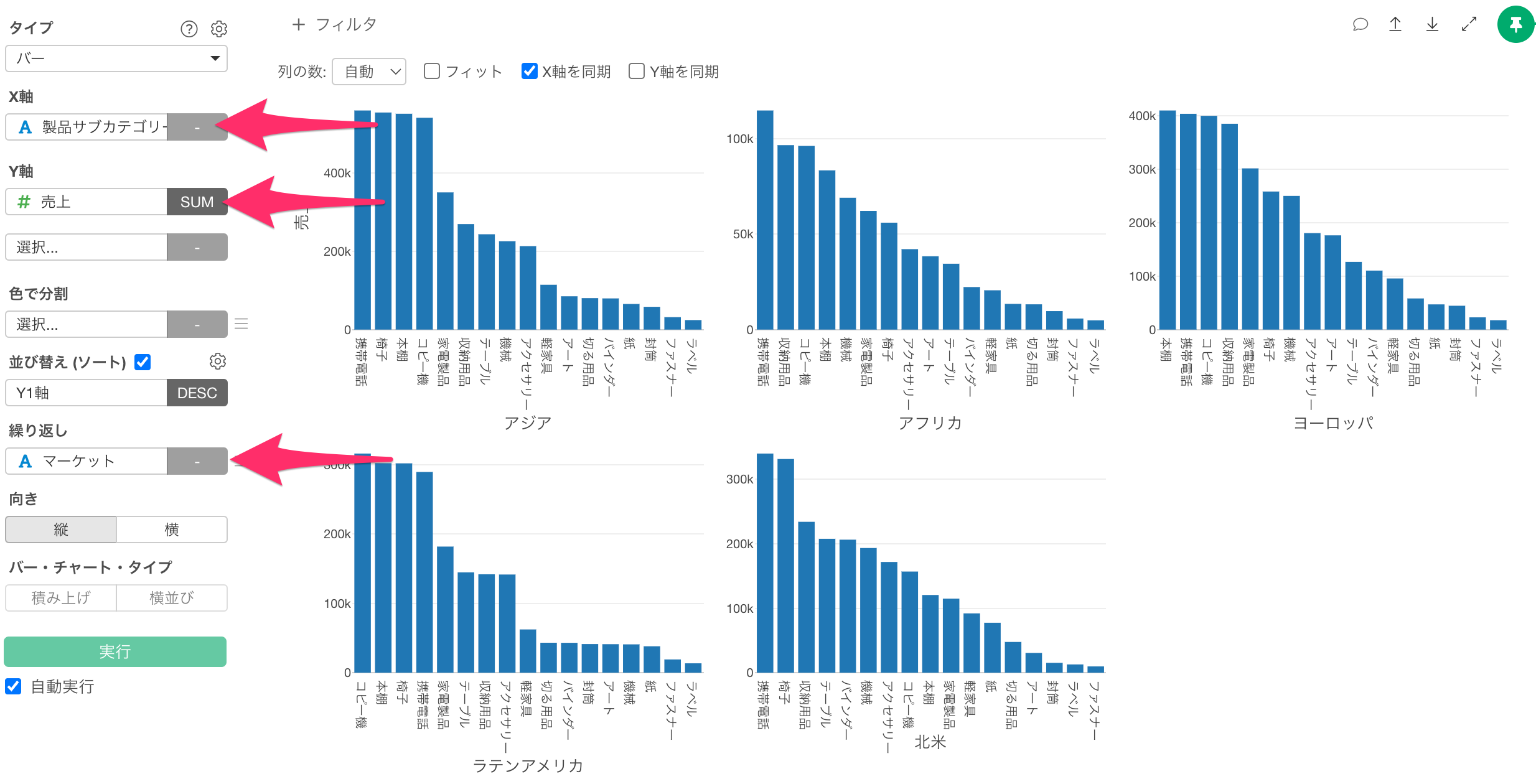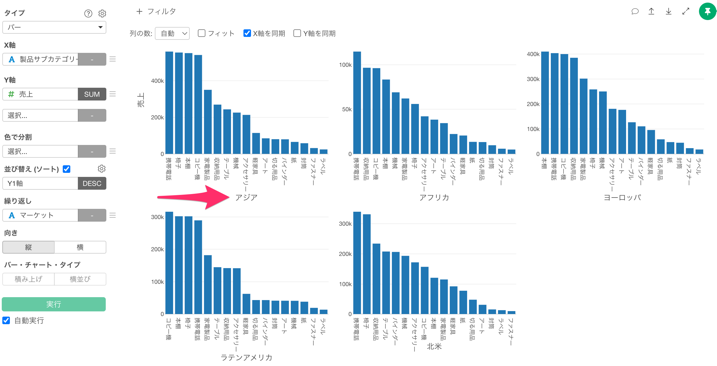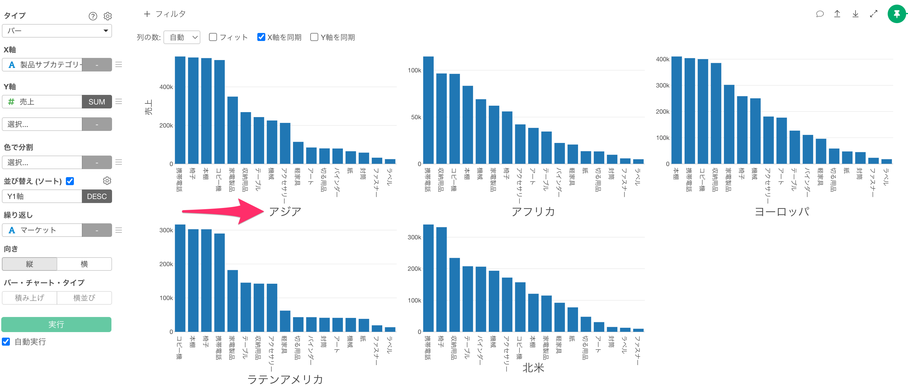 また今回は、あらかじめ、「繰り返し」を利用して、マーケットごとに製品サブカテゴリーごとの売上の合計値のバーチャートを作成しているので、こちらを使っていきます。