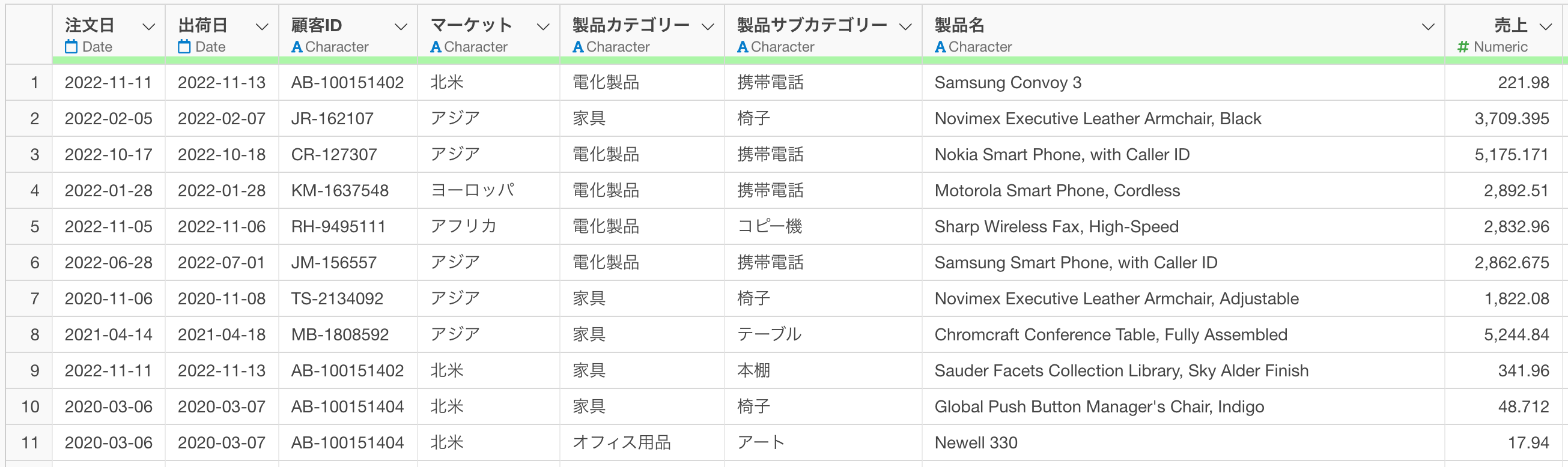 今回は1行が1つの注文を表し、列には顧客情報、注文日、製品サブカテゴリー、売上、マーケットなどの情報を持つデータを利用します。