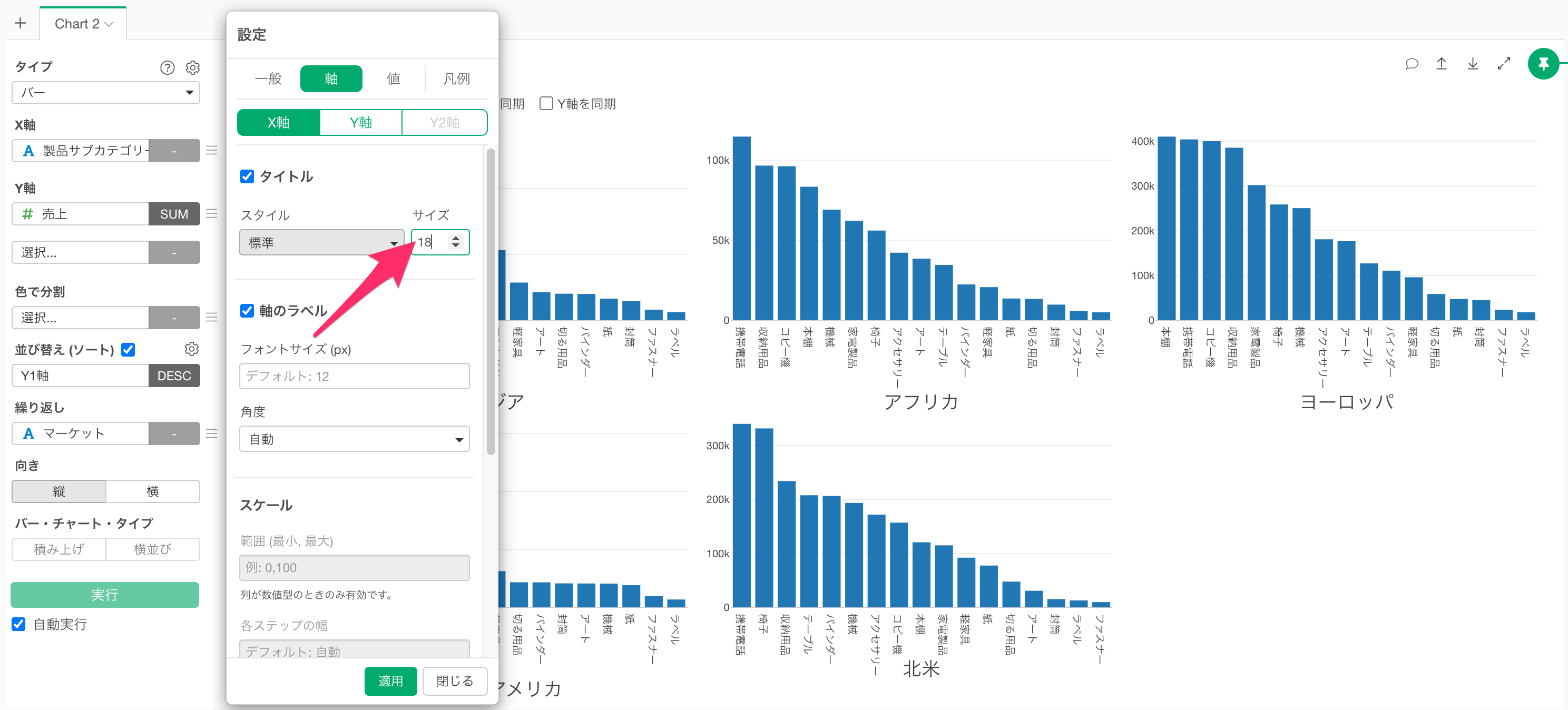 通常のチャートではX軸に列名が表示されますが、繰り返しを設定するとX軸の表示が繰り返しの各カテゴリー値に置き換わります。そのため、X軸のタイトル設定を変更することで、繰り返しラベルのフォントサイズやスタイルを調整できます。