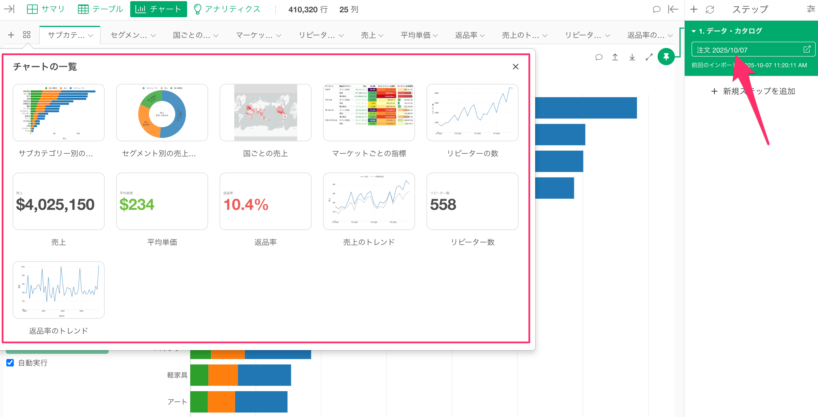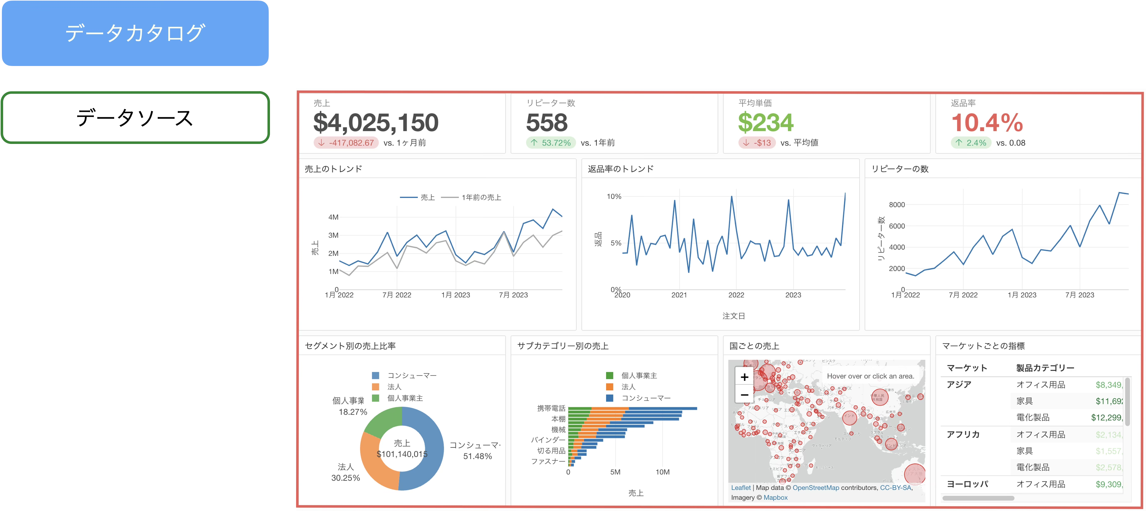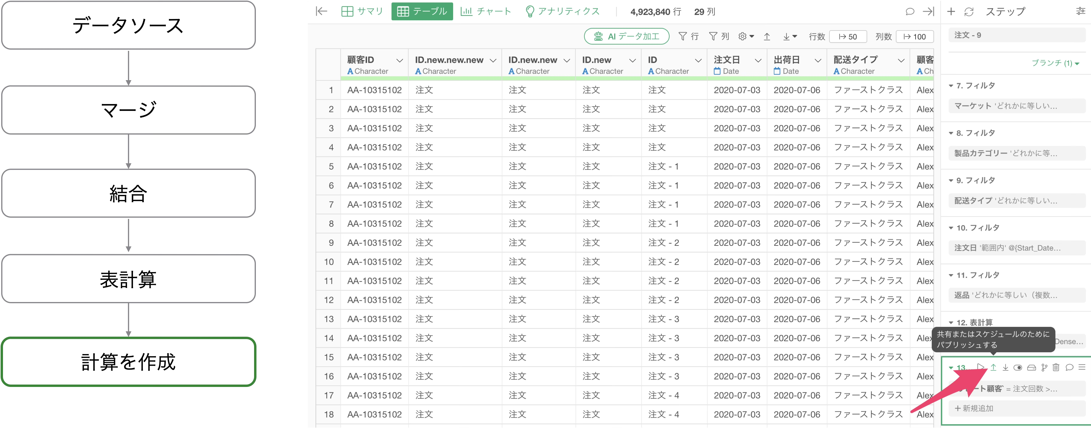 データカタログ機能を使用すると、データ加工済みのステップをサーバーにパブリッシュし、そのデータをダッシュボードのデータソースとして利用できます。これにより、ダッシュボード更新時にはデータ加工処理を実行する必要がなくなり、大幅な処理時間の短縮が可能になります。